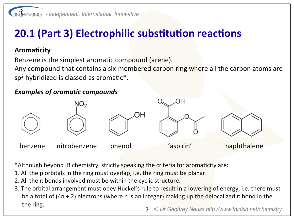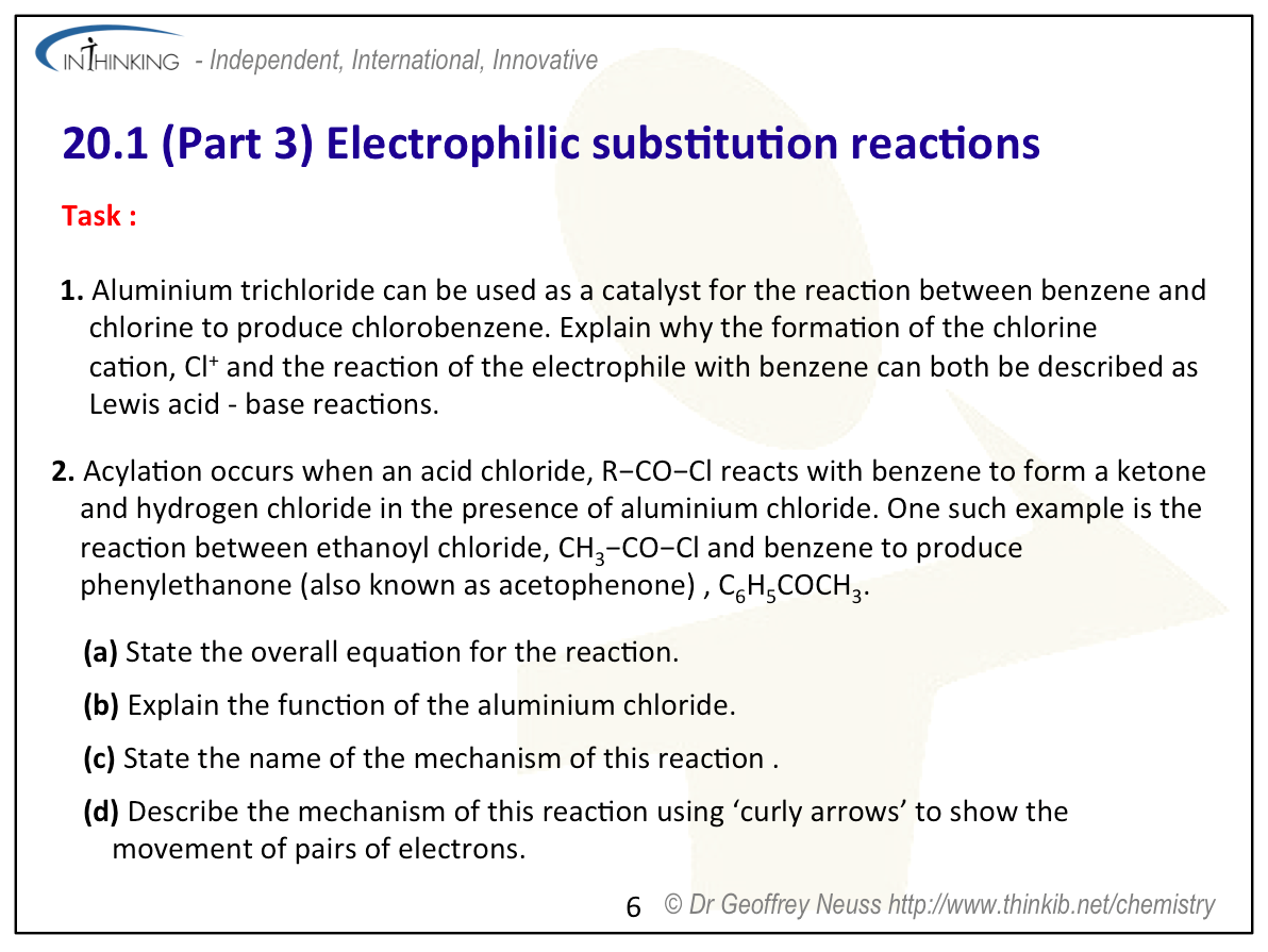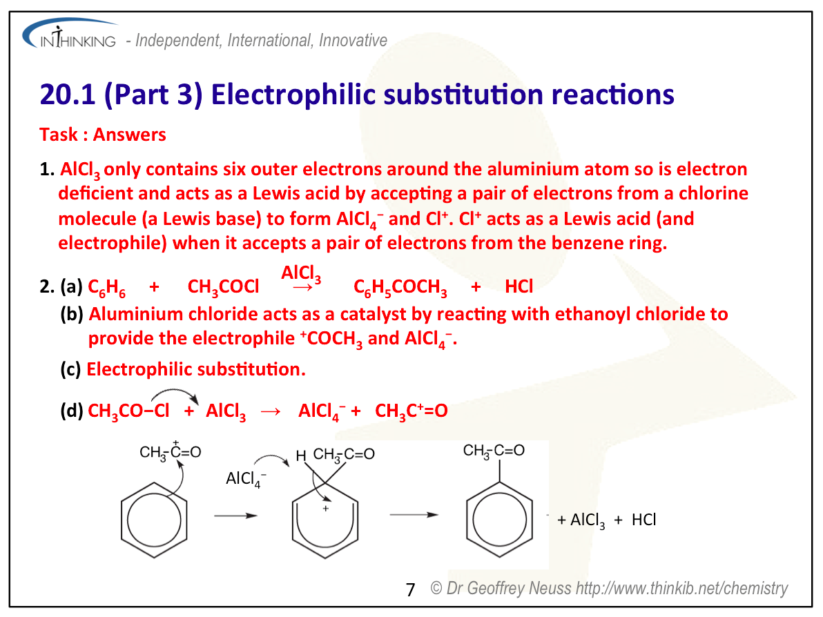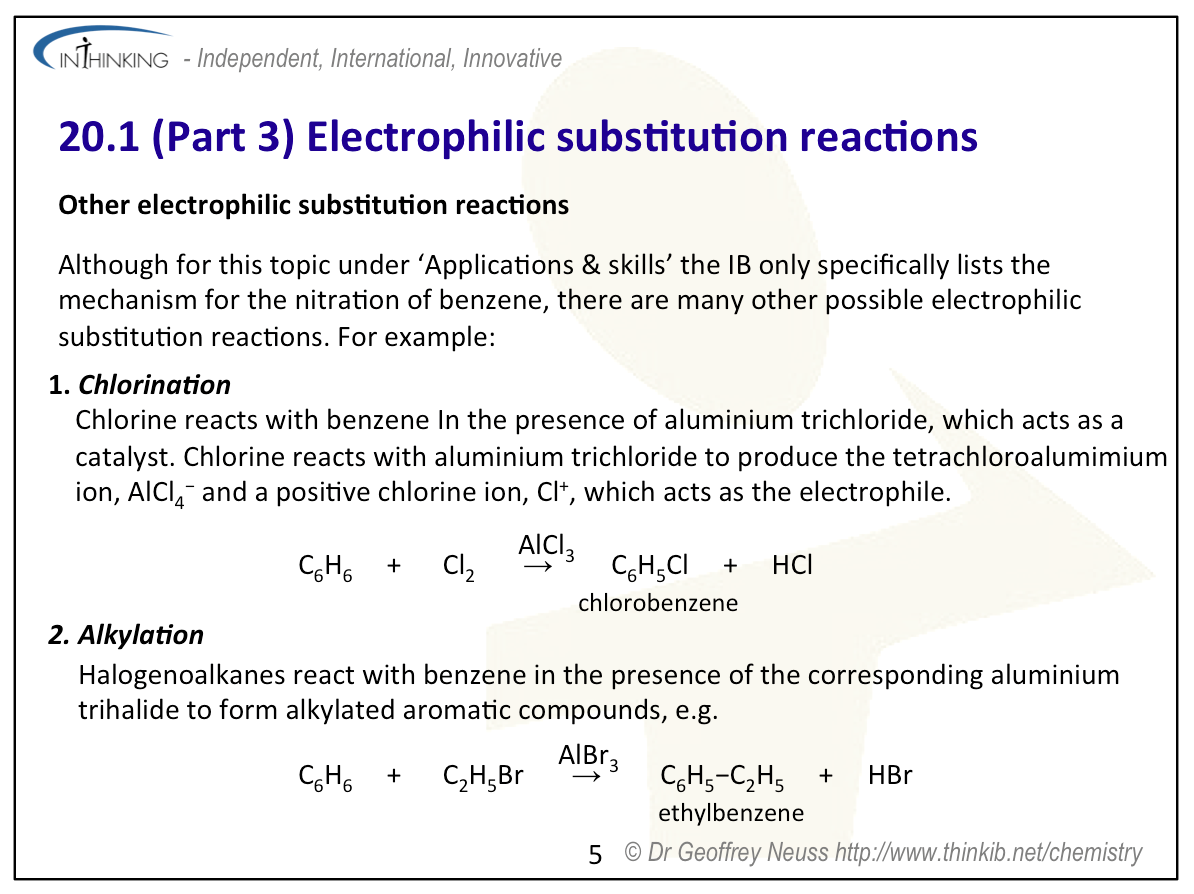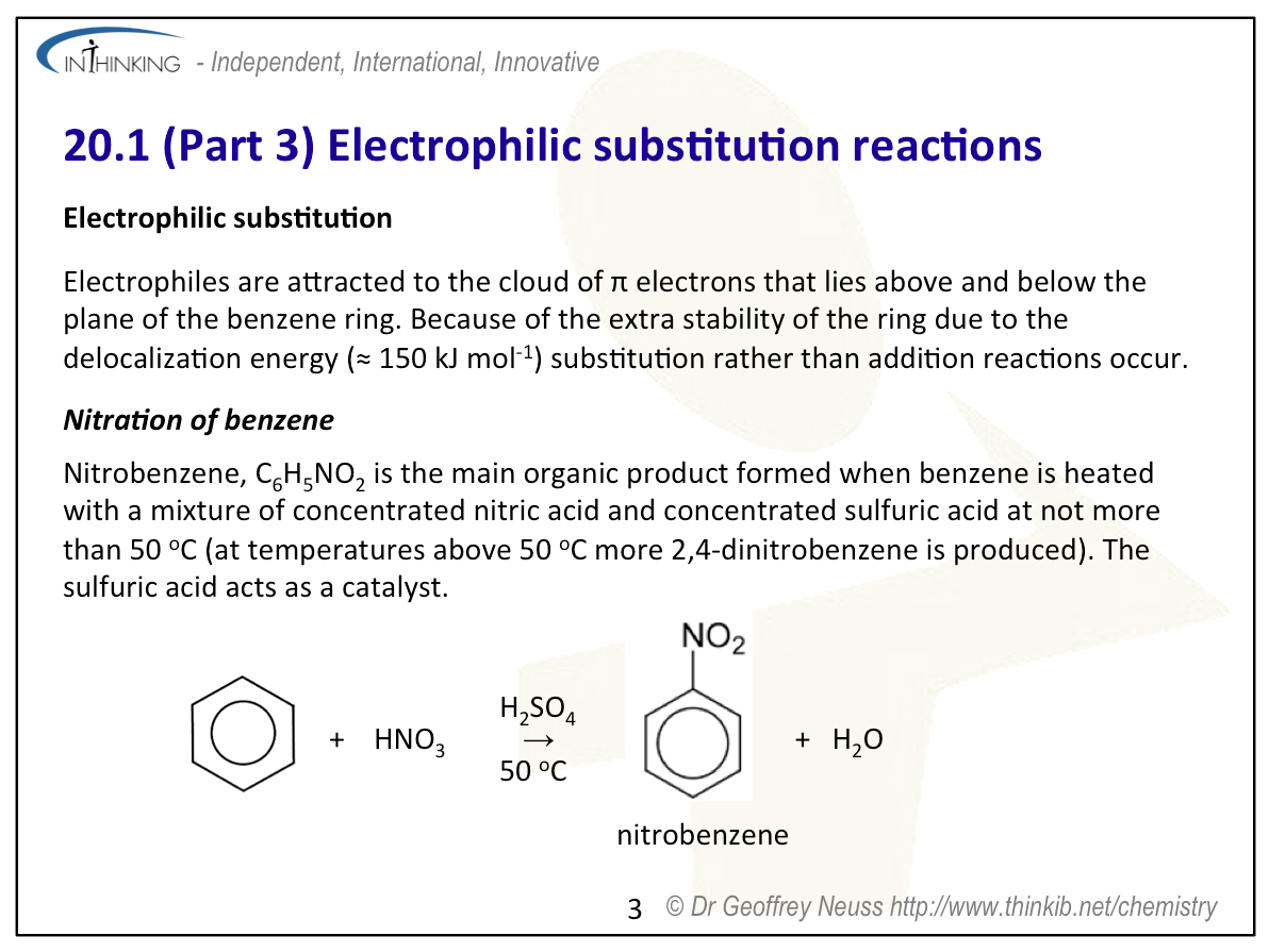Page 92 QuestionsFor ten 'quiz' multiple choice questions with the answers explained see MC test: Electrophilic addition & substitution reactions. Note that this quiz also includes questions on electrophilic addition as both form part of Topic 20.1. For short-answer questions which can be set as an assignment for a test, homework or given for self study together with model answers see Electrophilic substitution questions. Vocabulary listarene IM, TOK, Utilization etc.See separate page which covers all of Topics 10 & 20. Practical work |