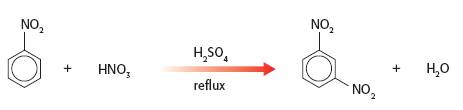 The product nitrobenzene, C6H5NO2, is less reactive towards further nitration as the nitro- group is electron withdrawing making the benzene ring less susceptible to attack by electrophiles. This practical starts with pure nitrobenzene and in order for the reaction to occur it needs to be heated under reflux for at least twenty minutes.