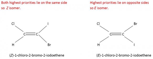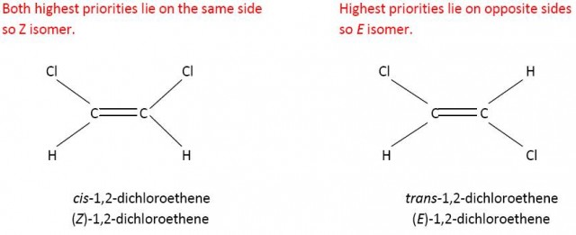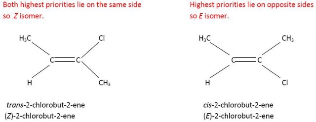 However Z does not always equate to cis-. If you consider 2-chloro-but-2-ene then the carbon atom of the methyl group has priority over the hydrogen atom on one side of the double bond but because chlorine has a higher atomic number than carbon the chlorine atom has priority over the methyl group on the other side of the double bond. Now the cis- isomer is the E isomer and the trans-isomer is the Z isomer.