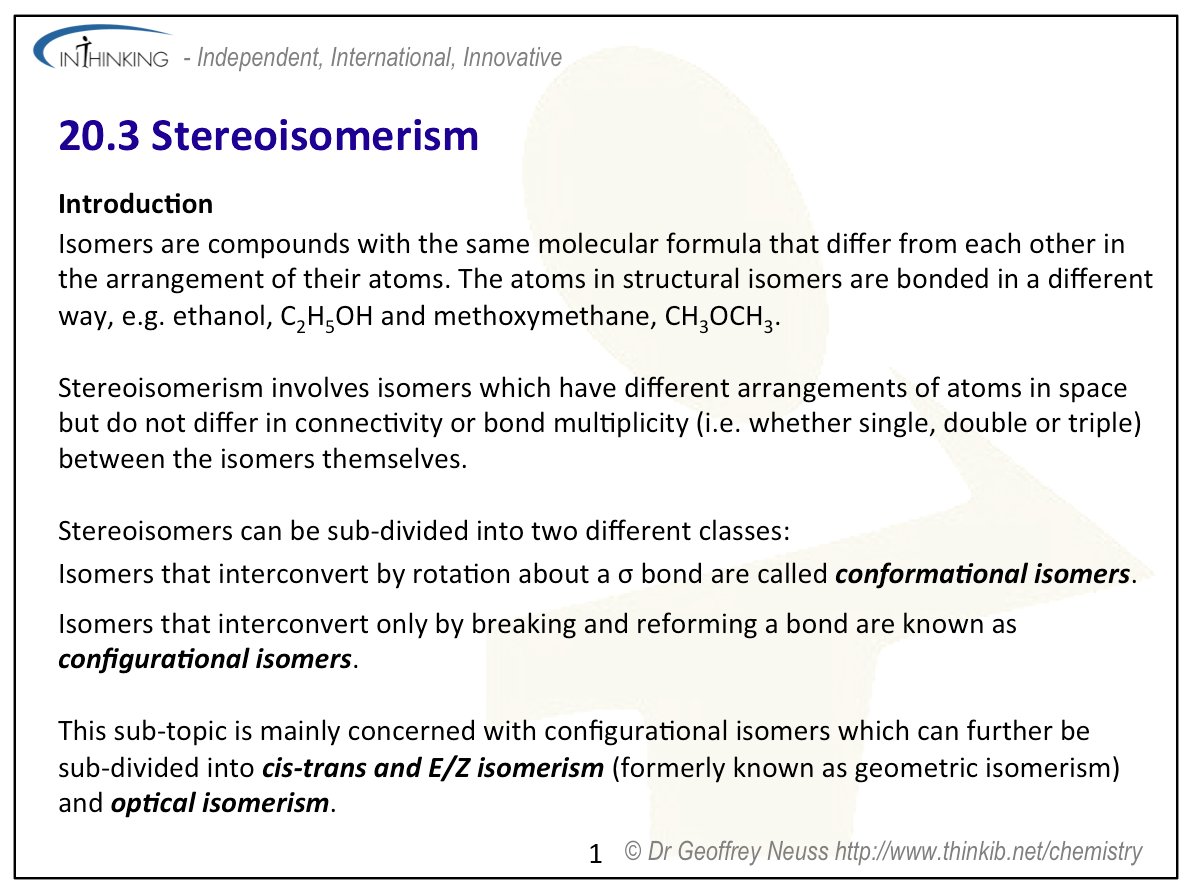 The IB now distinguishes between conformational isomers and configurational isomers. However as conformational isomers exist in dynamic equilibrium their individual properties cannot easily be studied so this sub-topic is really only concerned with configurational isomers. These were formally sub-divided into geometric and optical isomers but the use of the term geometric isomers is no longer recommended.