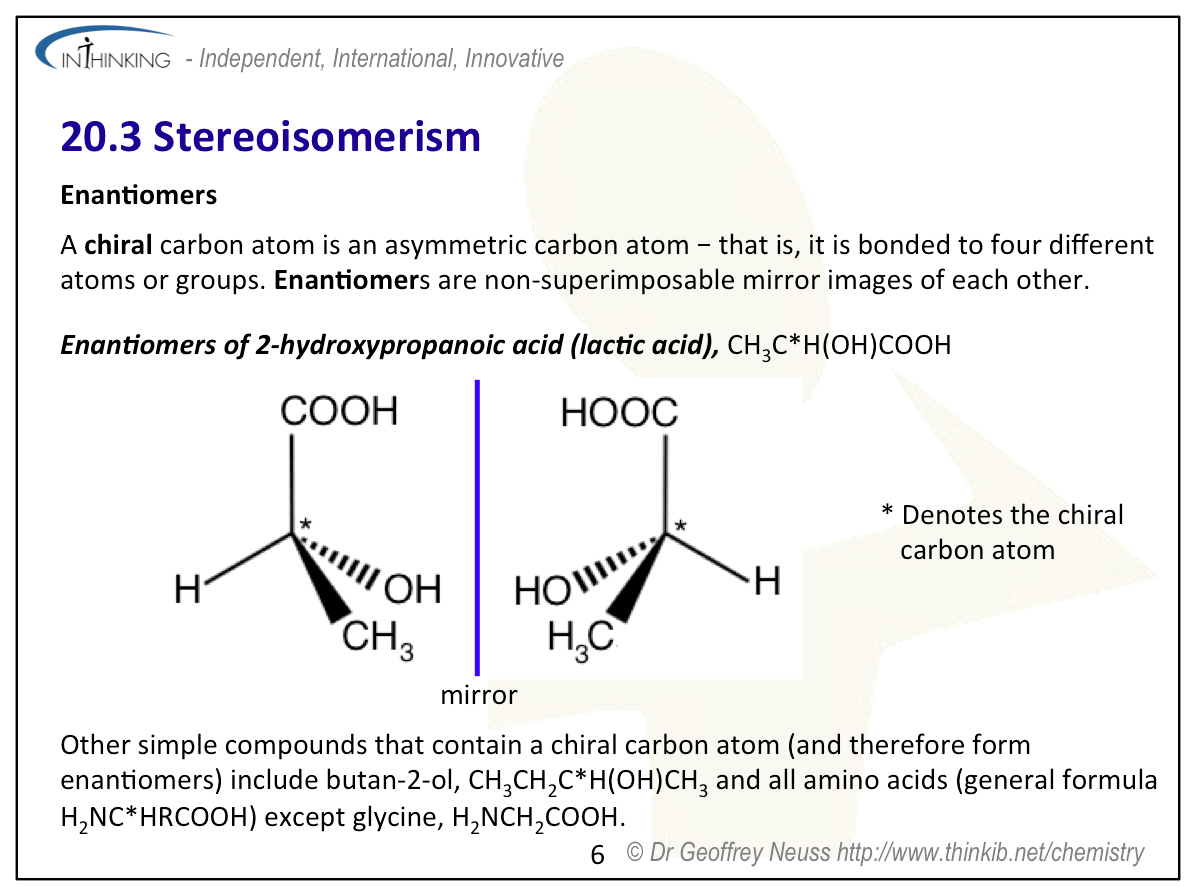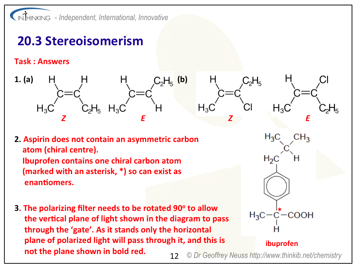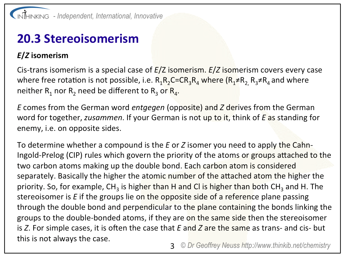 Teaching tipsIt is well worth each student, or pair of students, having access to a modelling set (e.g. Molymod) whilst teaching this topic. Virtual models can be useful but when they appear on a flat screen they are still 3-D being represented in two dimensions. Apart from knowing of its existence and why it occurs there is not very much that can be covered on conformational isomerism. It is probably worth getting students to make a 3-D model of butane and they can see how the two end methyl groups lie in different planes as the bond between the second and third carbon atoms is rotated. The isomers can be detected by infrared spectroscopy and the dynamics can be studied using NMR spectroscopy but this is beyond the syllabus. Give students plenty of practice at labelling different alkenes according to whether they are the E or Z form and emphasise how using E/Z is superior to cis/trans and the fact that the Z form is not always the cis form (or the E form is not always the trans form). Because there is a lot of human interest and it illustrates how profit can override ethical considerations it is worth students knowing about the thalidomide story to show the importance of enantiomers. Amino acids, 2-hydroxypropanoic acid and butan-2-ol are classic examples to use to illustrate chiral compounds but you can use many of the molecules given in Sections 33 and 37 of the data booklet as examples too. Make sure students can use the wedge and dotted line convention when making representations of enantiomers to show clearly mirror images. It can be difficult to know how much to do on diastereomers. It is probably worth showing how they can arise and stress that they can have different physical and chemical properties. There is a good article on this by UC Davis Chem Wiki. | Study guide