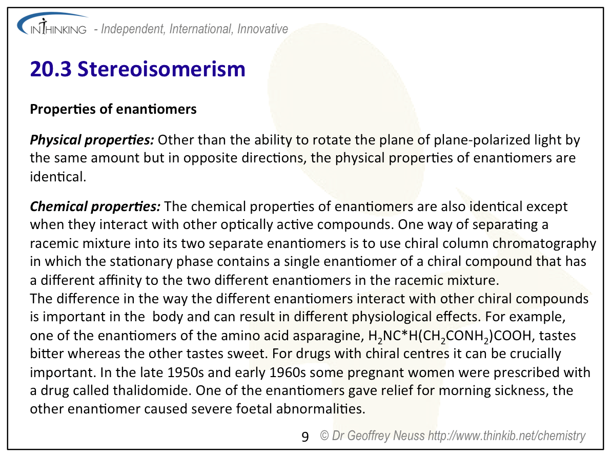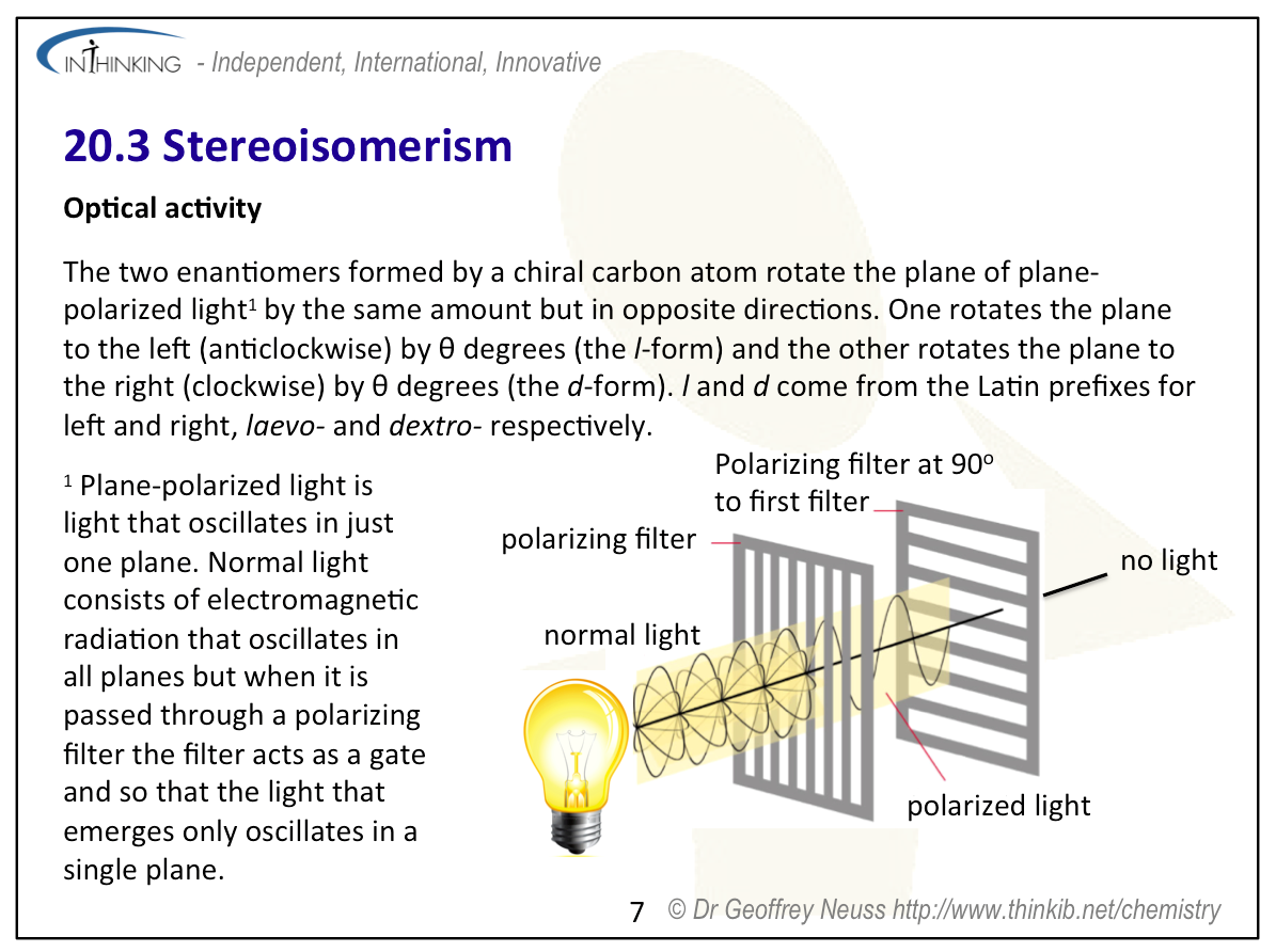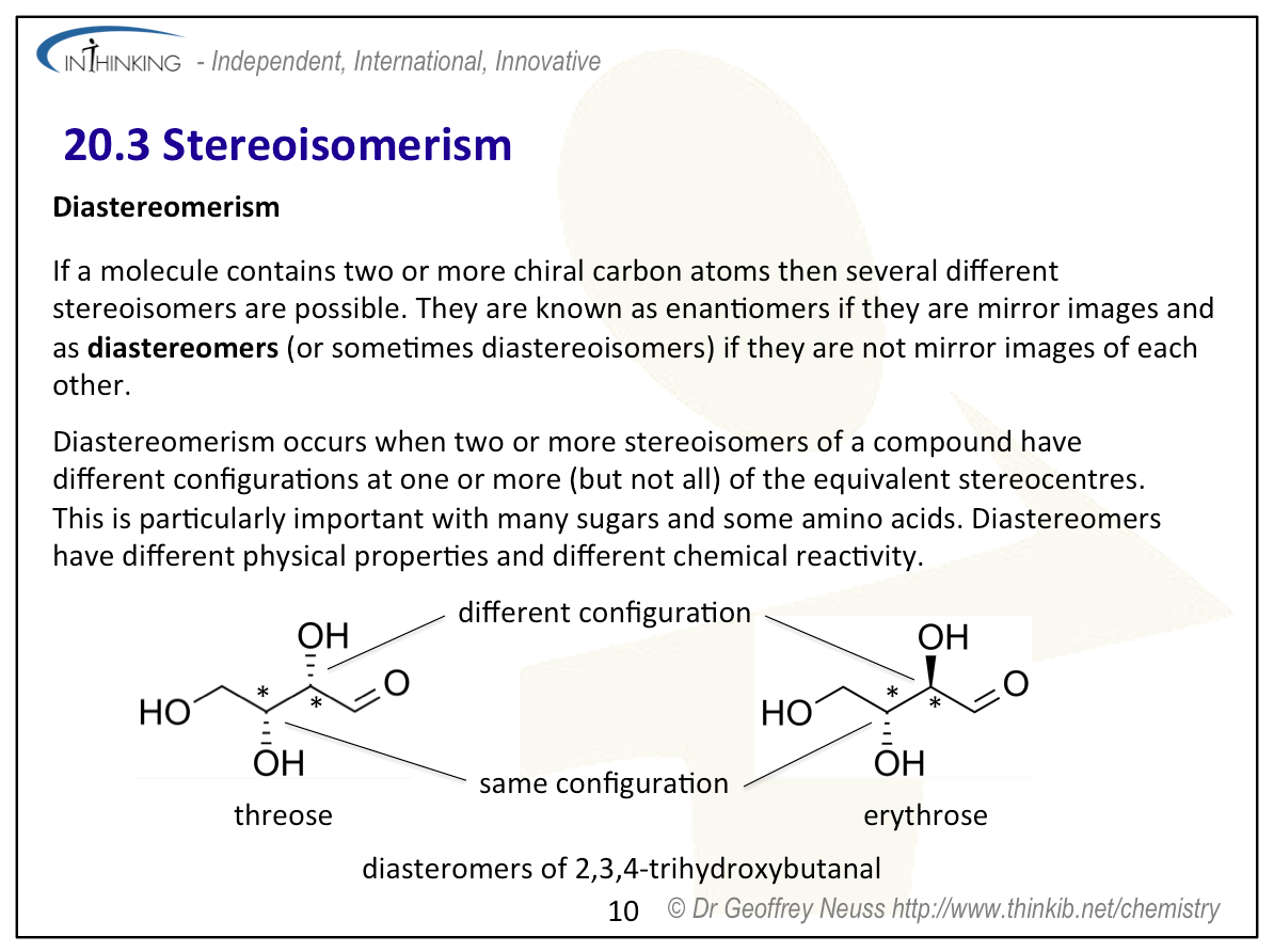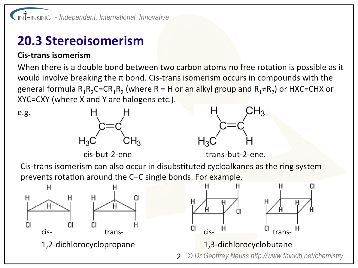 Teaching tipsIt is well worth each student, or pair of students, having access to a modelling set (e.g. Molymod) whilst teaching this topic. Virtual models can be useful but when they appear on a flat screen they are still 3-D being represented in two dimensions. Apart from knowing of its existence and why it occurs there is not very much that can be covered on conformational isomerism. It is probably worth getting students to make a 3-D model of butane and they can see how the two end methyl groups lie in different planes as the bond between the second and third carbon atoms is rotated. The isomers can be detected by infrared spectroscopy and the dynamics can be studied using NMR spectroscopy but this is beyond the syllabus. Give students plenty of practice at labelling different alkenes according to whether they are the E or Z form and emphasise how using E/Z is superior to cis/trans and the fact that the Z form is not always the cis form (or the E form is not always the trans form). Because there is a lot of human interest and it illustrates how profit can override ethical considerations it is worth students knowing about the thalidomide story to show the importance of enantiomers. Amino acids, 2-hydroxypropanoic acid and butan-2-ol are classic examples to use to illustrate chiral compounds but you can use many of the molecules given in Sections 33 and 37 of the data booklet as examples too. Make sure students can use the wedge and dotted line convention when making representations of enantiomers to show clearly mirror images. It can be difficult to know how much to do on diastereomers. It is probably worth showing how they can arise and stress that they can have different physical and chemical properties. There is a good article on this by UC Davis Chem Wiki. | Study guide
