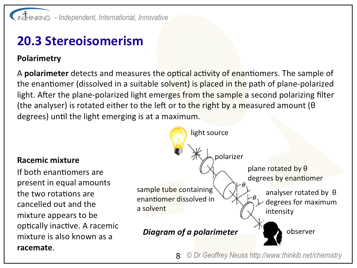 Page 94 - 96 QuestionsFor ten 'quiz' multiple choice questions with the answers explained see MC test: Stereoisomerism. For short-answer questions which can be set as an assignment for a test, homework or given for self study together with model answers see Stereoisomerism questions. Vocabulary listconformational isomer IM, TOK, Utilization etc.See separate page which covers all of Topics 10 & 20. Practical work