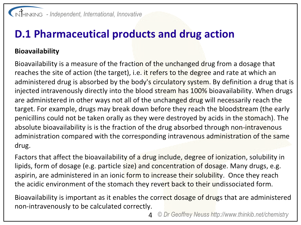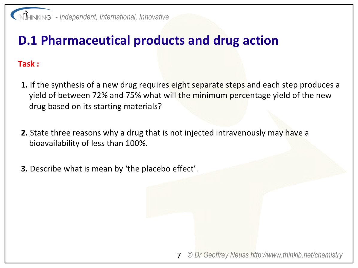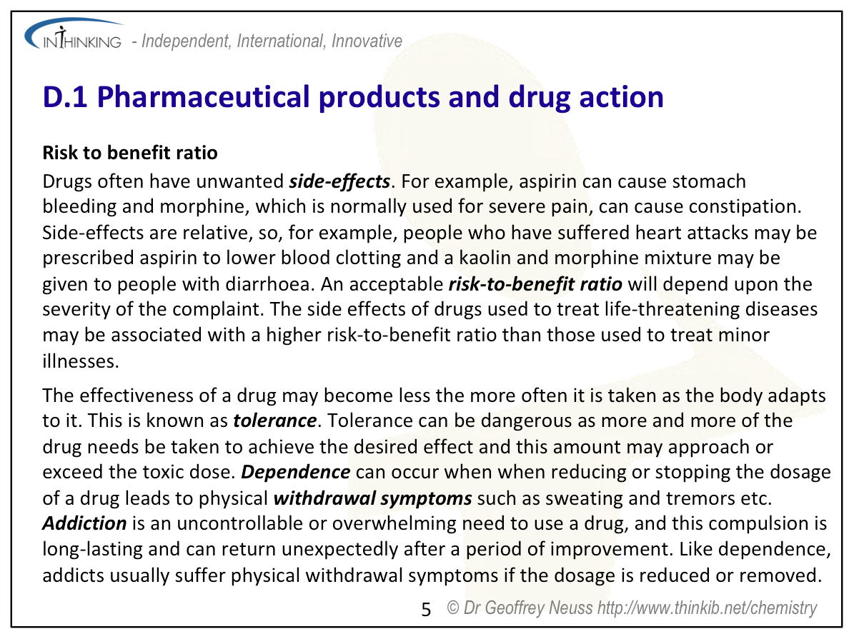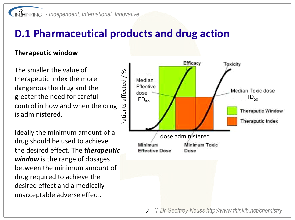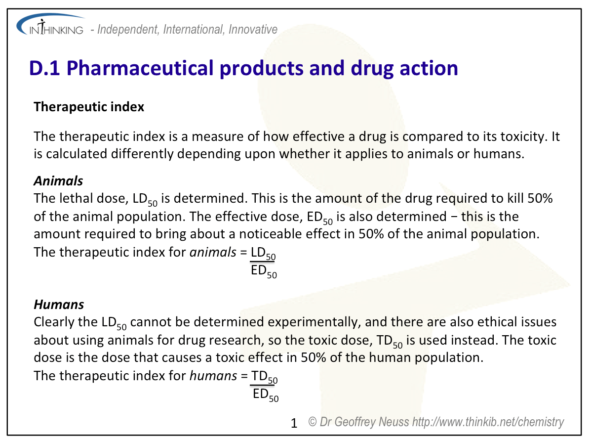 | Clarification notesThe testing of drugs on both animals and humans (for the therapeutic index, LD50/ED50 and TD50/ED50 respectively) should be kept to a minimum for ethical reasons. International-mindednessThere is considerable variation between countries as to which drugs are available over the counter (OTC) and which can only be obtained on prescription from a medical practitioner. |