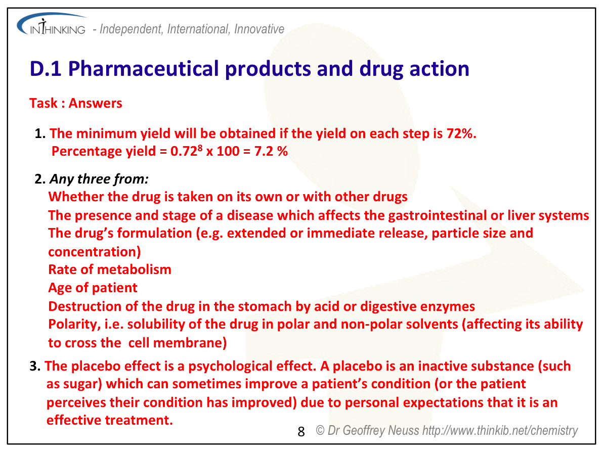 Teaching tipsThere is quite a lot to cover in just one hour. However students will already have some general knowledge about drugs and medicines so it is well worth starting by finding out what they do already know and building on this. Get them to share ideas about what the effects of drugs are on the body and how they can be administered - then ensure that all the relevant points have been covered. For example, you will need to explain why many drugs are administered in their ionic form as salts rather than in their undissociated form. Show them pictures of thalidomide victims and discuss the story as this is good Aim 8 and it leads on to the importance of proper pre-testing and clinical trials for all the possible enantiomers. It is worth mentioning that there are similar ethical versus economic issues with the side effects of some modern drugs e.g. paroxetine hydrochloride (see 'Pause for thought' above). Ensure that students understand what is meant by the words: tolerance, addiction, therapeutic index, therapeutic window and side effects. Discuss the ethical and practical problems of determining the LD50, ED50 and TD50 and the difference between administered dosage and bioavailability. It is also worth stressing that the more steps there are in the synthetic pathway to make a drug the lower the final yield is likely to be. | Study GuidePage 154 QuestionsFor ten 'quiz' questions (for quick testing of knowledge and understanding with the answers explained) see MC test: Pharmaceutical products & drug action. For short-answer questions see Pharmaceutical products & drug action questions together with the worked answers on a separate page Pharmaceutical products & drug action answers. Vocabulary listplacebo |
