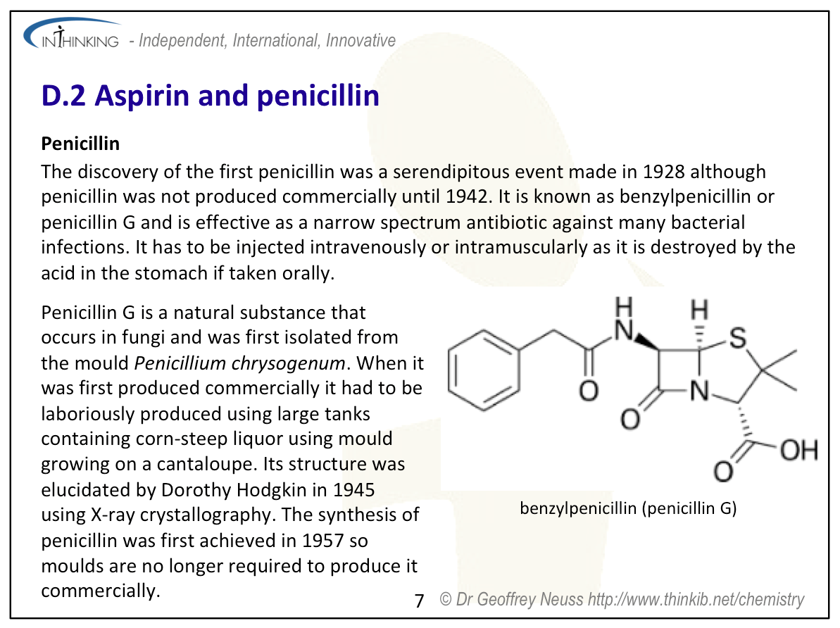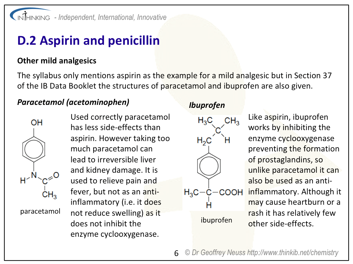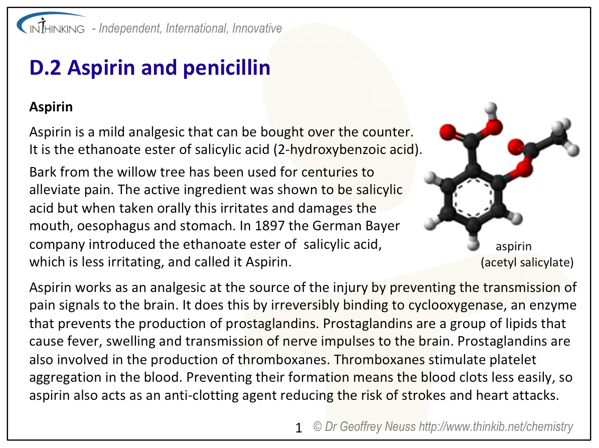 It seems rather strange to me to have a sub-topic covering just aspirin and penicillin as they would appear to have little in common – even the ‘Understandings’ and ‘Applications and skills’ in the Guide list them under different headings. In previous versions of the programme, aspirin, together with paracetamol and ibuprofen, formed a sub-topic on mild analgesics and penicillin was part of a separate sub-topic on antibacterials.