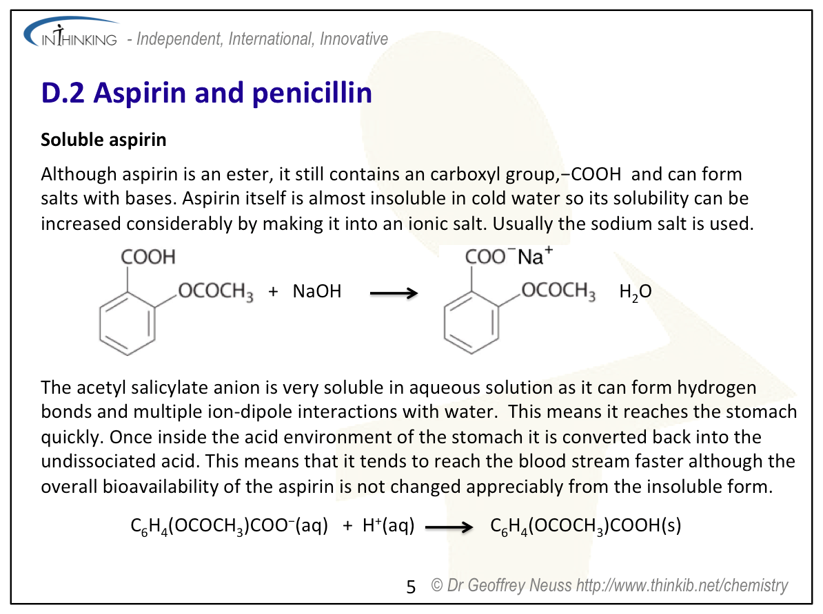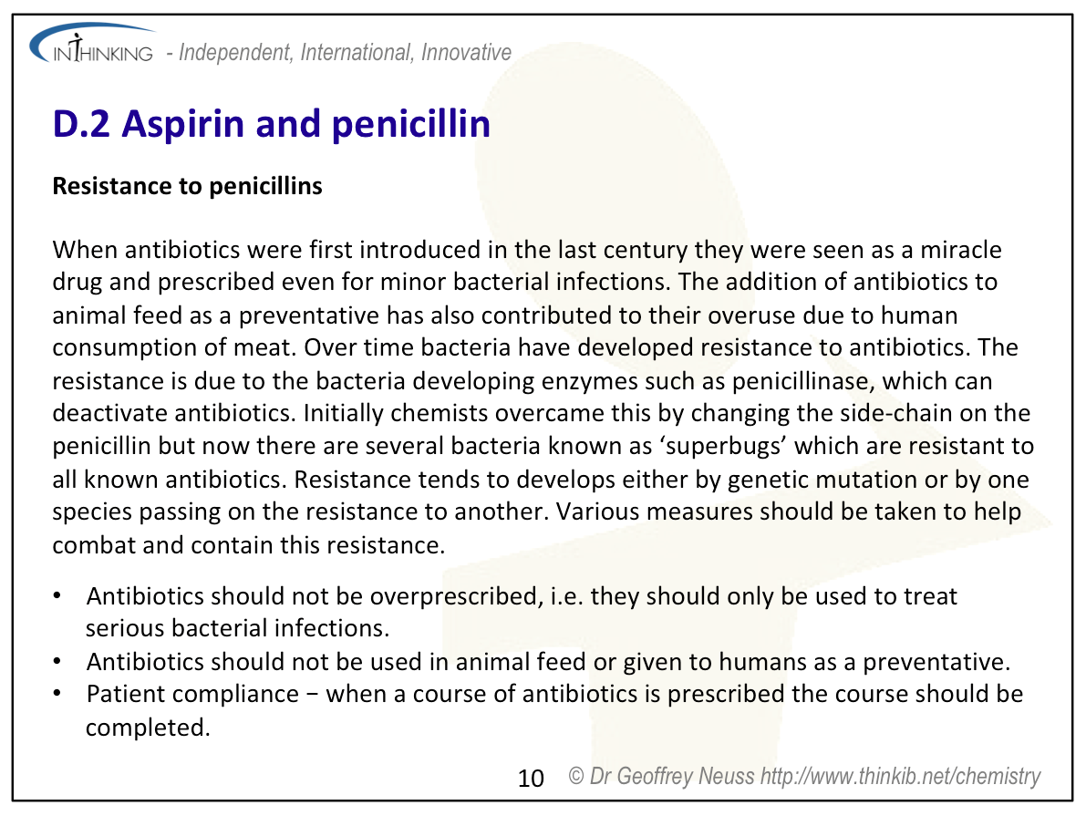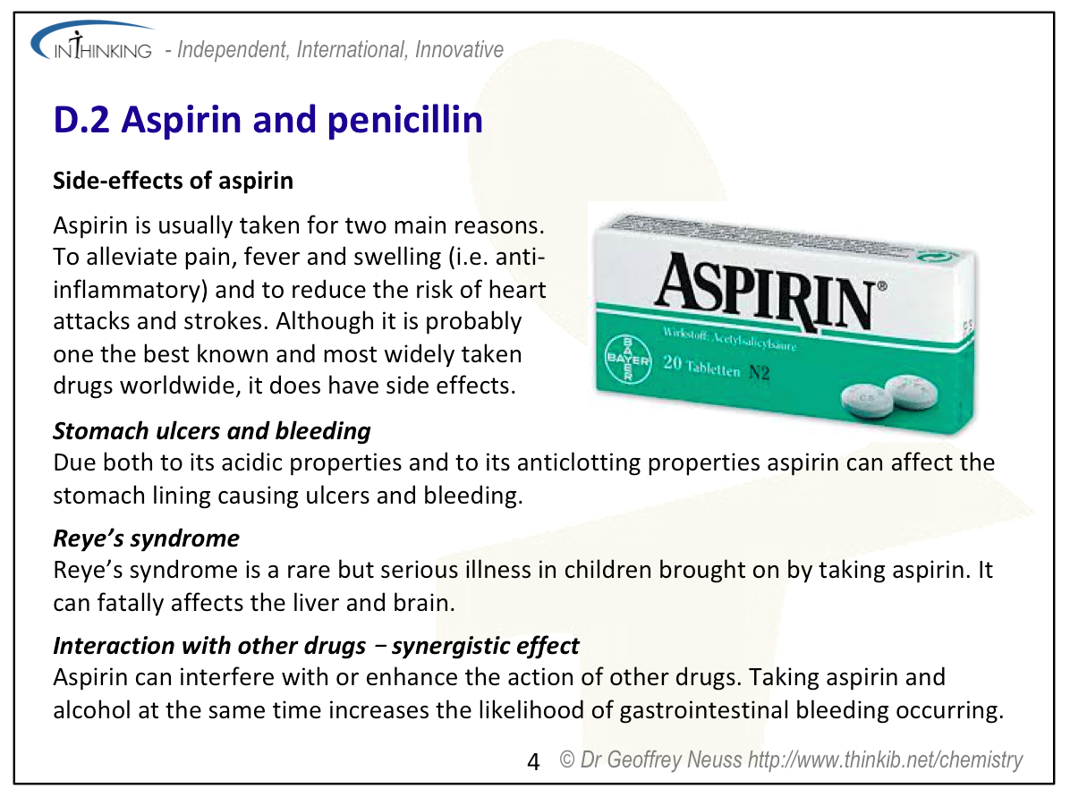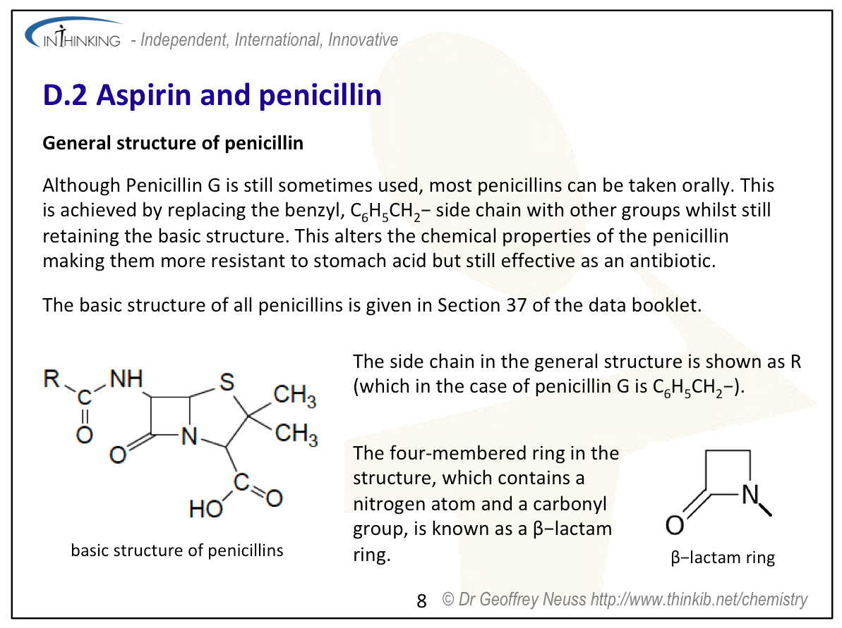 | Clarification notesThe structures of aspirin and penicillin are provided in Section 37 of the data booklet. The ability of acidic (carboxylic) and basic (amino) International-mindednessAspirin is used worldwide and has several different uses. The discovery and use of antibacterials has changed the way that disease is treated throughout the world and contributed to an increase in life-expectancy. |