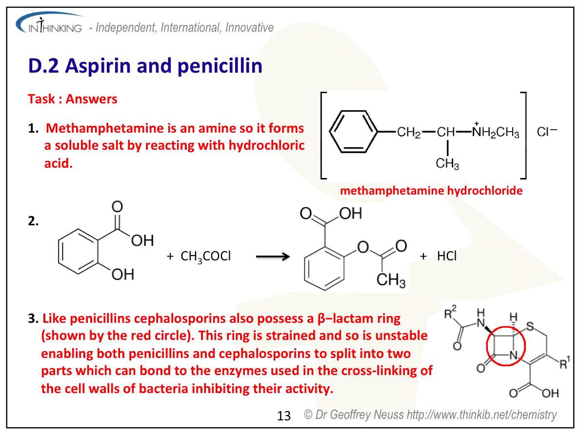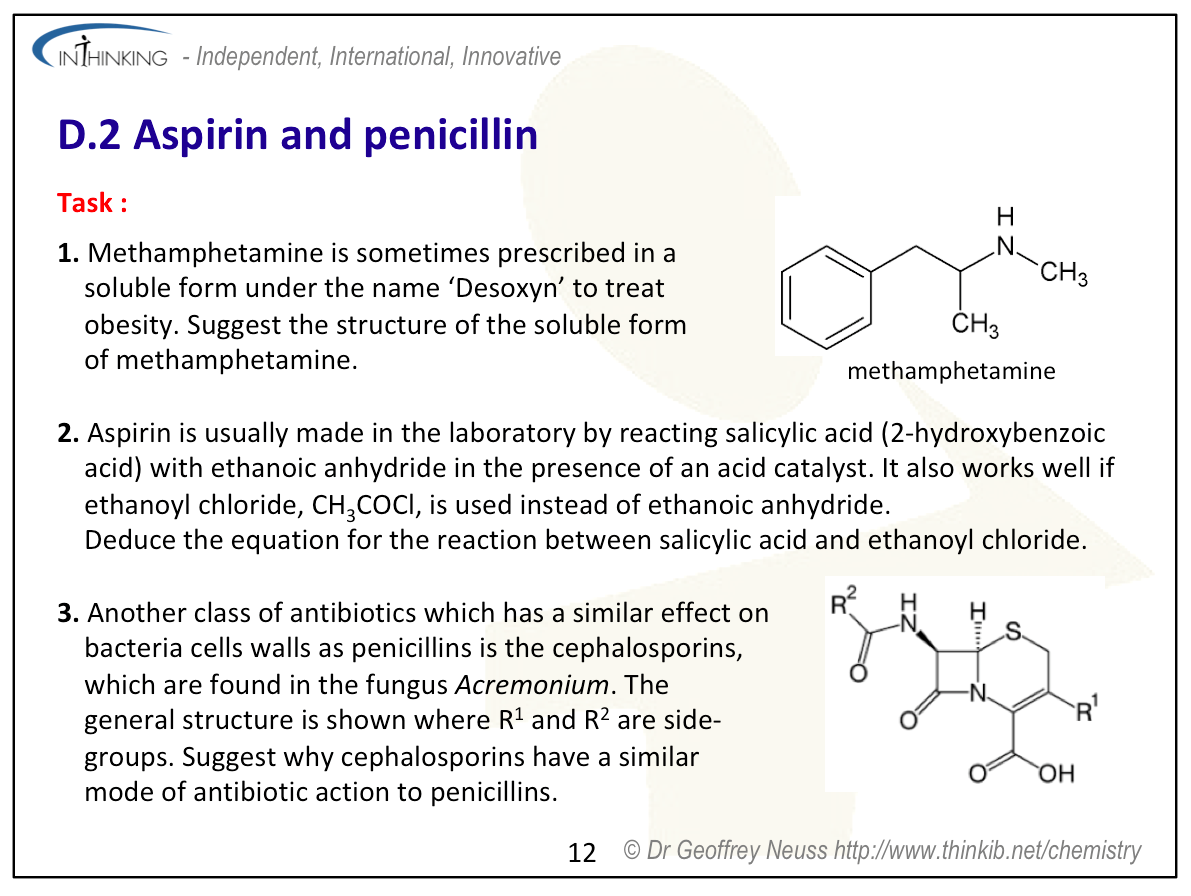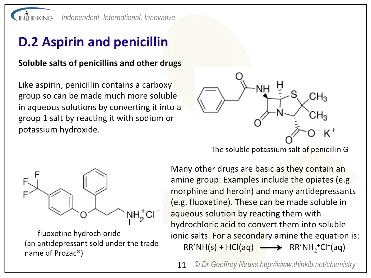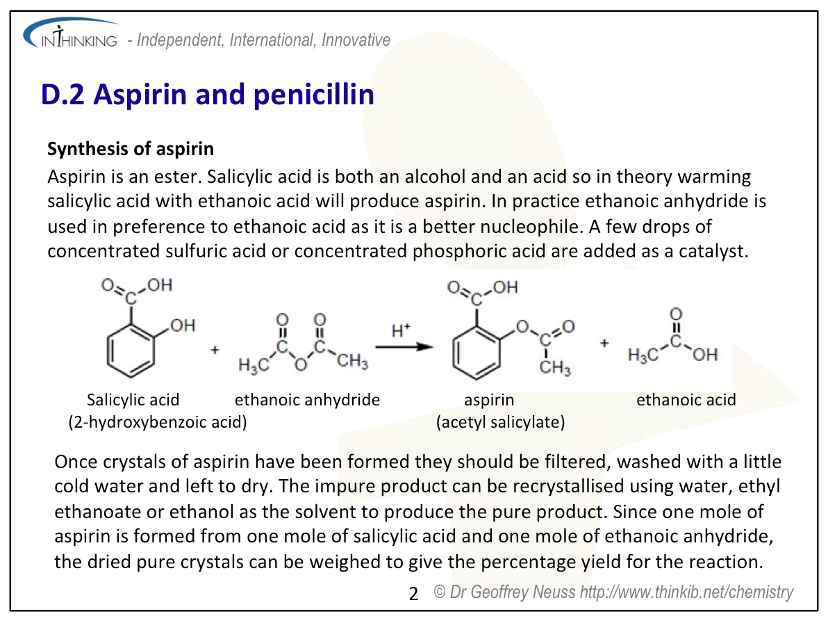 | Clarification notesThe structures of aspirin and penicillin are provided in Section 37 of the data booklet. The ability of acidic (carboxylic) and basic (amino) International-mindednessAspirin is used worldwide and has several different uses. The discovery and use of antibacterials has changed the way that disease is treated throughout the world and contributed to an increase in life-expectancy. |