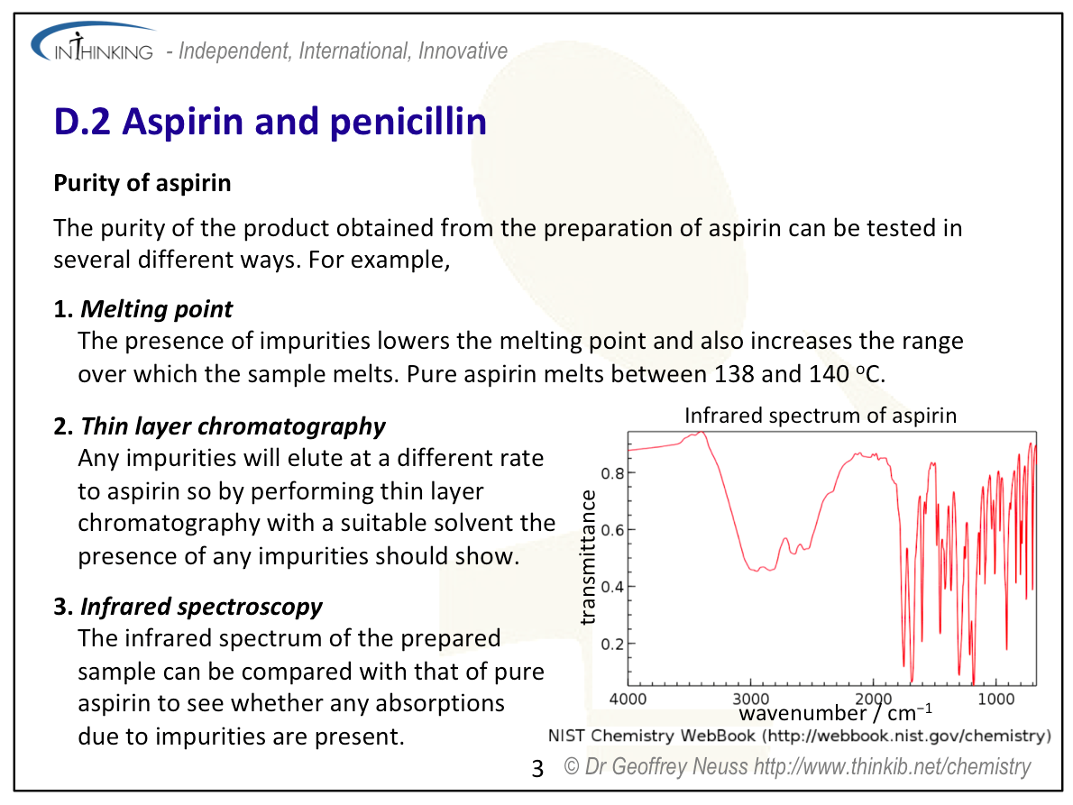 Teaching tipsThis is a relatively straightforward topic to teach although rather factual. Aspirin lends itself well to practical work e.g. Analysis of aspirin tablets and Preparation & purification of aspirin. In fact because the synthesis of aspirin is covered in the 'Understandings' it is well worth teaching it through the practical. The melting point and infrared spectrum of aspirin are also provided in this practical sheet. It is worth getting students to research for themselves the uses and problems (side effects) of aspirin and also how it works and perhaps get one of them to make a presentation. Explain that the solubility of aspirin in water can be increased considerably by making the sodium (or calcium) salt by reacting the carboxylic acid group with a base - this aids bioavailability. In the acid environment of the stomach the salt will revert back to its undissociated form. Many other drugs contain an amino group and these can be made water-soluble by reacting with an acid to form the corresponding salt, e.g. morphine hydrochloride. Students will be interested in antibiotics and the story of the discovery of penicillin is well worth telling. It is usually attributed to Alexander Fleming and the concept of serendipity is important here - use Pasteur's quote that 'Chance favours the prepared mind'. It is worth mentioning that the antibacterial properties of mould have been known for a long time and perhaps also challenge perceived wisdom by mentioning the earlier publication on penicillin by Clodomiro Twight (see 'Pause for thought' above) Equally fascinating is the development of penicillins by Florey and Chain during World War II. It is also worth talking about 'super bugs' such as MRSA and the problems of overprescribing and putting antibiotics in animal feedstock. | Study guidePages 155 &156 QuestionsFor ten 'quiz' questions (for quick testing of knowledge and understanding with the answers explained) see MC test: Aspirin & penicillin. For short-answer questions see Aspirin & penicillin questions together with the worked answers on a separate page Aspirin & penicillin answers. Vocabulary list:analgesic Practical work