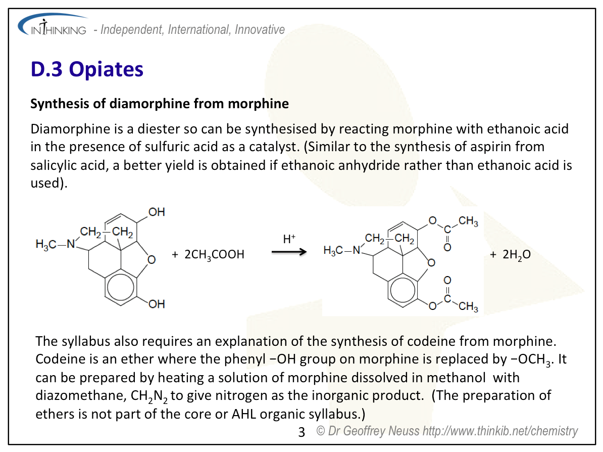 The first statement in the ‘Application and skills’ section is “Explanation of the synthesis of codeine and diamorphine from morphine. Codeine of course does not have to be synthesised from morphine as it does occur naturally however because it only occurs naturally in relatively small mounts much that is produced industrially is synthesised from morphine. I have included a good video from the Royal Society of Chemistry in the ‘other resources’ section below that gives a very thorough explanation as to how the phenol group is substituted for an ether group. Essentially it involves using iodomethane as the reagent in a nucleophilic substitution reaction. The synthesis of diamorphine from heroin is very similar to the synthesis of aspirin from salicylic acid as ethanoic anhydride is used in both cases in preference to just ethanoic acid, as it is a better nucleophile. The only major difference is that the synthesis of diamorphine is an example of diesterification rather than monoesterification.