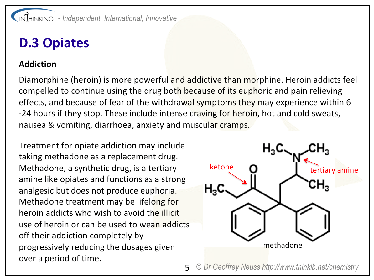 Teaching tipsShow students the structures of morphine, codeine and heroin and get them to realise that the basic structure is identical with the only difference being due to one or two of the functional groups. I like to then ask students how they would change morphine into heroin (if they lived in Afghanistan!). The answer they should give is simply warm with ethanoic acid as it is just a straightforward diesterification reaction (in reality you would actually use ethanoic anhydride as it is a better nucleophile). You can also ask them to predict which out of morphine or heroin will be more polar and then use their answer to explain that heroin can cross the lipid-based blood/brain barrier to reach the brain quicker and in higher concentrations than morphine. They should also be able to see that the structures contain a tertiary amine group. This can readily be converted into a salt by reaction with an acid and they should realise that morphine and heroin are usually administered as a salt to aid bioavailability. It might be worth asking a drug counsellor or other health professional to visit the school to talk about the social and economic problems associated with heroin addiction. | Study guide