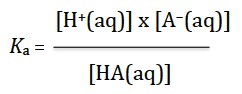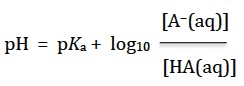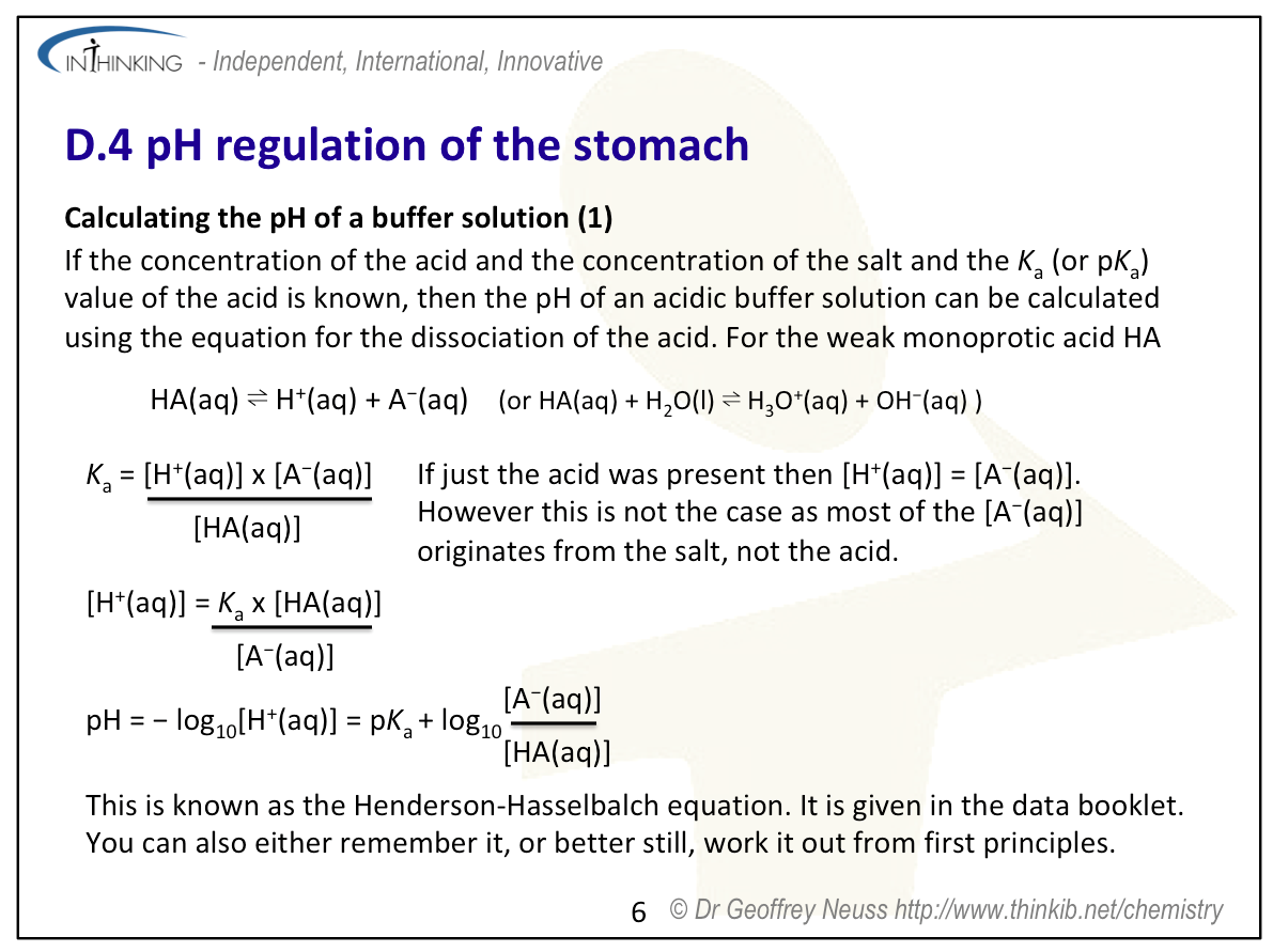 Because you will always have access to the data booklet in the examination for this option you do not need to remember the Henderson-Hasselbalch equation. However to expect you to apply this equation without any understanding seems contrary to the good teaching the IB expects. In fact, in the past I have never used the equation as such as I prefer students to always work from first principles rather than learn or use an unnecessary equation. All you need to know to solve buffer calculations is that pH = −log10 [H+(aq)] (Topic 8) and from this you can deduce that pKa = −log10 Ka. You also need to know that for a weak acid in water HA(aq), the acid dissociation constant, Ka can be expressed just like any other equilibrium constant (Topic 6), i.e.