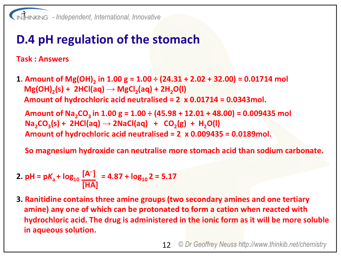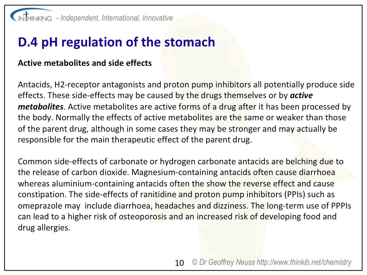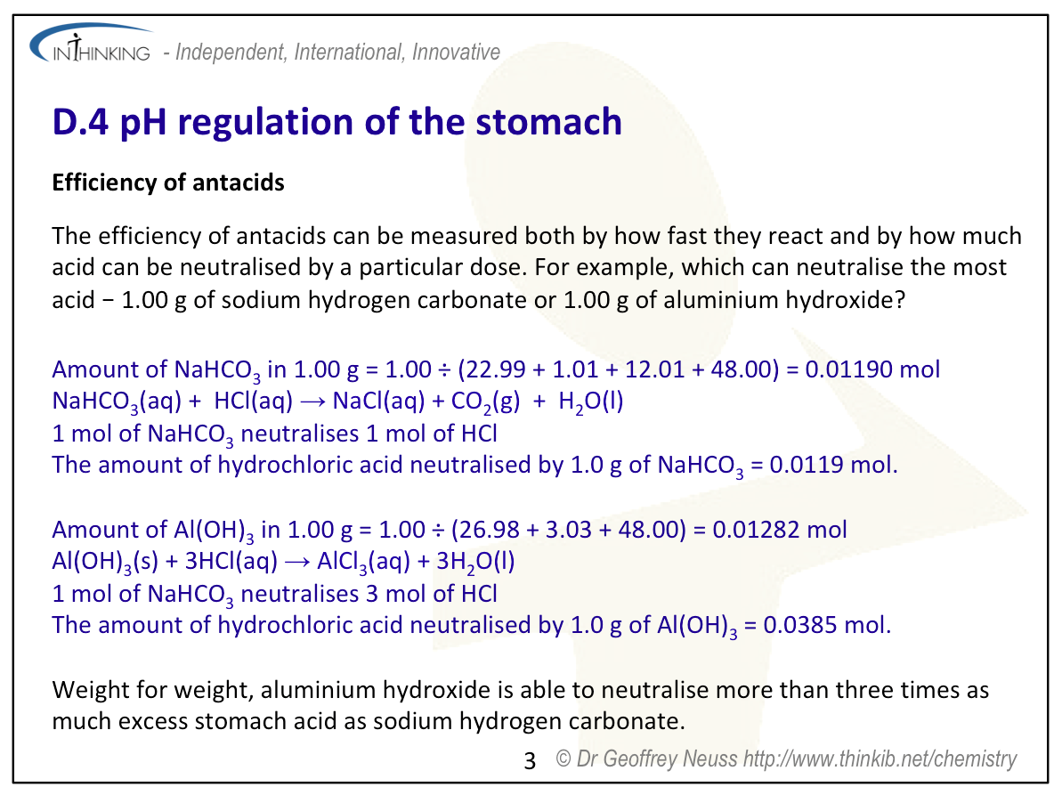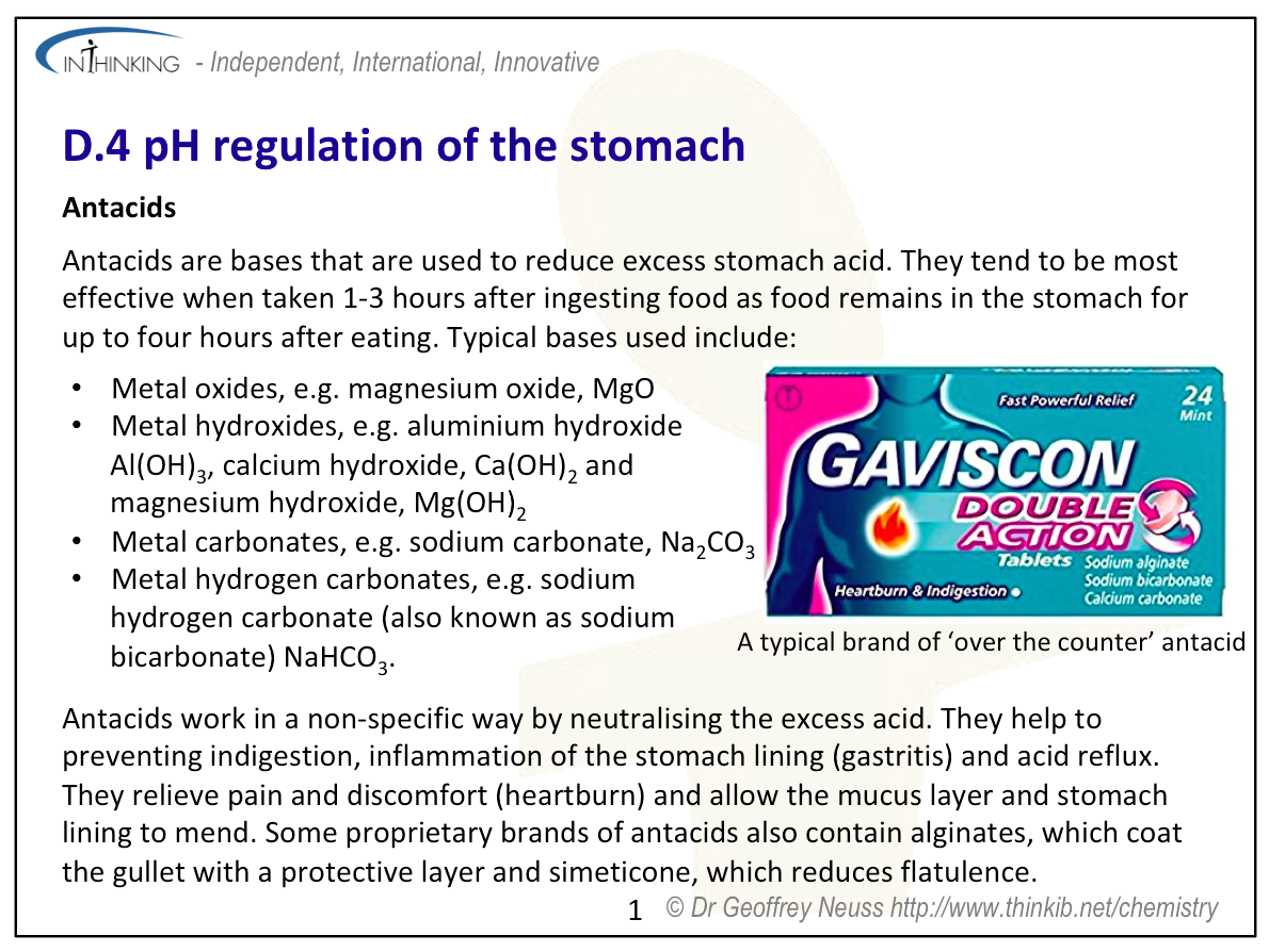 This sub-topic focuses on three different ways to combat excess acidity in the stomach (dyspepsia). Students need to know about the normal pH of gastric juices, which lies in the region of about 1-2.5. The first way has basically been covered already in Topic 8: Acids and bases as it involves neutralising the excess acid with a base. Get students to write the equations for the reactions of the oxides and hydroxides of magnesium and aluminium with hydrochloric acid and also the reactions of carbonates and hydrogencarbonates with hydrochloric acid. They will also need practice with questions to calculate which particular antacids will be able to neutralise the most acid.