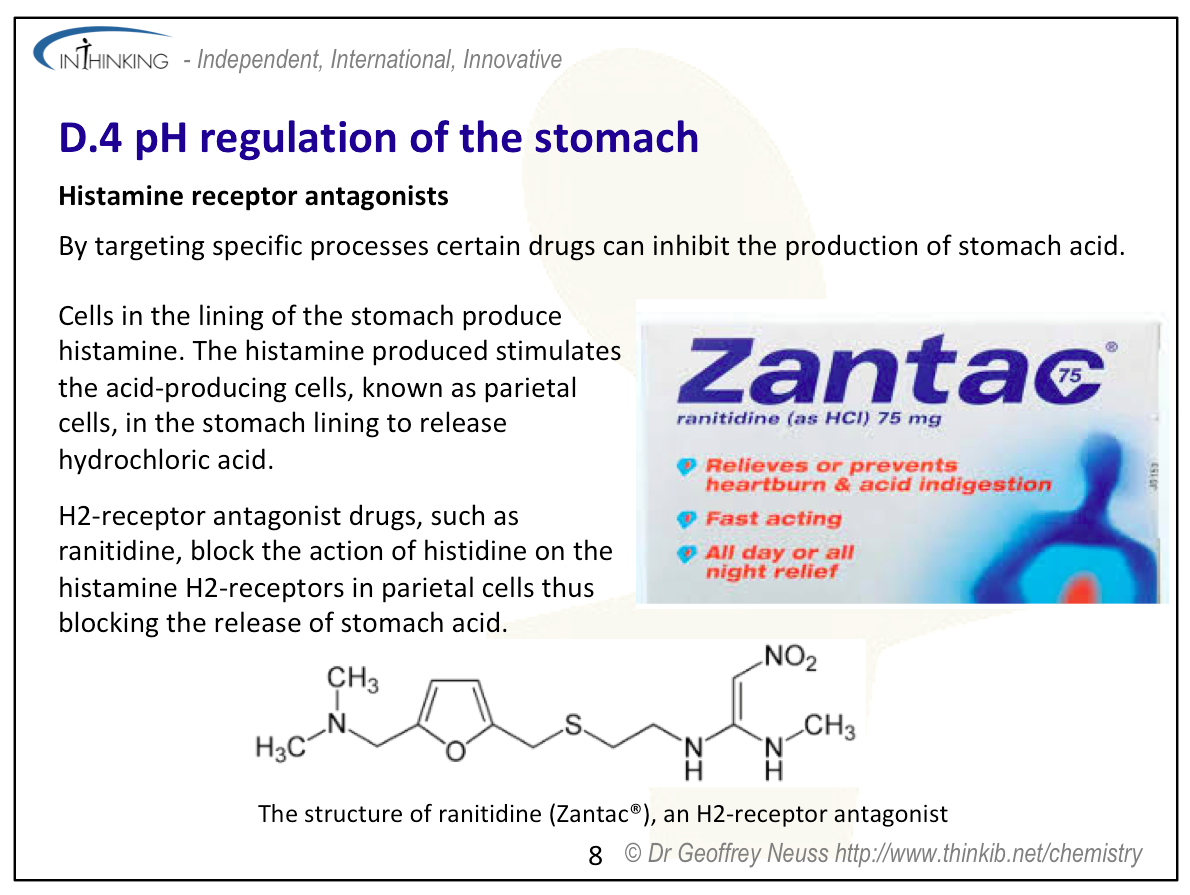 - Explain how compounds, such as ranitidine (Zantac), can be used to inhibit stomach acid production.