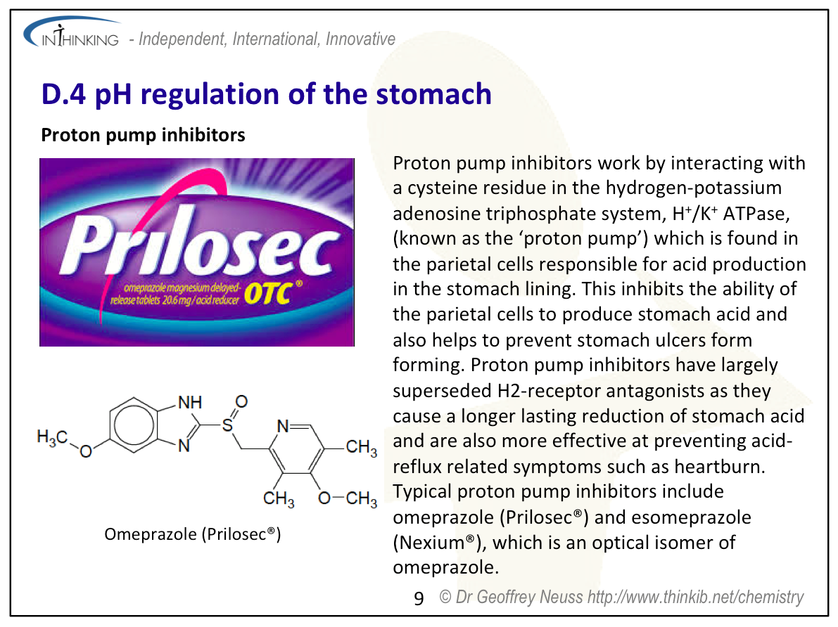 The second method involves the use of drugs like ranitidine. These bind to the H2 histamine receptor in the cells of the gastric lining and prevent secretion of the acid in the stomach. The third method involves the use of drugs (e.g. omeprazole and esomeprazole), which restrict the amount of acid produced by inhibiting a particular enzyme, known as the gastric proton pump, involved in its production. Note that since the syllabus was produced both PPIs and H2 receptor blockers have been shown to have potentially serious side effects - see The danger of prolonged use of proton pump inhibitors and Sales of Zantac® suspended.
