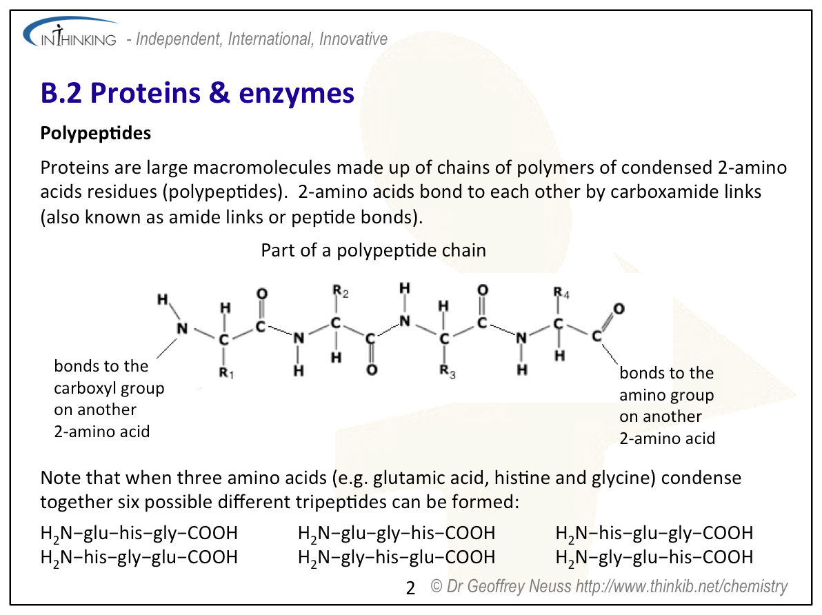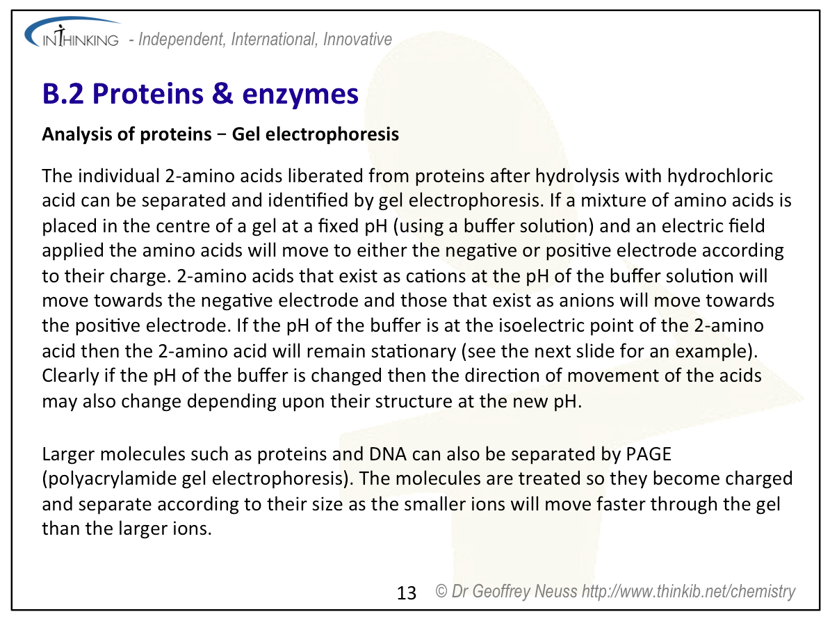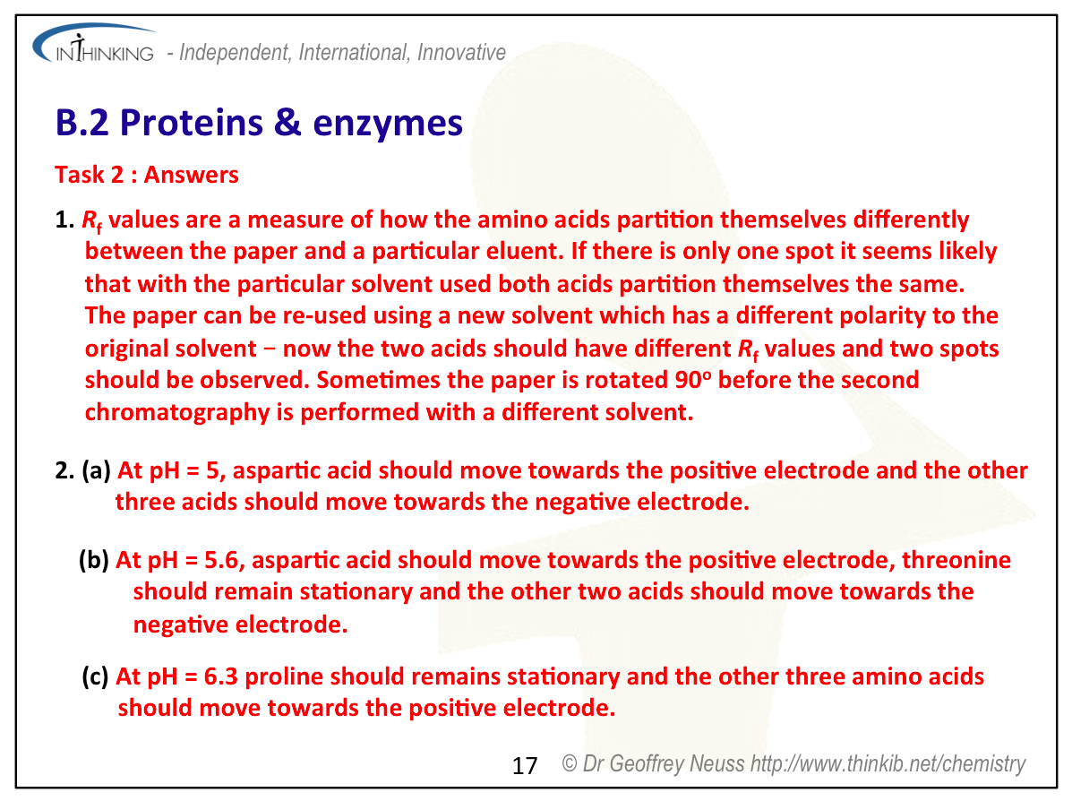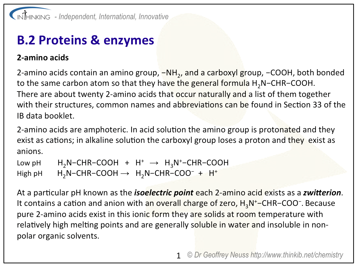 Teaching tipsIt is worth starting this topic by looking at the acid properties of carboxylic acids and the basic properties of amines then discussing the structures of 2-amino acids which contain both functional groups. Use Section 33 to show all the important 2-amino acids. You will need to talk about their structures in low and high pH solutions and the formation of zwitterions. Get students to determine the structures of the dimers and trimers that can be formed when they condense together (see previous sub-topic). Note that two different amino acids can combine to give two different dipeptides and three different amino acids used once each can combine to give six different trimers. Get students to predict the types of interactions that can occur between different amino acid residues in proteins. These include covalent bonding (peptide bond), ionic bonding, hydrogen bonding, disulfide bridges, dipole-dipole interactions and London dispersal forces. You will need to get students to sketch graphs of how enzymes lower the activation energy of a biological reaction, how the rate of reaction reaches a plateau once all the active sites on the substrate are occupied and also how enzyme function varies with pH and temperature. To analyse proteins stress that they must first be hydrolysed to break them down into their constituent individual 2-amino acids. The analysis then depends upon their different polarities (chromatography) or their different isoelectric points (electrophoresis). | Study guide: