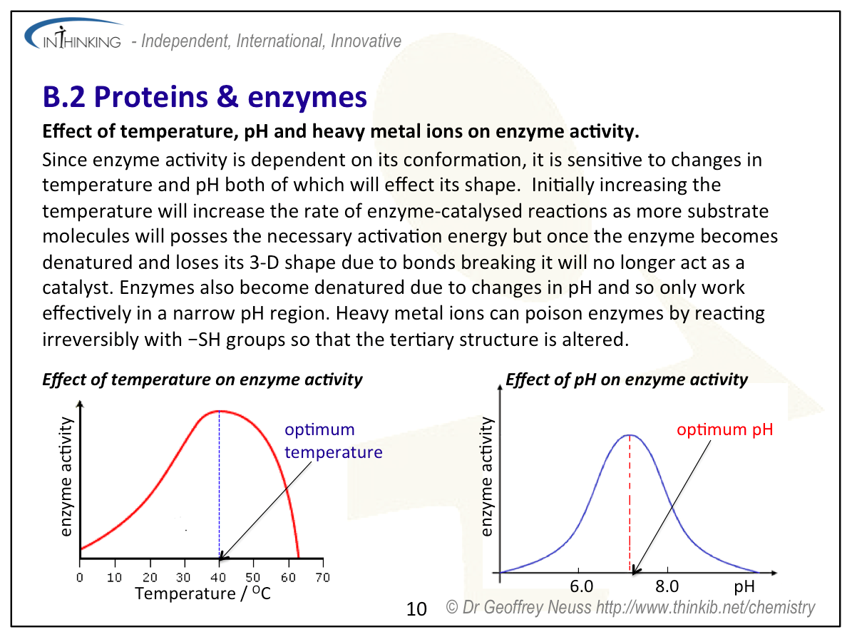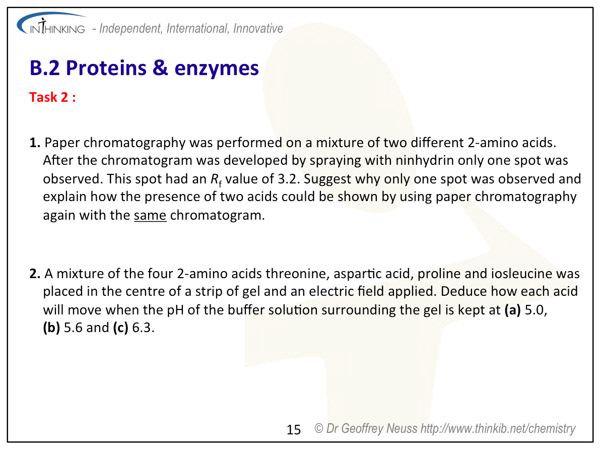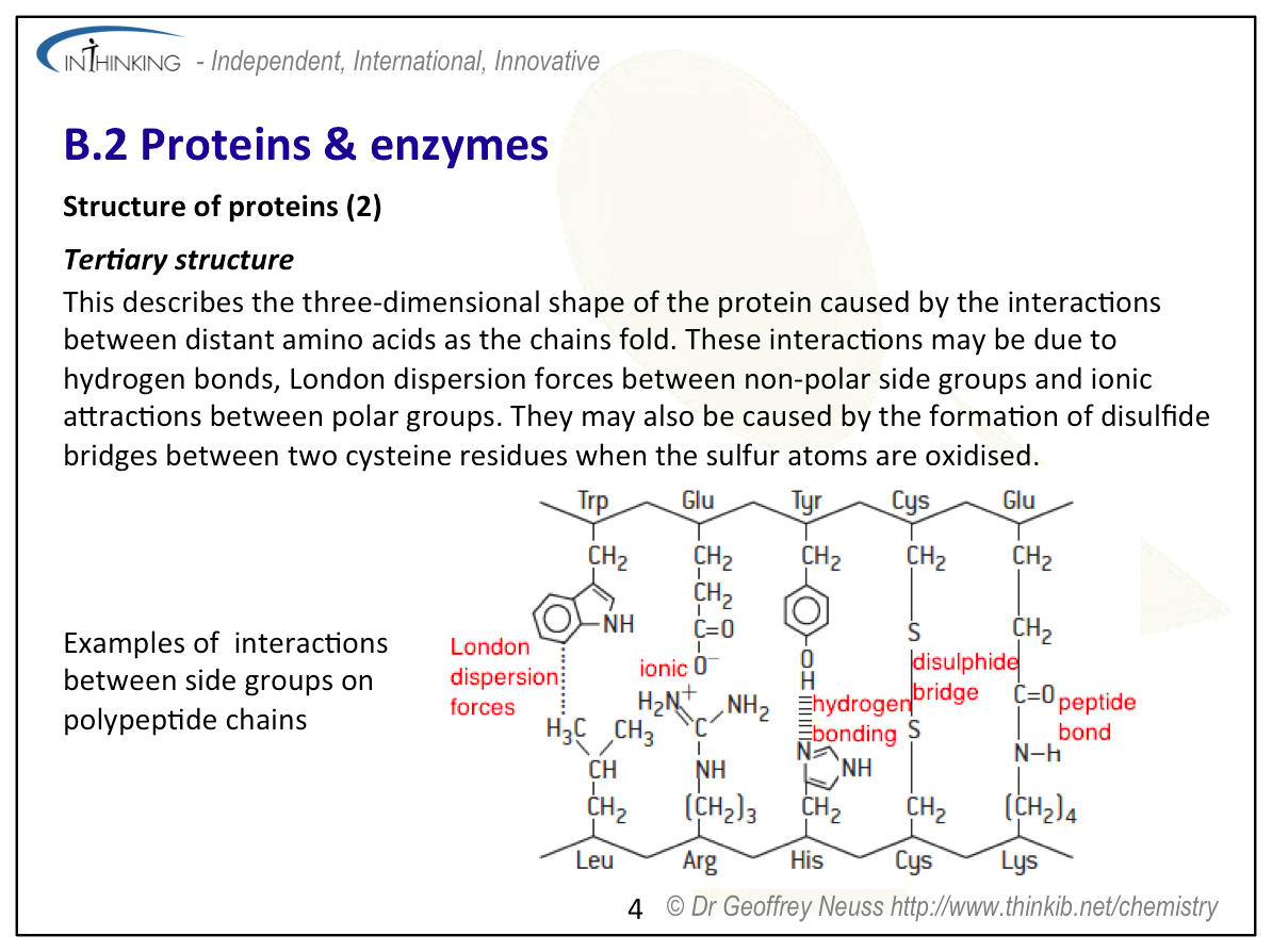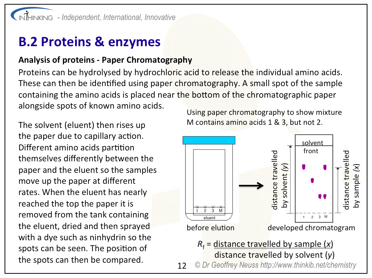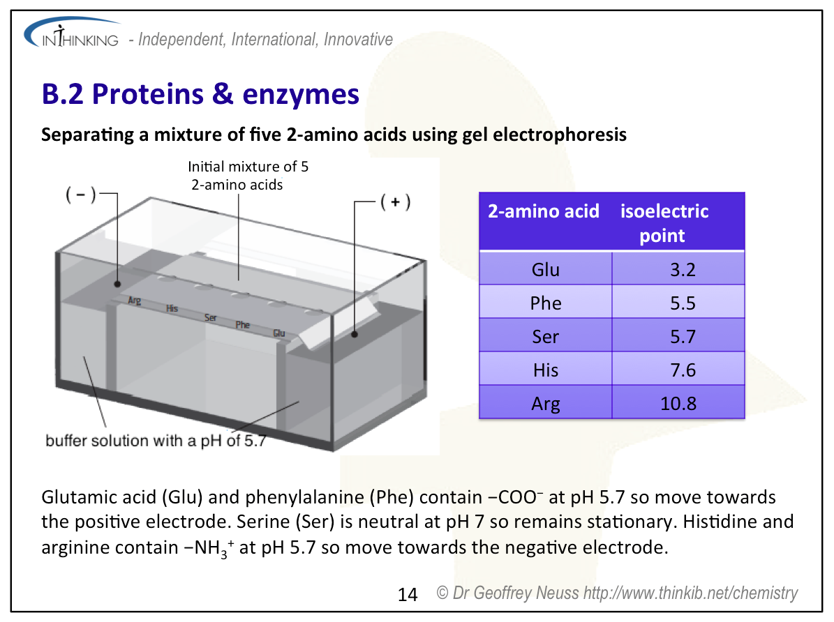 Teaching tipsIt is worth starting this topic by looking at the acid properties of carboxylic acids and the basic properties of amines then discussing the structures of 2-amino acids which contain both functional groups. Use Section 33 to show all the important 2-amino acids. You will need to talk about their structures in low and high pH solutions and the formation of zwitterions. Get students to determine the structures of the dimers and trimers that can be formed when they condense together (see previous sub-topic). Note that two different amino acids can combine to give two different dipeptides and three different amino acids used once each can combine to give six different trimers. Get students to predict the types of interactions that can occur between different amino acid residues in proteins. These include covalent bonding (peptide bond), ionic bonding, hydrogen bonding, disulfide bridges, dipole-dipole interactions and London dispersal forces. You will need to get students to sketch graphs of how enzymes lower the activation energy of a biological reaction, how the rate of reaction reaches a plateau once all the active sites on the substrate are occupied and also how enzyme function varies with pH and temperature. To analyse proteins stress that they must first be hydrolysed to break them down into their constituent individual 2-amino acids. The analysis then depends upon their different polarities (chromatography) or their different isoelectric points (electrophoresis). | Study guide: