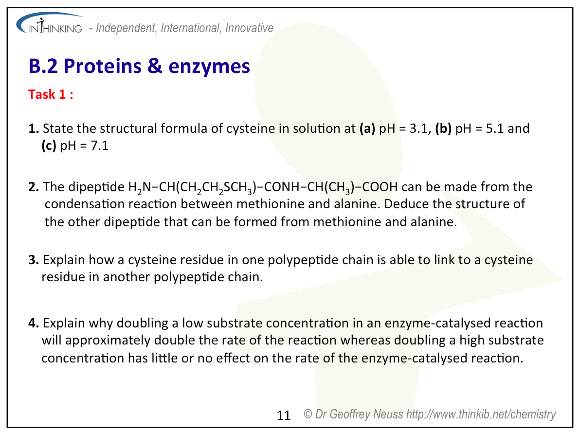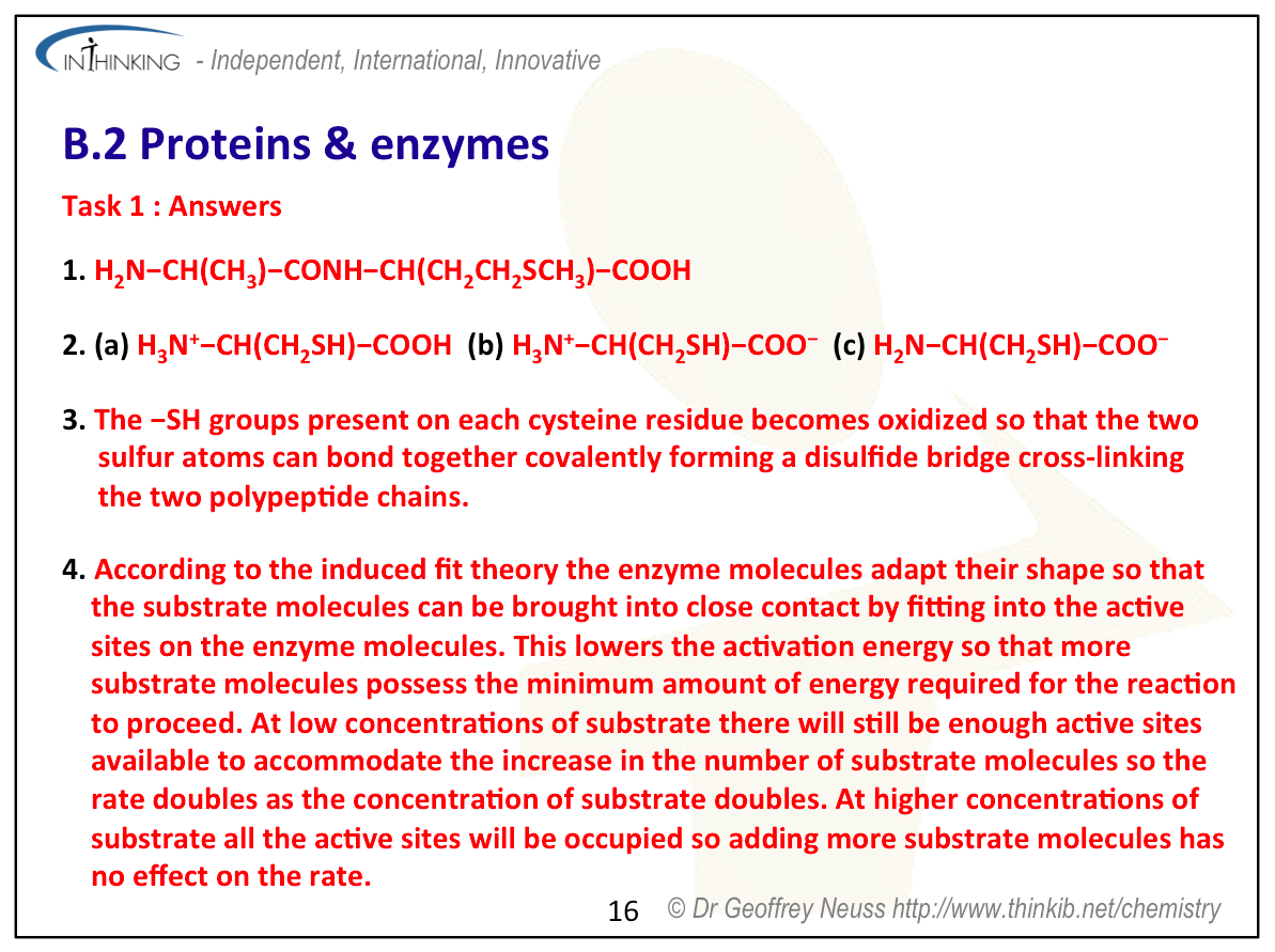 Pages 125 - 127 QuestionsFor ten 'quiz' questions (for quick testing of knowledge and understanding with the answers explained) see MC test: Proteins & enzymes. For short-answer questions see Proteins & enzymes questions together with the worked answers on a separate page Proteins & enzymes answers. Vocabulary list2-amino acid Practical work