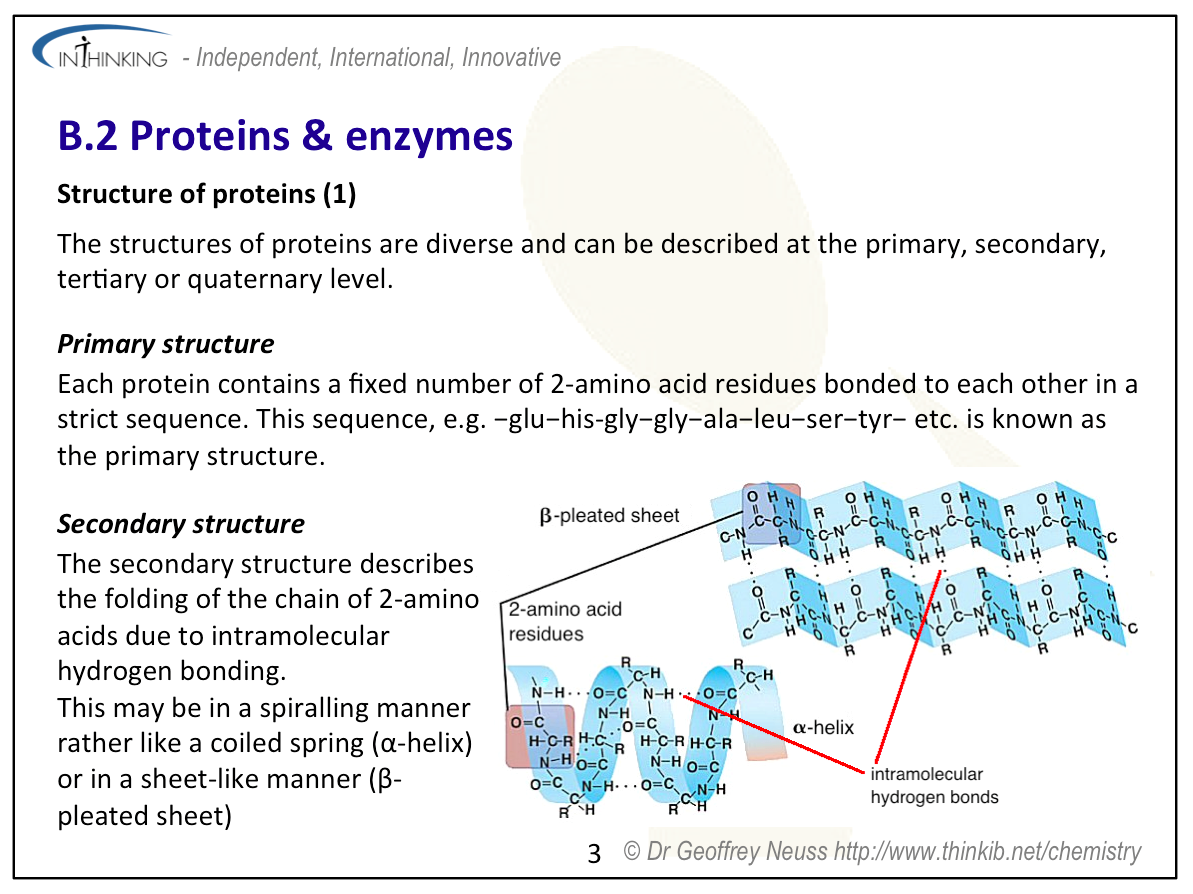 This topic requires students to understand the primary, secondary, tertiary and quaternary structures of proteins. They can easily understand how the primary structure is obtained by hydrolysing the protein and then analysing the amino acid sequence. However how can the 3-D structure of proteins be obtained unequivocally? ⦵