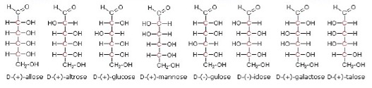 Although glucose is a simple sugar and a well-known compound, its structure and how it can be represented does pose some problems. It contains four chiral centres. This means that theoretically 24 (i.e. 16) stereoisomers are possible, arranged in eight diastereoisomeric pairs. This was first recognised by Emil Fischer, a German chemist, who won the Nobel Prize for chemistry in 1902. Fischer arbitrarily labelled any glucose structure where the –OH bonded to the last chiral carbon atom next to the aldose group (furthest from the aldehyde group) on the right as the D- form. This is for convenience and does not relate to whether the stereoisomer is the d- or l- form in terms of the rotation of plane polarized light. The eight possible stereoisomers of the D form, drawn in what are known as Fischer structures are thus: