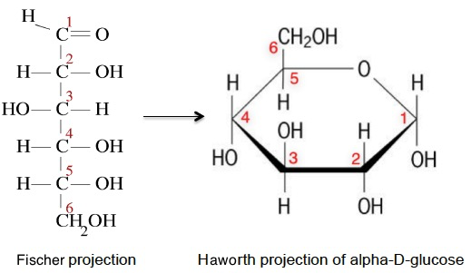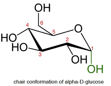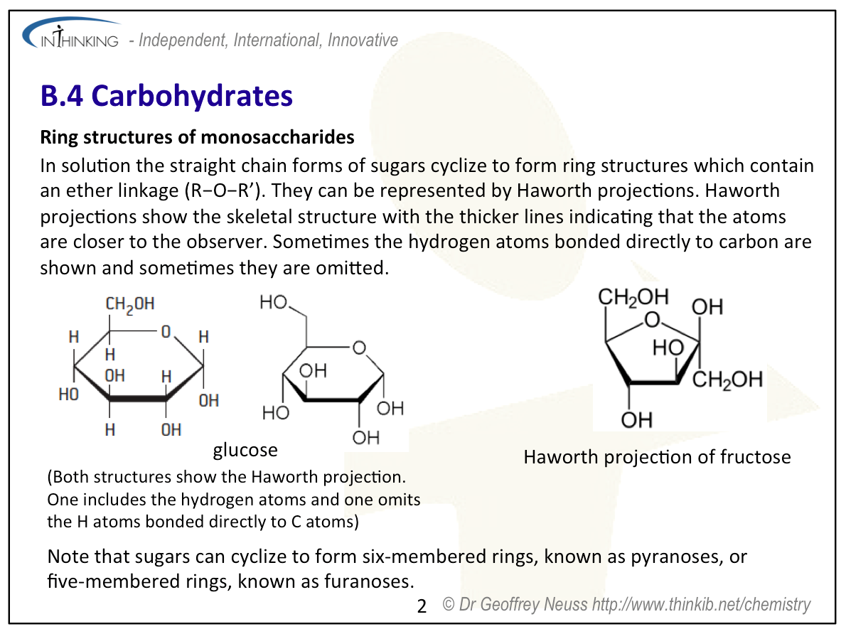 The syllabus uses the Haworth projection, which is a convenient way to show the stereochemistry. The ring drawn in the chair conformation shows both the conformation and stereochemistry but is not required by the IB.