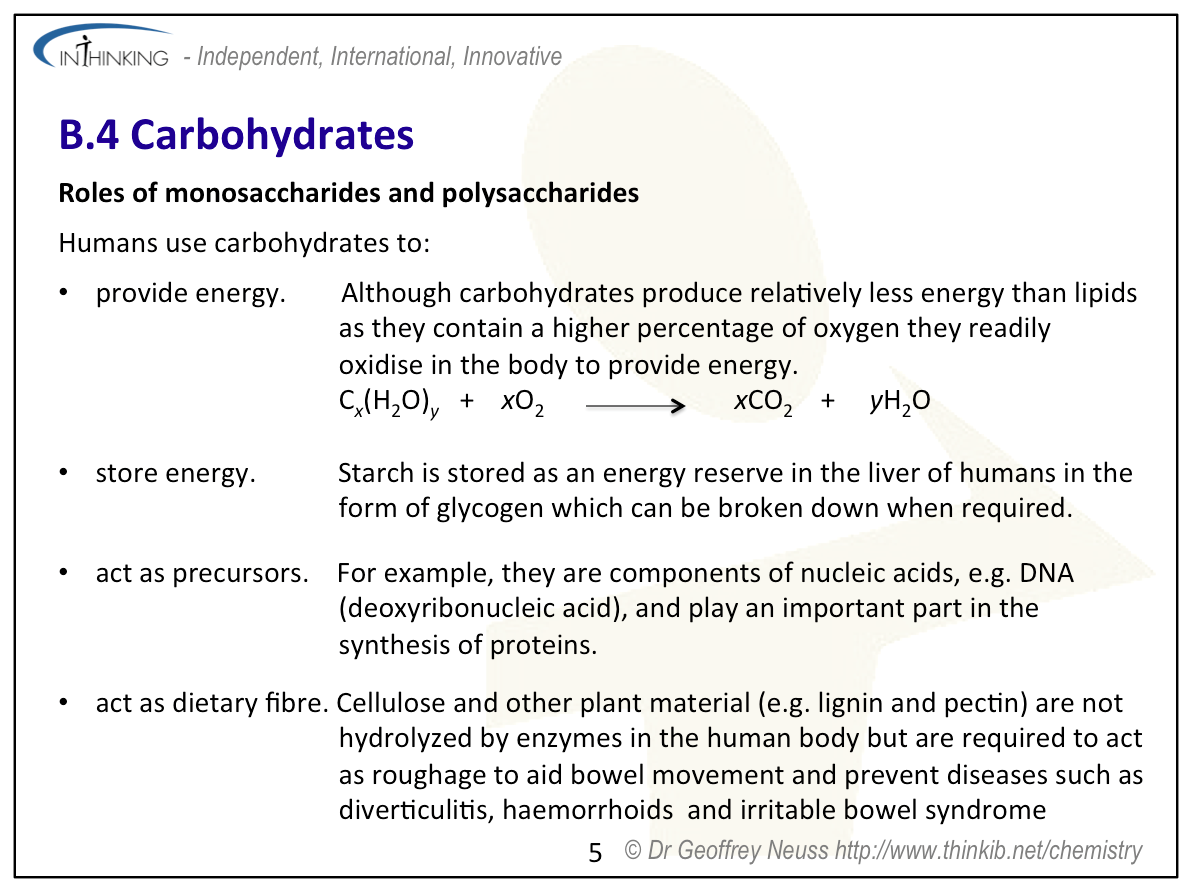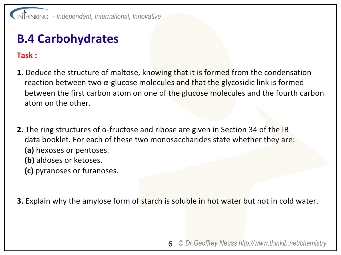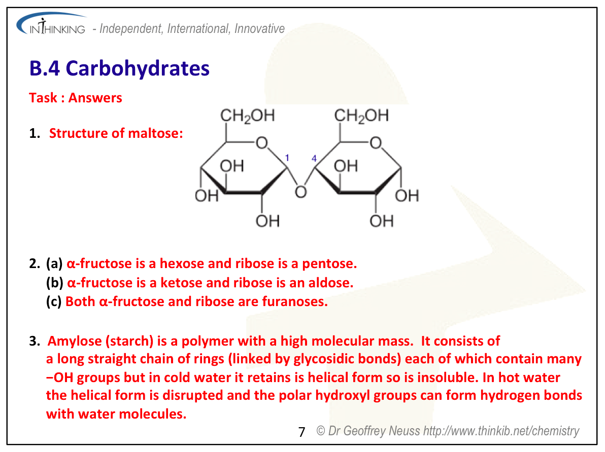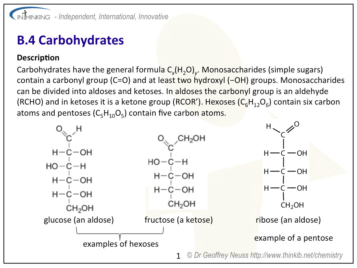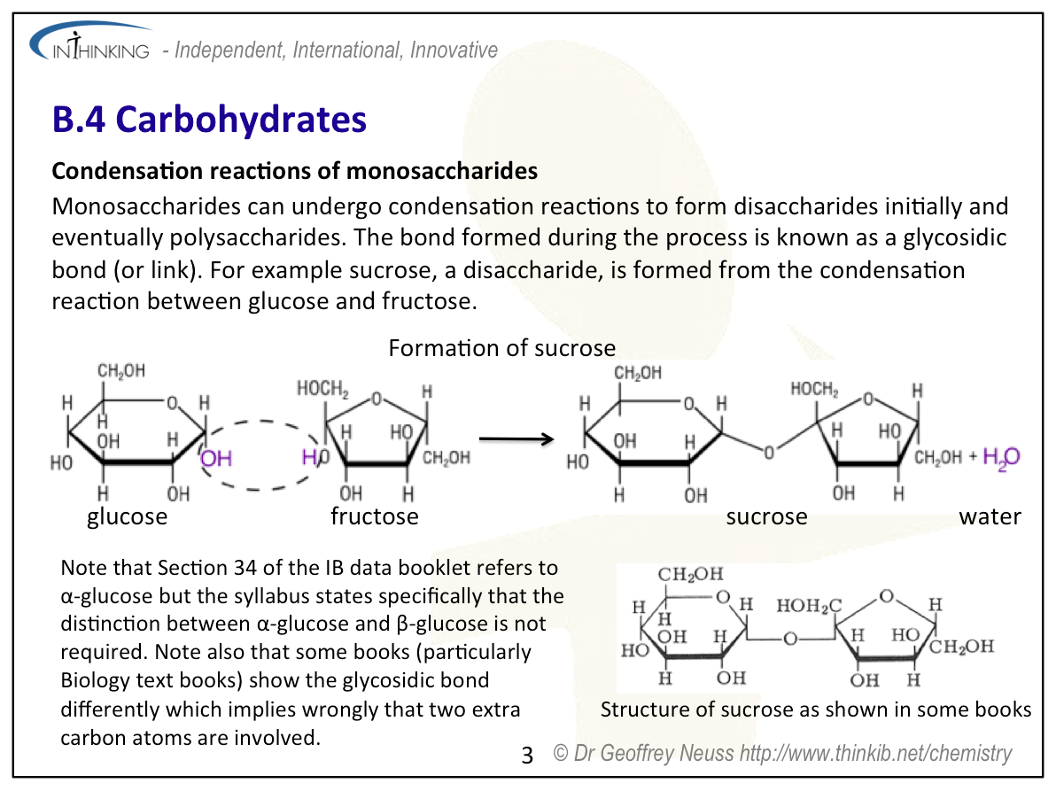 | Clarification notesThe straight chain and α-ring forms of glucose and fructose can be found Section 34 of the data booklet. The following are not required: International-mindednessSugar is a major international commodity that is produced in about 130 different countries. About three-quarters of the production comes from sugar cane in tropical and subtropical regions with the remainder coming from sugar beet that is cultivated in temperate climates.The World Health Organization projects that deaths from diabetes (a chronic disease that occurs when the body cannot effectively regulate blood sugar, due to a failure in the production or functioning of insulin) will double between 2005 and 2030. Lactose intolerance is due to a failure to produce sufficient levels of lactase, the enzyme that hydrolyses lactose into glucose and galactose. Globally, lactose intolerance (a condition in which the individual is not able to digest lactose, the sugar found in milk and dairy products) is the norm and provides an example of a Western perspective invading science. |