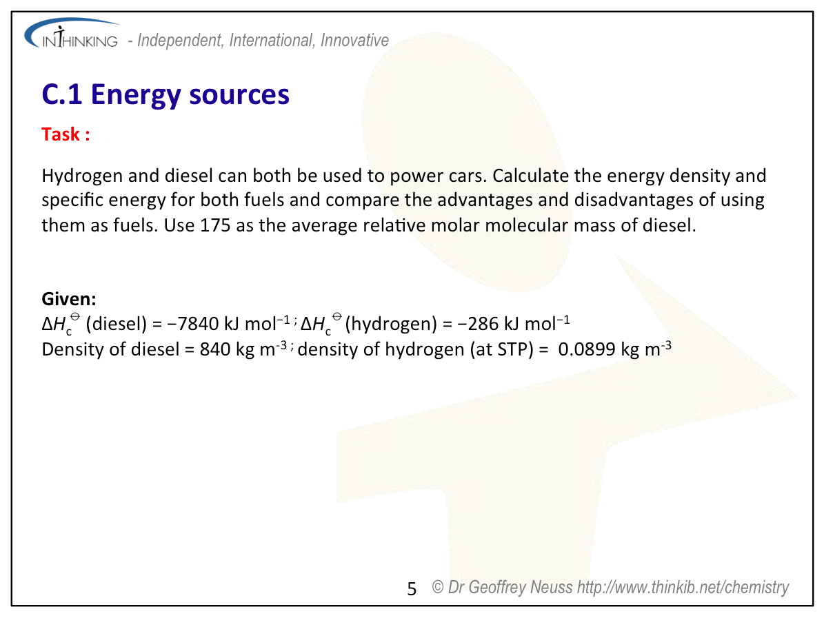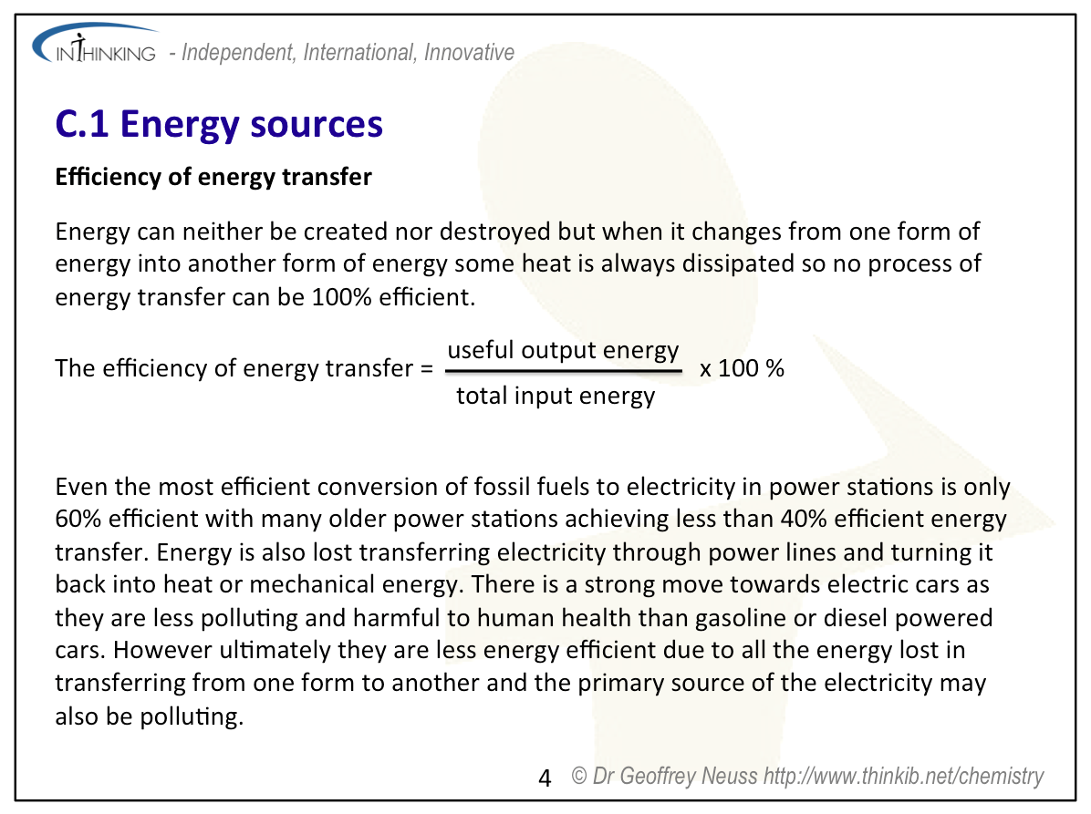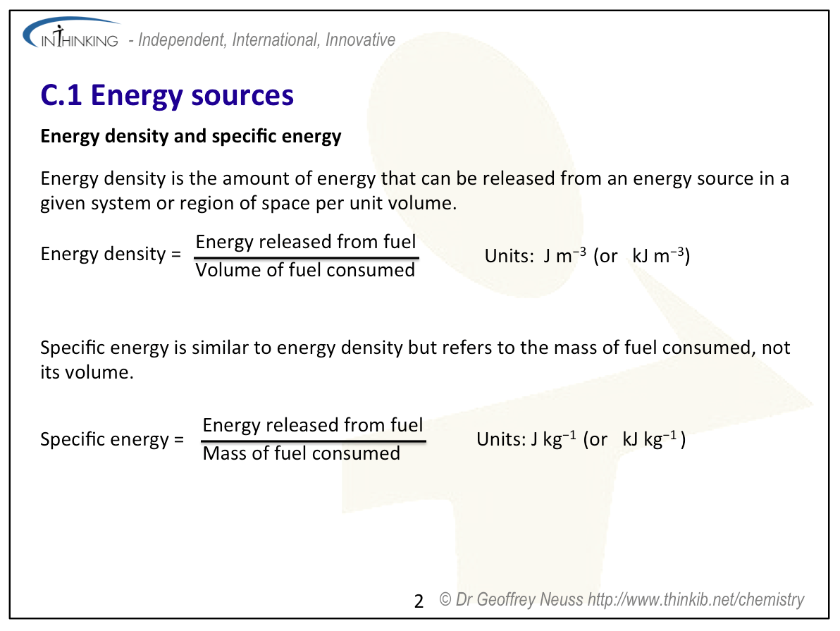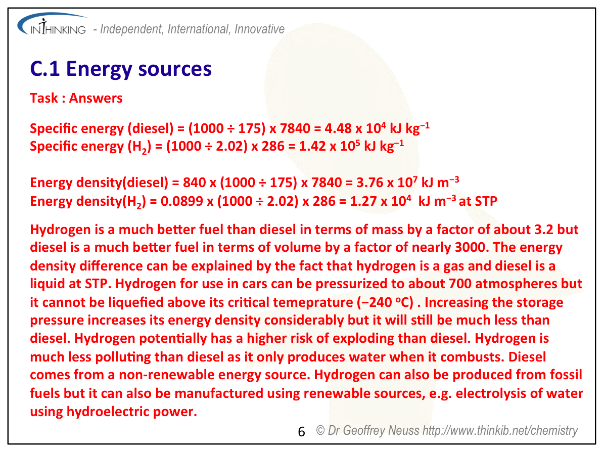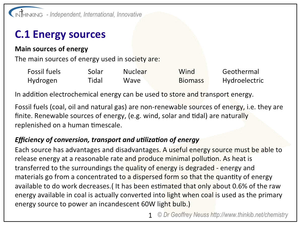 Teaching tipsThis sub-topic can really be divided into two main strands - a general discussion on different energy sources and how they are used and then some specific calculations for different energy sources. You could get students to research individually or in groups and then report back on the advantages and disadvantages of all the different energy sources - both current and possible future sources. Distinguish between renewable and non-renewable sources and emphasise the importance of energy efficiency and how some of the energy available to do work is always lost as heat when energy is converted from one form into another form. Then provide examples for students to compare different energy sources quantitatively by calculating the energy densities, specific energies and the efficiency of energy transfer. Although three hours are allocated for this sub-topic in reality much of it overlaps with the specific types of energy sources covered in the remaining sub-topics of this option. | Study GuidePage 141 QuestionsFor ten 'quiz' questions (for quick testing of knowledge and understanding with the answers explained) see MC test: Energy sources. For short-answer questions see Energy sources questions together with the worked answers on a separate page Energy sources answers. Vocabulary listrenewable energy |