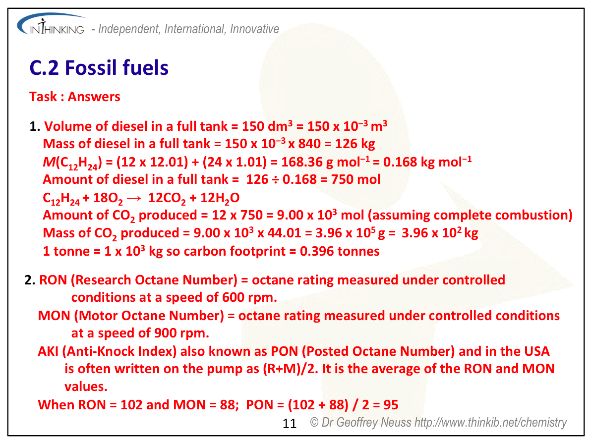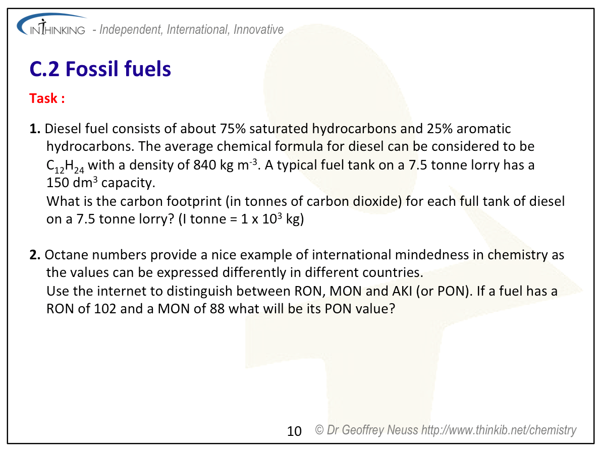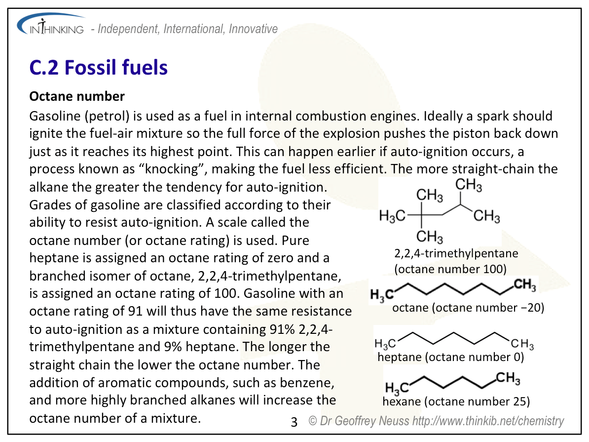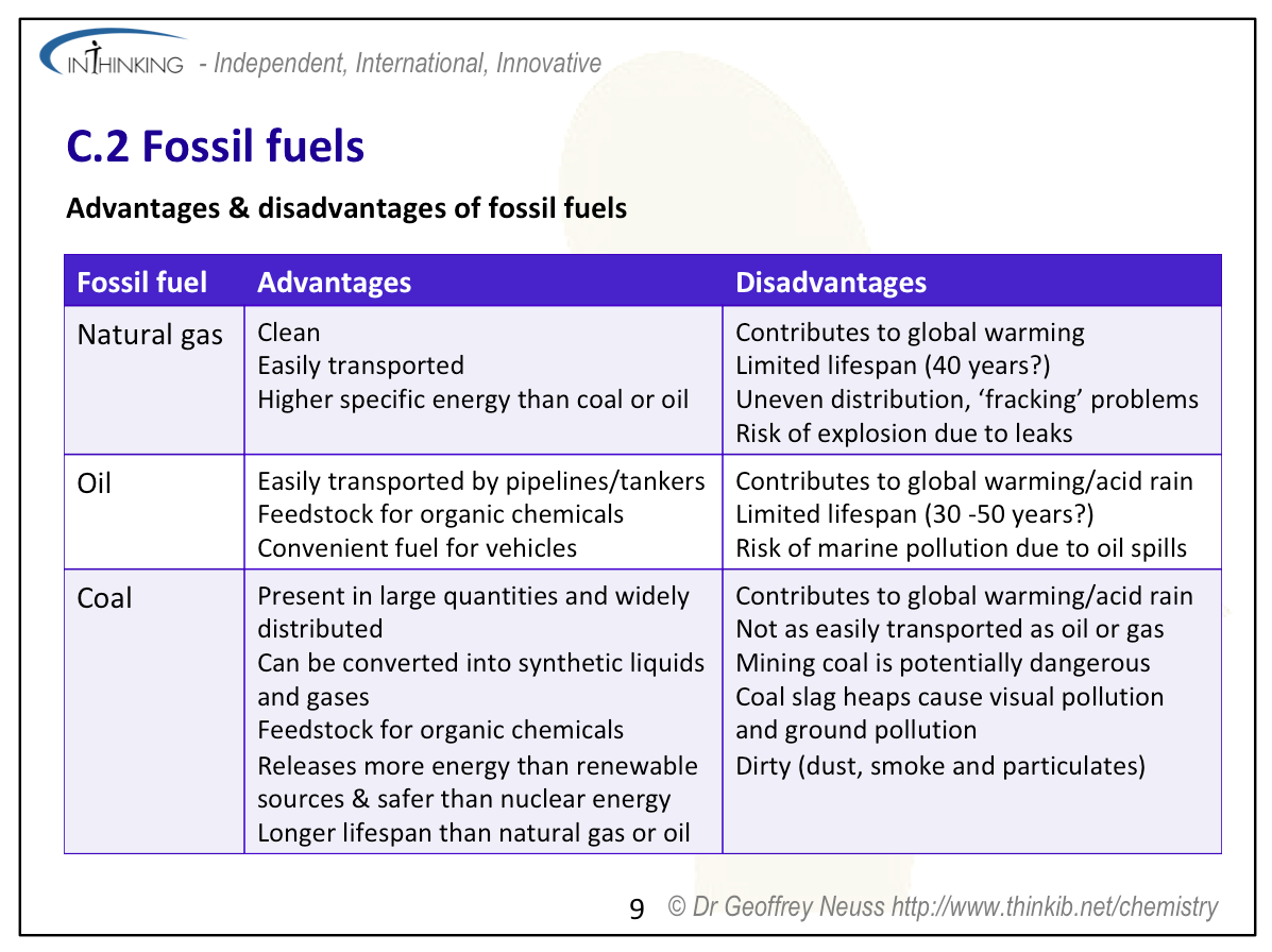 | Clarification notesThe cost of producing fossil fuels, their availability (reserves) and their impact on the environment should all be considered. International-mindednessAvailability, economic, societal, environmental and technological factors all help to determine which fossil fuels are used by different countries. Different countries use different fuel rating systems (e.g. RON, MON or PON). International cooperation and agreement is required over issues concerning ocean drilling, oil pipelines and oil spills. |