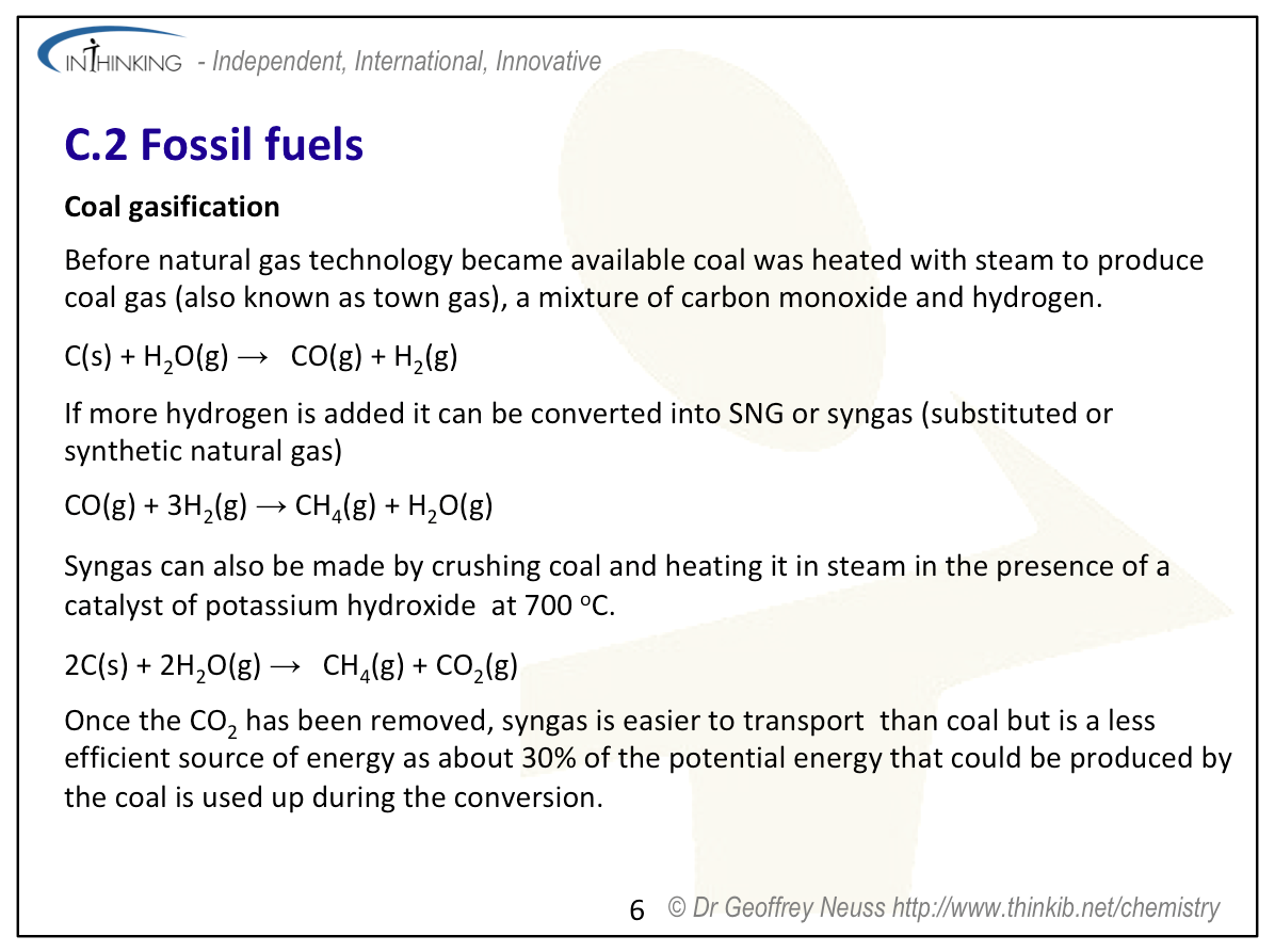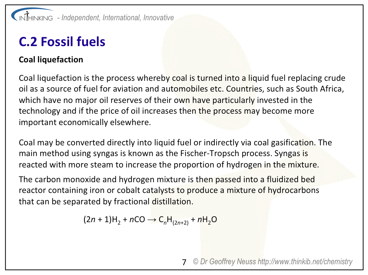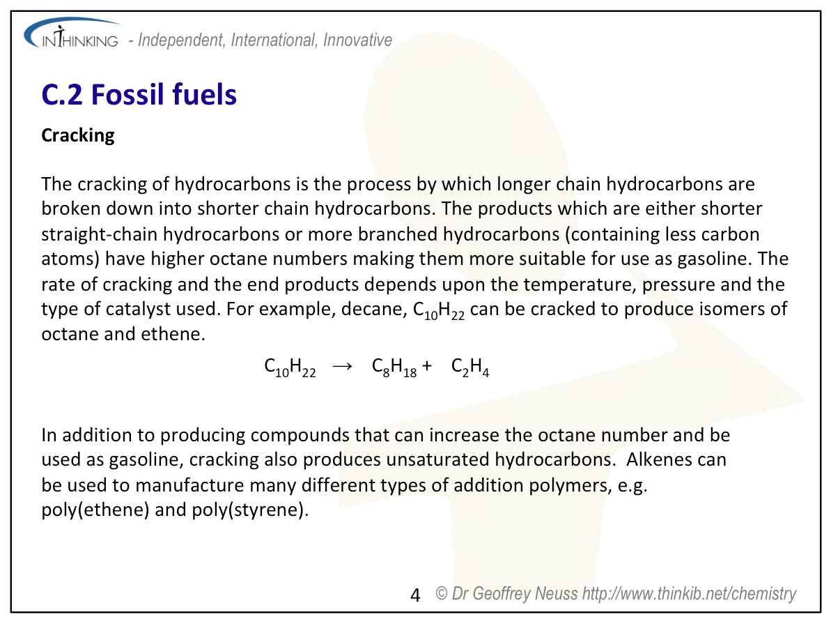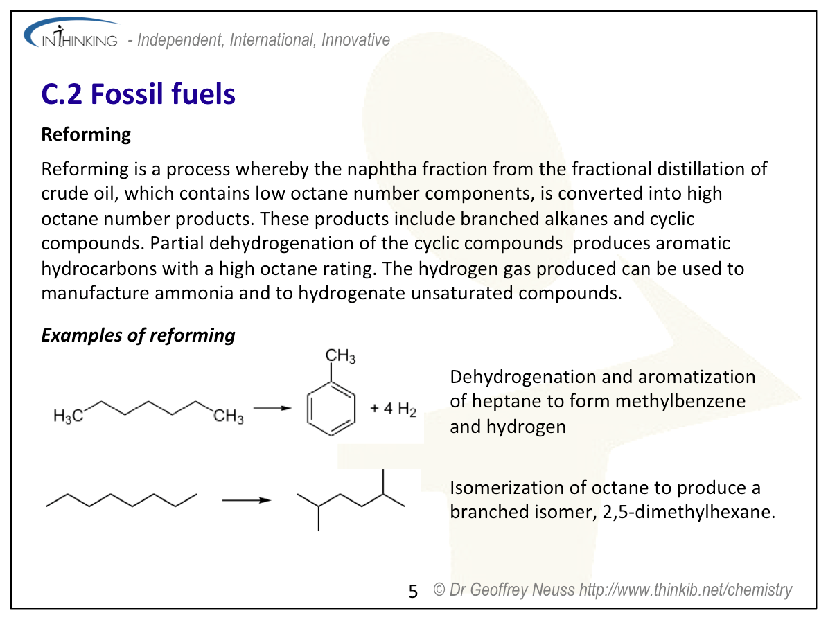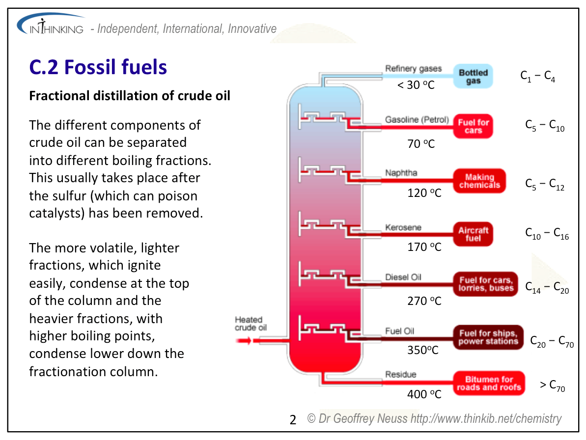 Teaching tipsWhen discussing the origin of fossil fuels explain that they contain sulfur due to the cysteine and methionine residues present in the proteins that formed part of the original biological materials. Sulfur poisons catalysts and hence must be removed before raw petroleum can be properly refined. The reserves of available fossil fuels, although finite, are hard to quantify precisely as new technologies become available to aid in their extraction (e.g. hydraulic fracturing also known as ‘fracking’). Explain the fractional distillation of crude petroleum and the properties and uses of the different fractions. Octane rating is explained in “Pause for thought’ above and this can lead on to one of the main reasons for cracking and reforming. Get students to deduce the equations for these processes so that they can see that alkenes (used for plastics) are also produced during cracking and hydrogen (for use in the Haber process and hydrogenation reactions) in the aromatization process of reforming. The equations for coal liquefaction and gasification also need to be covered. Mention too carbon capture to help prevent the release of carbon dioxide from fossil fuel power stations. Students will need practice at octane rating calculations and also calculating the amount of carbon dioxide produced from combusting different fuels in order to work out carbon footprint contributions. | Study guidePages 142 & 143 QuestionsFor ten 'quiz' questions (for quick testing of knowledge and understanding with the answers explained) see MC test: Fossil fuels. For short-answer questions see Fossil fuels questions together with the worked answers on a separate page Fossil fuels answers. Vocabulary list:cracking Practical work |
