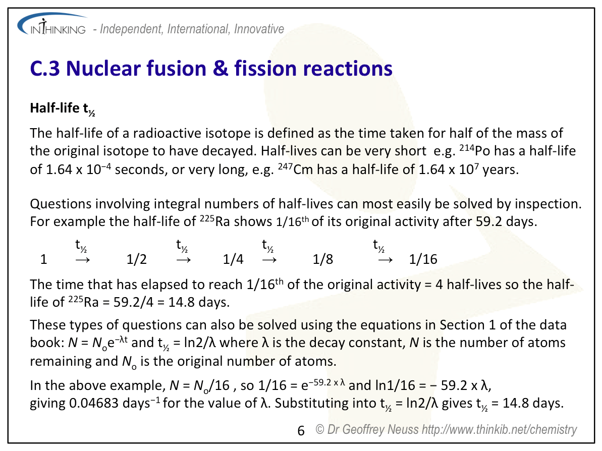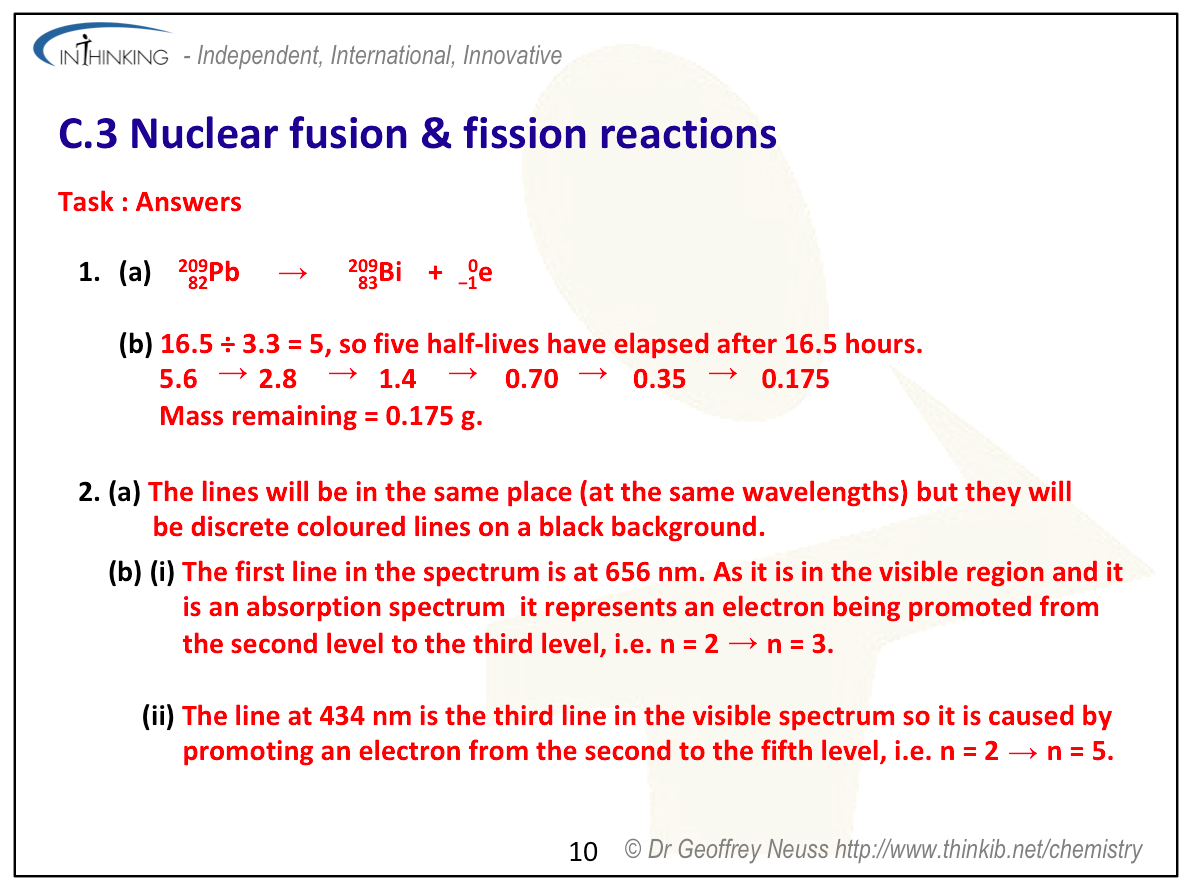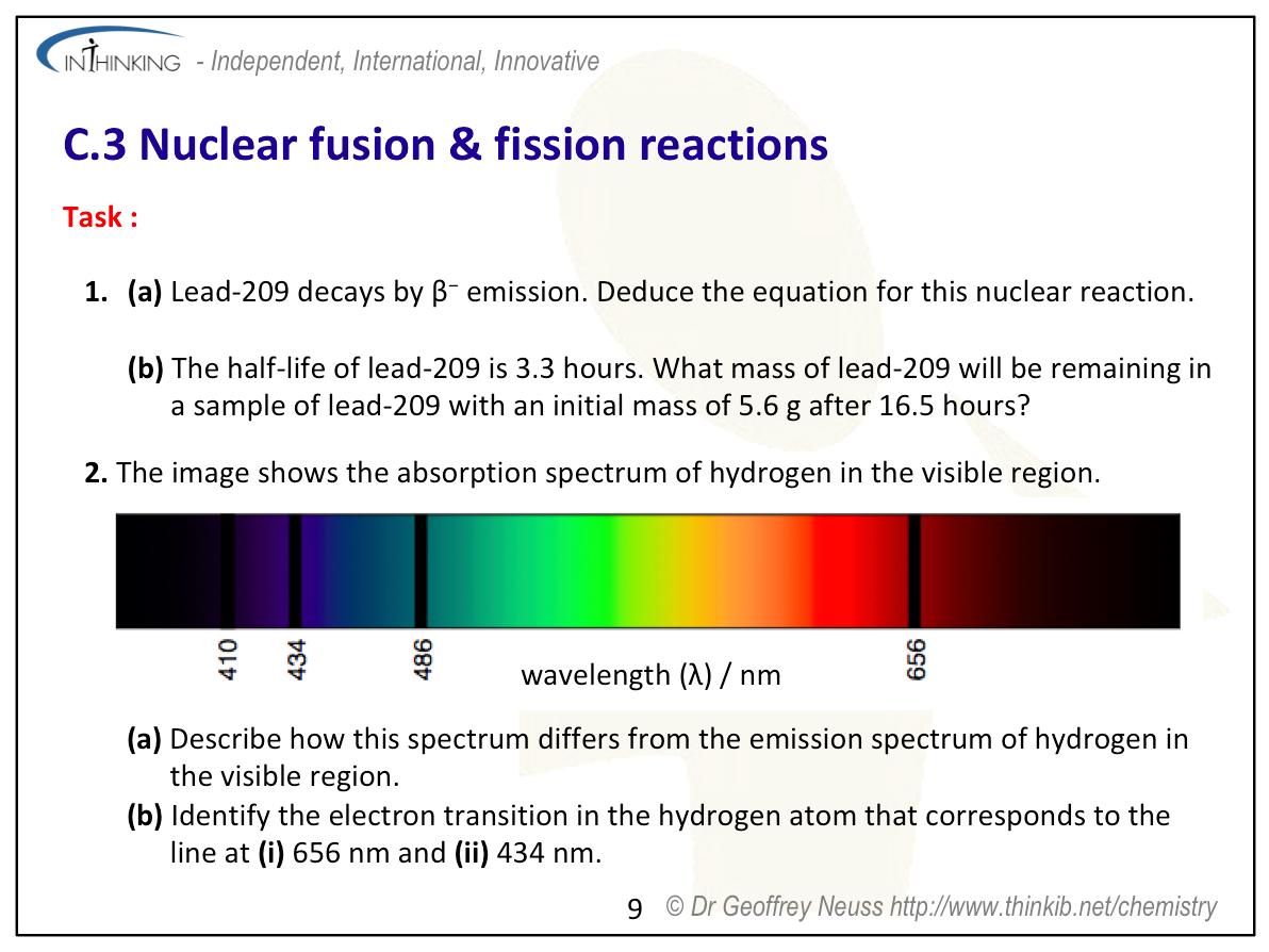 Teaching tipsIt is probably best to start this topic by looking at how the nuclear binding energy varies according to mass number. Although this is covered more fully in the AHL sub-topic C.7 students can see that the lighter elements below iron will tend to fuse to form heavier nuclei and the heavier elements above iron will tend to undergo fission to produce two or more lighter nuclei. Mass defect is also not covered until C.7 but students need some idea of the concept in order to see why nuclear fusion and fission are such powerful sources of energy. Isotopes have been covered in Topic 2: The nuclear atom but this will be the first time that students have come across nuclear equations. Give them plenty of practice at balancing these once they know the reactants and products and also deducing and balancing the products (or reactants) if they know the type of reaction taking place. In Topic 2: Electron configuration students will also have learned that each element has a unique emission spectra. You can revise this and build upon it to explain how the lines in the absorption spectra of stars can be used to identify the presence of specific elements. When introducing half-life I give them examples that they can solve by inspection first (i.e. using integer multiples of the half-life) so that they understand how it only takes a small number of half-lives before the percentage of the initial radioactive isotope is considerably reduced. Then introduce them to the equations. Three relevant equations are actually given in Section 1 of the data booklet but if they know t½ = 0.693/ λ and N = Noe−λt and how to use them they should be able to solve any half-life problems they come across. Discuss low-level and high-level nuclear waste with examples and how the waste can be dealt with. Safety at nuclear installations takes many forms. It may well be worth getting students to do their own research and discuss these amongst themselves. They may be surprised to find that in even some of the worst accidents, e.g. Chernobyl (1986) and Fukushima Daiichi (2011), the number of deaths reported was much lower than the number of deaths due to coal mining accidents every year. | Study guide