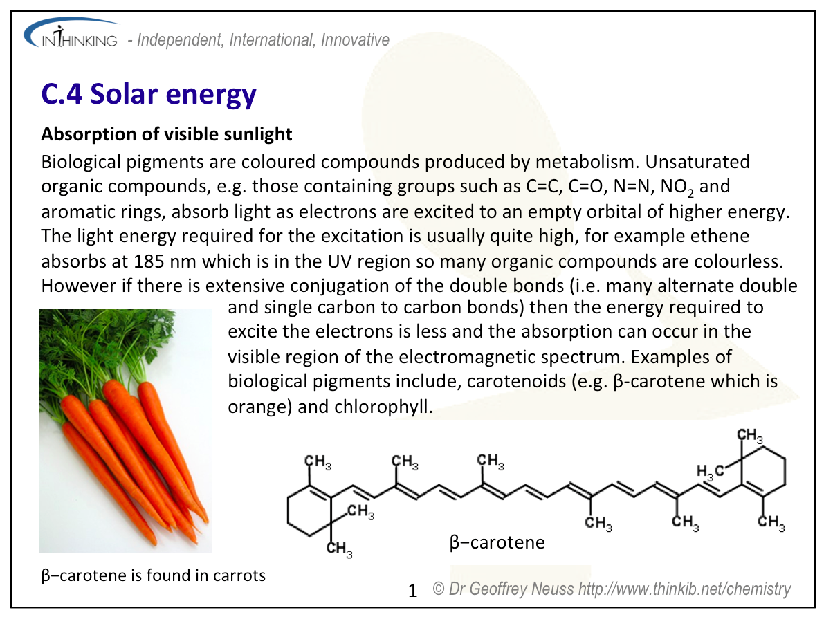 | Clarification notesThe only feature of a molecule that can absorb visible light that needs to be covered is a conjugated system with alternating double bonds. International-mindednessNothing is listed on the syllabus under this heading. |