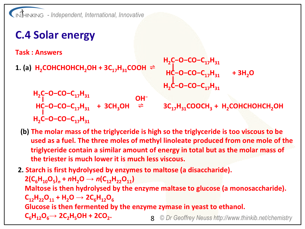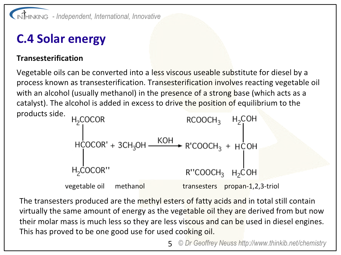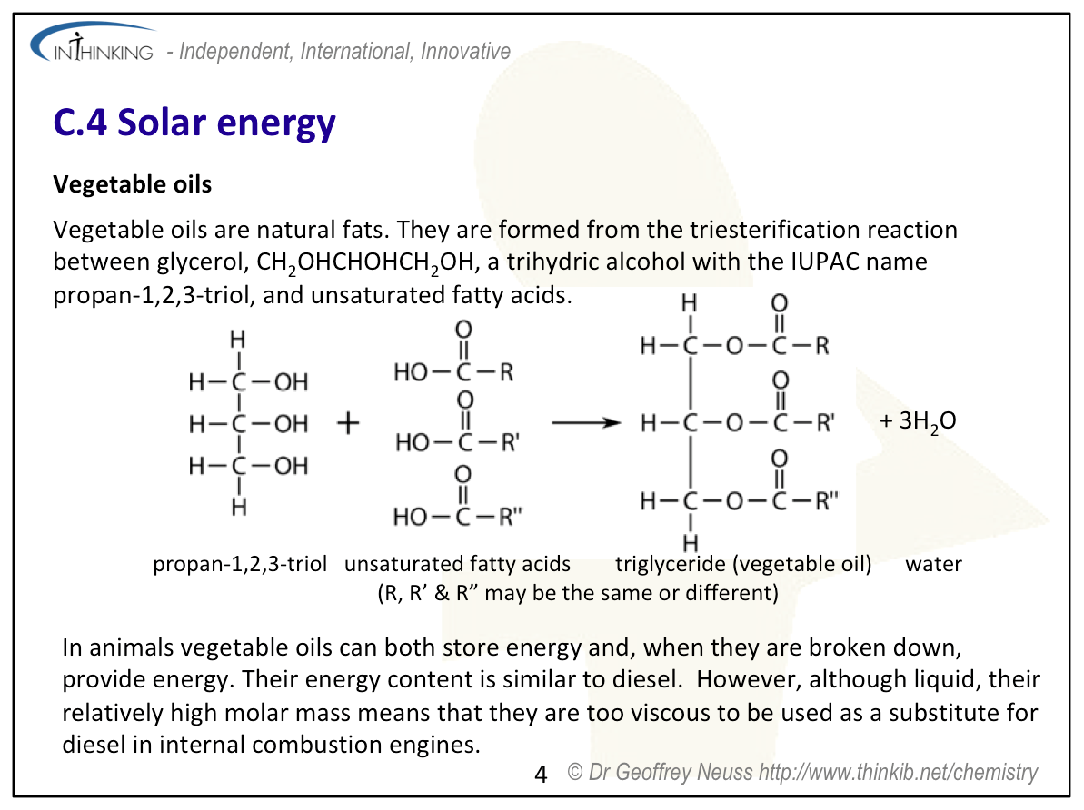 Teaching tipsThis sub-topic just concentrates on solar energy obtained through photosynthesis and is relatively straightforward. I start by making sure students understand the basics of photosynthesis, including the overall equation, and then explain that chlorophyll contains extended conjugation of alternate double and single bonds. The energy required to excite electrons in these conjugated bonds lies in the red and blue regions of the visible spectrum so chlorophyll absorbs red and blue light and transmits green light, which explains why leaves are green. The absorbed light is converted into chemical energy. The chemical energy is stored in plants and the biomass can be used directly as a fuel, e.g. wood, or it can be converted into biogas, which is mainly methane and carbon dioxide. Alternatively, the carbohydrates can be fermented by enzymes in yeast to produce ethanol, which can be used directly as a fuel or combined with gasoline (petrol) to produce gasohol. Discuss the advantages and disadvantages of using biomass as a fuel to supplement sub-topic C.1: Energy sources. Vegetable oils, which are triglycerides of propane-1,2,3-triol (glycerol) and fatty acids contain much stored chemical energy but they have high molar masses and hence low volatility so cannot be used directly as diesel fuel. Explain the basics of transesterification including the need to use excess alcohol to move the equilibrium to the product side and the need for a catalyst. Then show how it is applied to convert vegetable oils into esters with much lower molar masses, which can be used as diesel fuel as they are much more volatile. Give your students considerable practice at writing esterification and transesterification equations using triglycerides. | Study GuidePage 146 QuestionsFor ten 'quiz' questions (for quick testing of knowledge and understanding with the answers explained) see MC test: Solar energy. For short-answer questions see Solar energy questions together with the worked answers on a separate page Solar energy answers. Vocabulary listphotosynthesis |