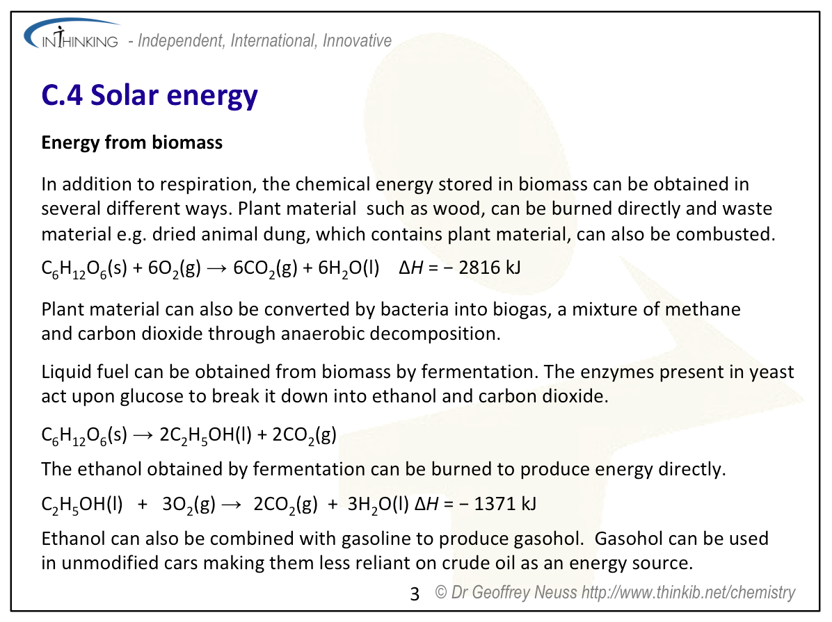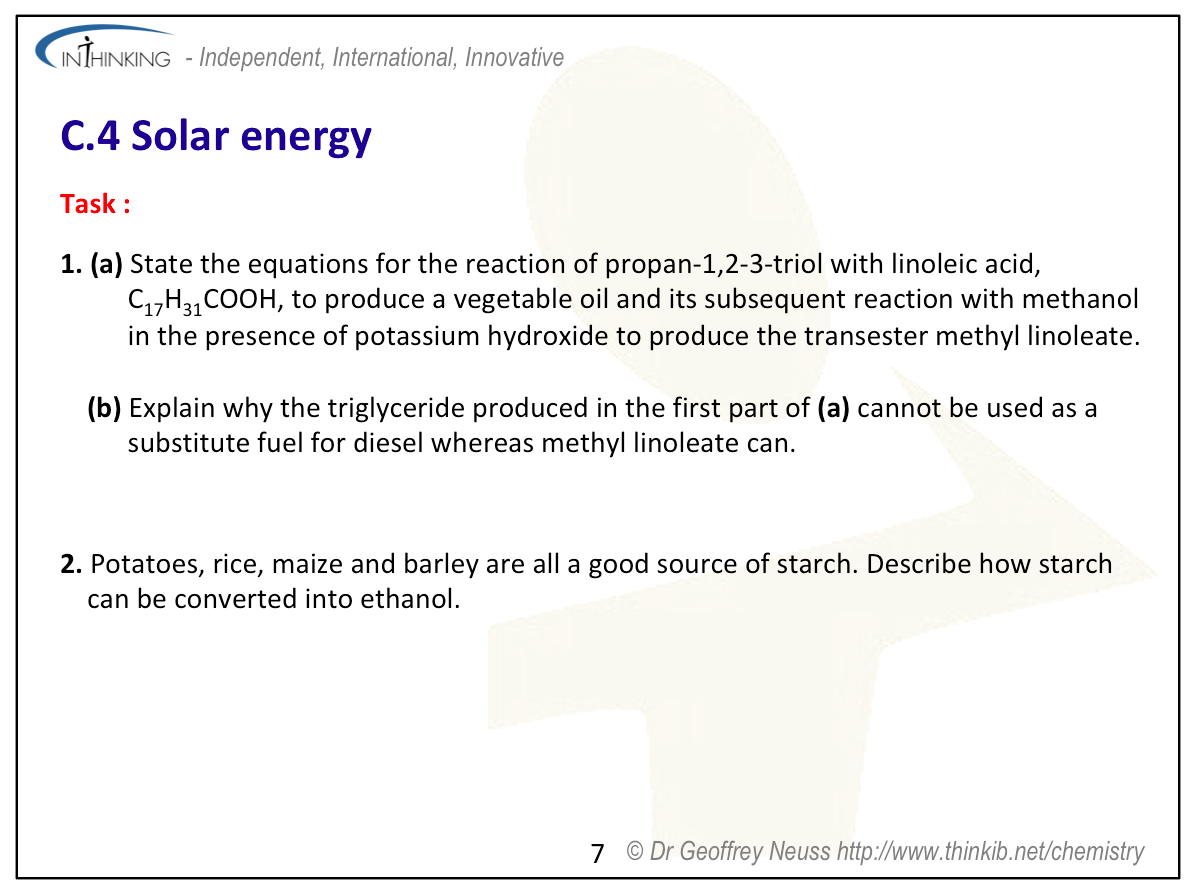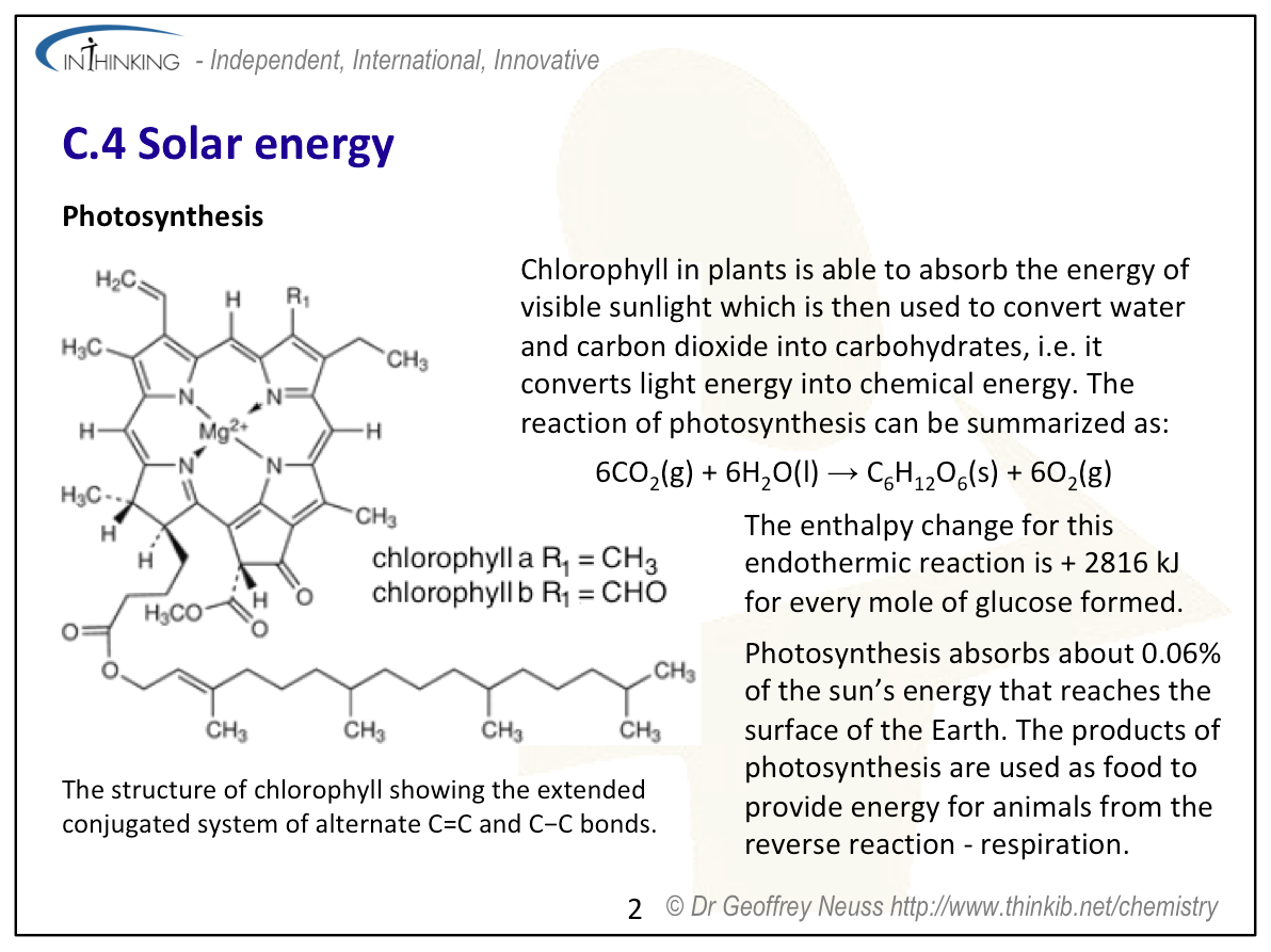 Teaching tipsThis sub-topic just concentrates on solar energy obtained through photosynthesis and is relatively straightforward. I start by making sure students understand the basics of photosynthesis, including the overall equation, and then explain that chlorophyll contains extended conjugation of alternate double and single bonds. The energy required to excite electrons in these conjugated bonds lies in the red and blue regions of the visible spectrum so chlorophyll absorbs red and blue light and transmits green light, which explains why leaves are green. The absorbed light is converted into chemical energy. The chemical energy is stored in plants and the biomass can be used directly as a fuel, e.g. wood, or it can be converted into biogas, which is mainly methane and carbon dioxide. Alternatively, the carbohydrates can be fermented by enzymes in yeast to produce ethanol, which can be used directly as a fuel or combined with gasoline (petrol) to produce gasohol. Discuss the advantages and disadvantages of using biomass as a fuel to supplement sub-topic C.1: Energy sources. Vegetable oils, which are triglycerides of propane-1,2,3-triol (glycerol) and fatty acids contain much stored chemical energy but they have high molar masses and hence low volatility so cannot be used directly as diesel fuel. Explain the basics of transesterification including the need to use excess alcohol to move the equilibrium to the product side and the need for a catalyst. Then show how it is applied to convert vegetable oils into esters with much lower molar masses, which can be used as diesel fuel as they are much more volatile. Give your students considerable practice at writing esterification and transesterification equations using triglycerides. | Study GuidePage 146 QuestionsFor ten 'quiz' questions (for quick testing of knowledge and understanding with the answers explained) see MC test: Solar energy. For short-answer questions see Solar energy questions together with the worked answers on a separate page Solar energy answers. Vocabulary listphotosynthesis |