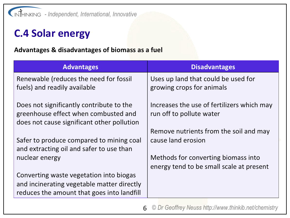 This sub-topic seems to have the wrong title! If you look at the ‘Understandings’ and Applications and skills’ you will see that they all refer to energy from biomass. It is of course true that the ultimate source of biomass energy is the sun, which provides the energy for photosynthesis to occur, but ‘Solar energy’ usually describes converting the energy directly from the sun into electricity or heat. This may be through the use of photovoltaic cells or dye-sensitized solar cells (covered in the AHL sub-topic D.8) or thermal power plants, which concentrate the sun’s heat and use it to boil water to drive a steam turbine. There is also the passive use of the sun’s energy, e.g. positioning windows on the sunny side of a building and using the sunlight to heat absorbent materials on the walls and floor. This is known as space heating.