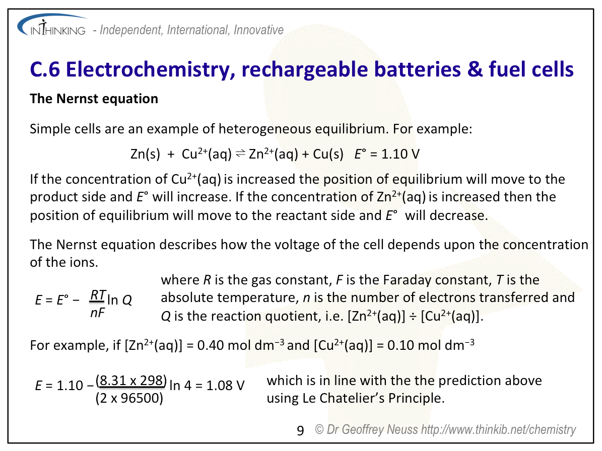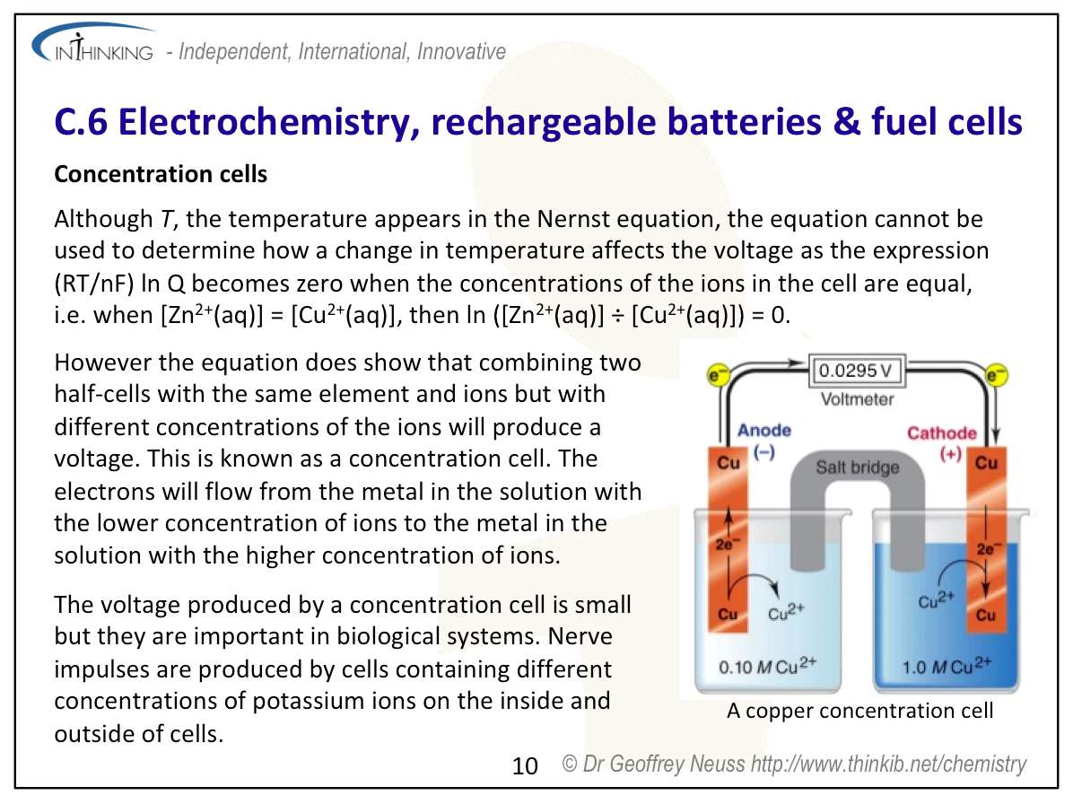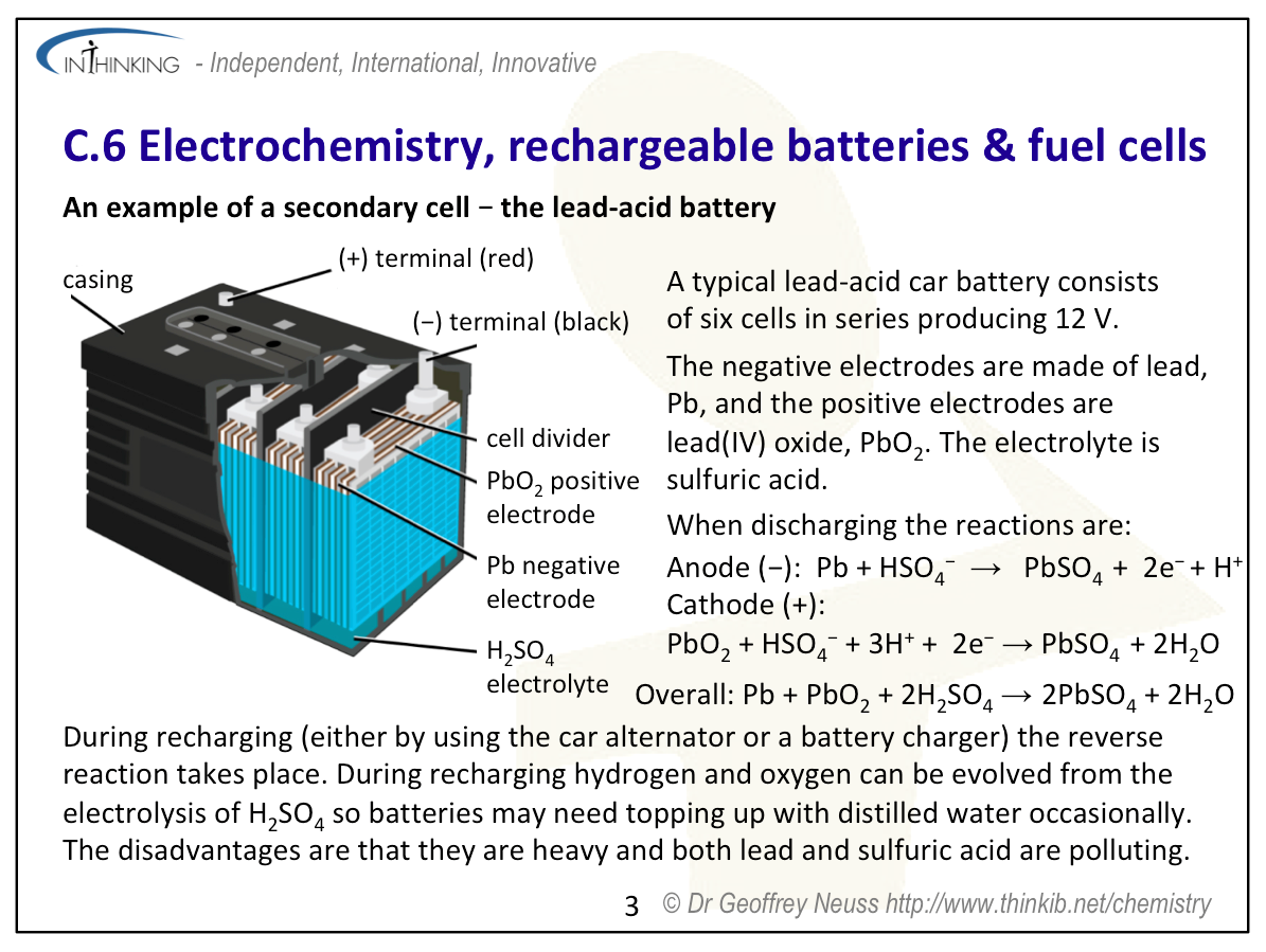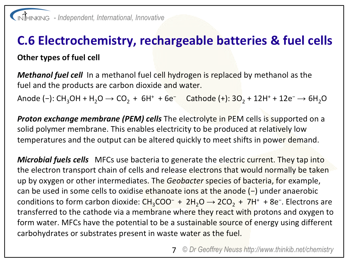 | Clarification notesConsider a battery to be a portable electrochemical source comprising of one or more voltaic (galvanic) cells connected in series. The Nernst equation is given in Section 1 of the data booklet. Consider hydrogen and methanol as fuels for fuel cells and consider the operation of fuel cells under both acid and alkaline conditions. Familiarity with proton-exchange membrane, PEM, fuel cells is expected. Use the Geobacter species of bacteria as an example that can be used in some cells to oxidize ethanoate ions, CH3COO−, under anaerobic conditions. Consider the lead–acid storage battery, the nickel–cadmium, NiCd or NiCad, battery and the lithium–ion battery. Familiarity with the half-equations at the anode and cathode and the uses of the different cells is expected. International-mindednessThe ways in which spent batteries are disposed of and/or recycled vary from country to country. |