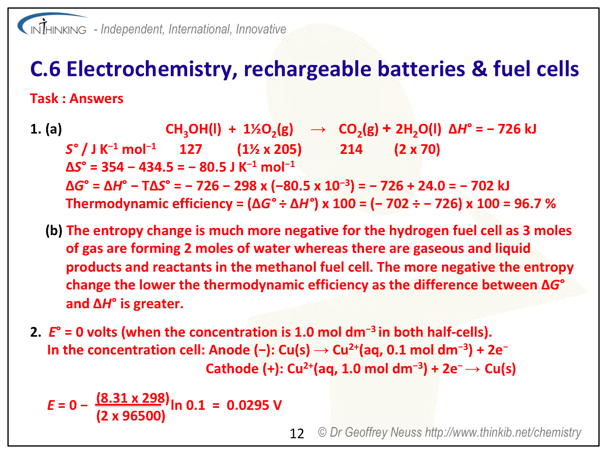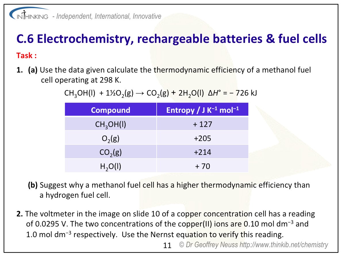 Teaching tipsThis sub-topic follows on neatly from Topics 9 & 19 from the core/AHL. Essentially it is the practical application of voltaic cells so does require some memory work as well as a deeper understanding. The key to the sub-topic is either knowing or being able to deduce the equations for the half-reactions taking place in the different types of rechargeable batteries and fuel cells. I start by revising how voltaic cells work and how to calculate the electromotive force for the whole cell (EMF or E⦵total) from the standard electrode potentials of the two half-cells. Then go into the specific details for the lead-acid, Ni/Cd and Li-ion rechargeable batteries. Students should realise that when batteries recharge the reaction occurring is the reverse of when it discharges. Fuel cells are expensive but have considerable potential. Start with the hydrogen fuel cell and stress that the same overall reaction occurs irrespective of whether the electrolyte is acidic or alkaline but that the half-reactions are different. When methanol is used as the fuel carbon dioxide and water are the products of oxidation. However if the oxidation is carried out anaerobically, as in a microbial fuel cell, then carbon dioxide, hydrogen ions and electrons are formed instead. By using a membrane to allow the passage of the hydrogen ions and the external circuit to allow the flow of electrons a microbial fuel cell can be used to provide a sustainable energy source using waste water and bacteria. Explain the thermodynamic efficiency of a fuel cell including why, in the hydrogen fuel cell, ΔG⦵ is smaller in quantitative value than ΔH⦵ as work needs to be done to overcome the negative entropy change when gaseous hydrogen and oxygen turn into liquid water. One way to ensure they fully understand this is to get them to work out the value for ΔS⦵ (see 2(d) in the questions). The syllabus states that the Nernst equation can be used to calculate the potential of a half-cell in an electrochemical cell, under non-standard conditions. This is not strictly true. It can be used to calculate the potential for non-standard concentrations but not when just the temperature is changed as then the expression – (RT / nF) ln Q = 0. Give your students plenty of practice at working out the EMF for cells with different concentrations including concentration cells (where only the concentration of the ions in the solutions of otherwise identical half-cells changes). | Study GuidePage 163 QuestionsFor ten 'quiz' questions (for quick testing of knowledge and understanding with the answers explained) see MC test: Electrochemistry, rechargeable batteries & fuel cells. For short-answer questions see Electrochemistry, rechargeable batteries & fuel cells questions together with the worked answers on a separate page Electrochemistry, rechargeable batteries & fuel cells answer . Vocabulary listNernst equation Practical work