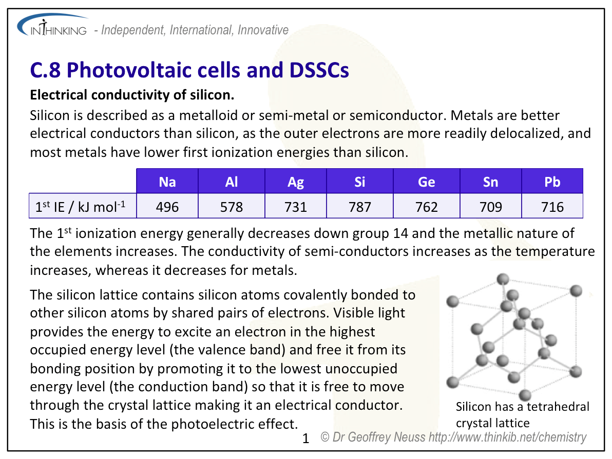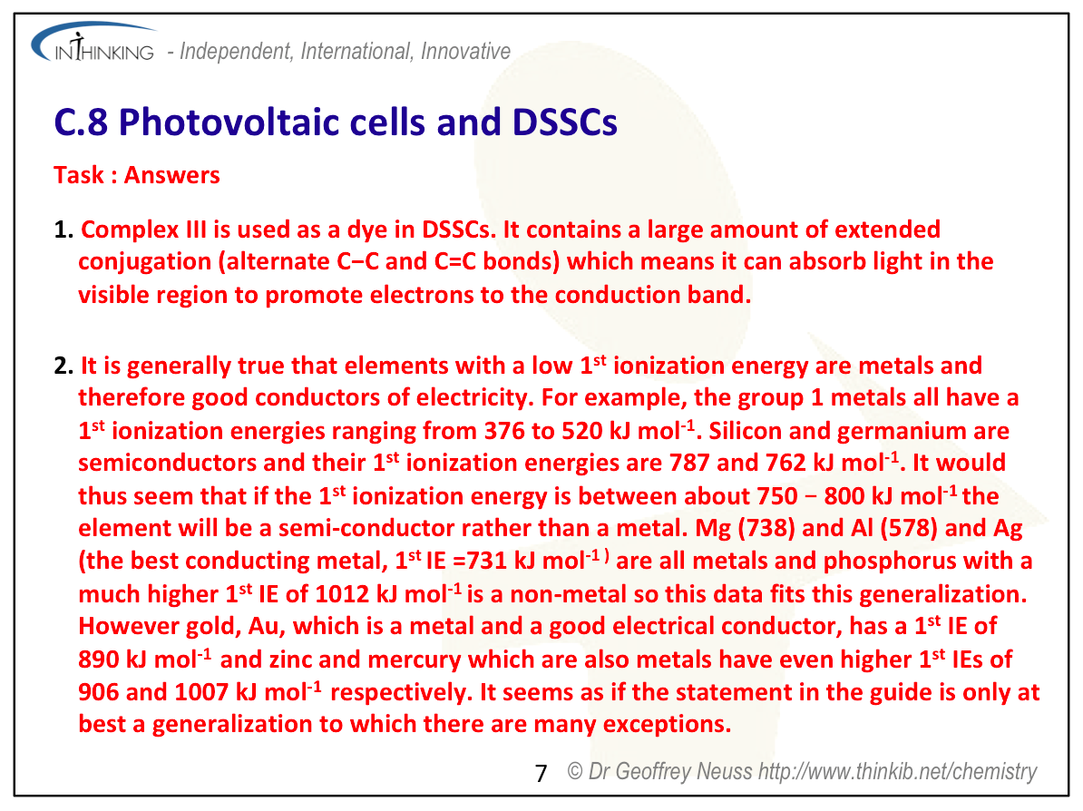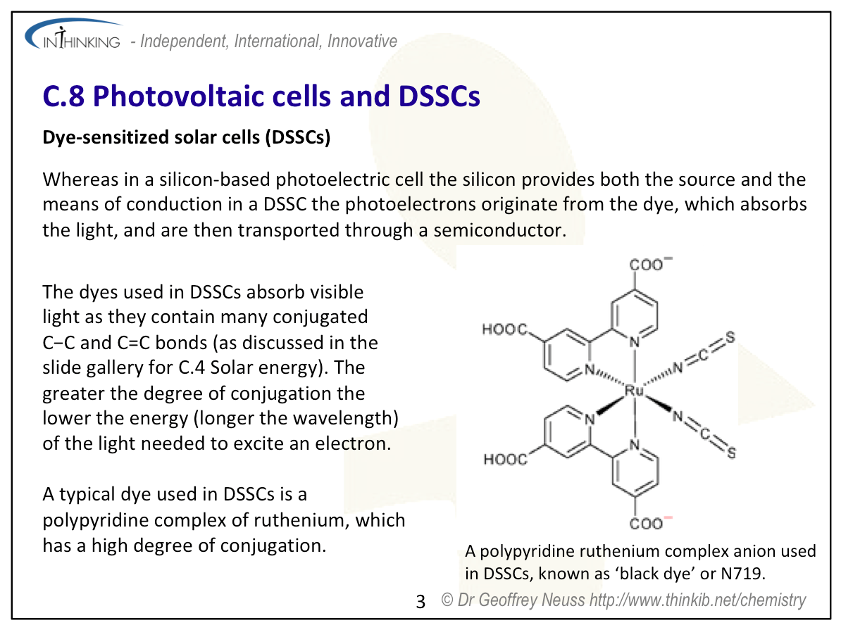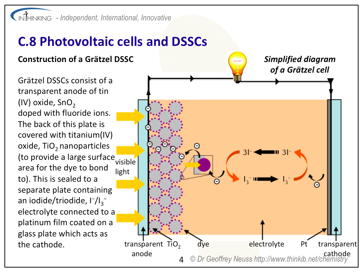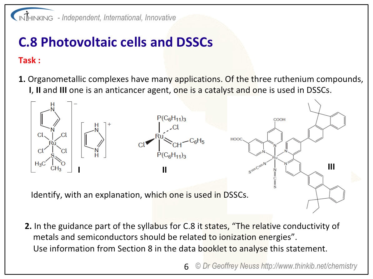 Teaching tipsThis is a mainly a factual sub-topic based more on explanation and memory as there are no quantitative aspects to it. Explain that organic molecules containing a pi bond absorb light in the ultraviolet region as an electron is excited to a pi* anti-bonding orbital. As the amount of conjugation (delocalization) increases the pi* anti-bonding orbital becomes lower in energy so light of longer wavelength is absorbed. The dyes used in DSCCs contain extensive conjugation so absorb light in the visible region. The photoelectric effect and the doping of silicon to increase the conductivity are well known. Dye-sensitized solar cells have been around since 1972 although the low cost Grätzel cell was not invented until 1988. Students will need to understand the function of each component of a Grätzel cell and be able to write equations for the redox reactions that occur between iodide and triiodide ions in the electrolyte. Because they are low cost you might wish to experiment with a DSSC as part of your non-mandatory practical programme (see video below and the article by J.Twiddle and others published in the School Science Review). Stress the main operating difference between DSSCs and silicon based photoelectric cells. In the DSCCs the production of the photoelectrons by absorption of light is separate to the separation of the charges leading to the current produced (which is why it is said to mimic the photoelectric effect) whereas in silicon cells these two process occur together in the silicon semiconductor. It is worth getting your students to challenge the statement in the clarification notes as to whether the conductivity of metals is related to ionization energies. Firstly ionization energies refer to the gaseous state whereas conductivity normally refers to the solid state . Secondly silver (1st ionization energy 731 kJ mol-1), which is the best conducting of all metals, has a higher first ionization energy than many metals that are much poorer conductors, e.g lead (1st ionization energy 716 kJ mol-1). | Study Guide:Page 152 QuestionsFor ten 'quiz' questions (for quick testing of knowledge and understanding with the answers explained) see MC test: Photovoltaic cells & DSSCs. For short-answer questions see Photovoltaic cells and DSSCs questions together with the worked answers on a separate page Photovoltaic cells and DSSCs answers. Vocabulary listphotoelectric effect Practical work |