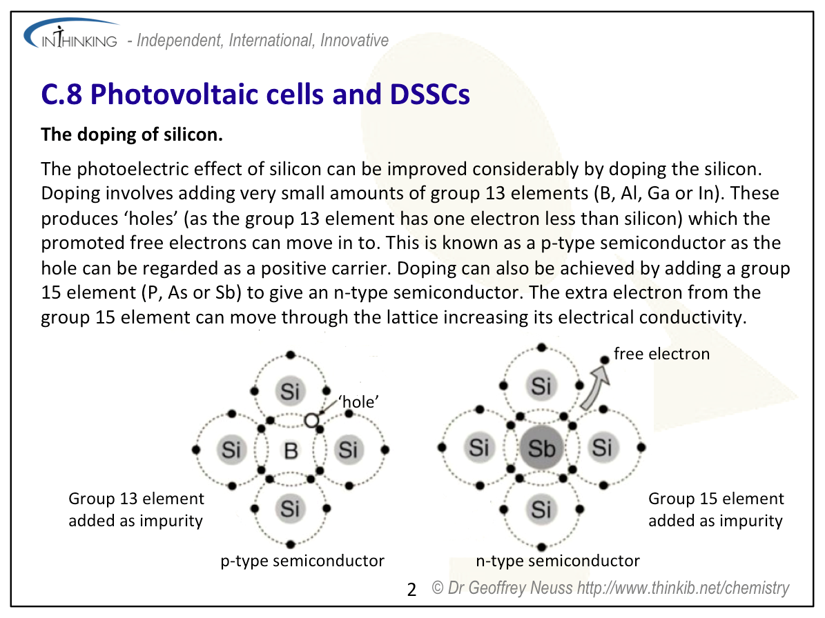 | Clarification notesRelate the relative conductivity of metals and semiconductors to ionization energies. Only a simple treatment of the operation of the cells is required. Introducing a small amount of a group 13 element in p-type semiconductors creates electron holes in the crystal. The inclusion of a group 15 element in n-type semiconductors provides extra electrons. In photovoltaic cells the light is absorbed and the charges separated in the silicon semiconductor. In dye-sensitized solar cells the processes of absorption and charge separation are separated. Specific redox and electrode reactions taking place in the newer Grätzel DSSC should be covered. An example is the reduction of I2/I3─ ions to I─. International-mindednessCountries with good supplies of sunlight and unused land have the potential to improve economically by harnessing solar energy efficiently. |