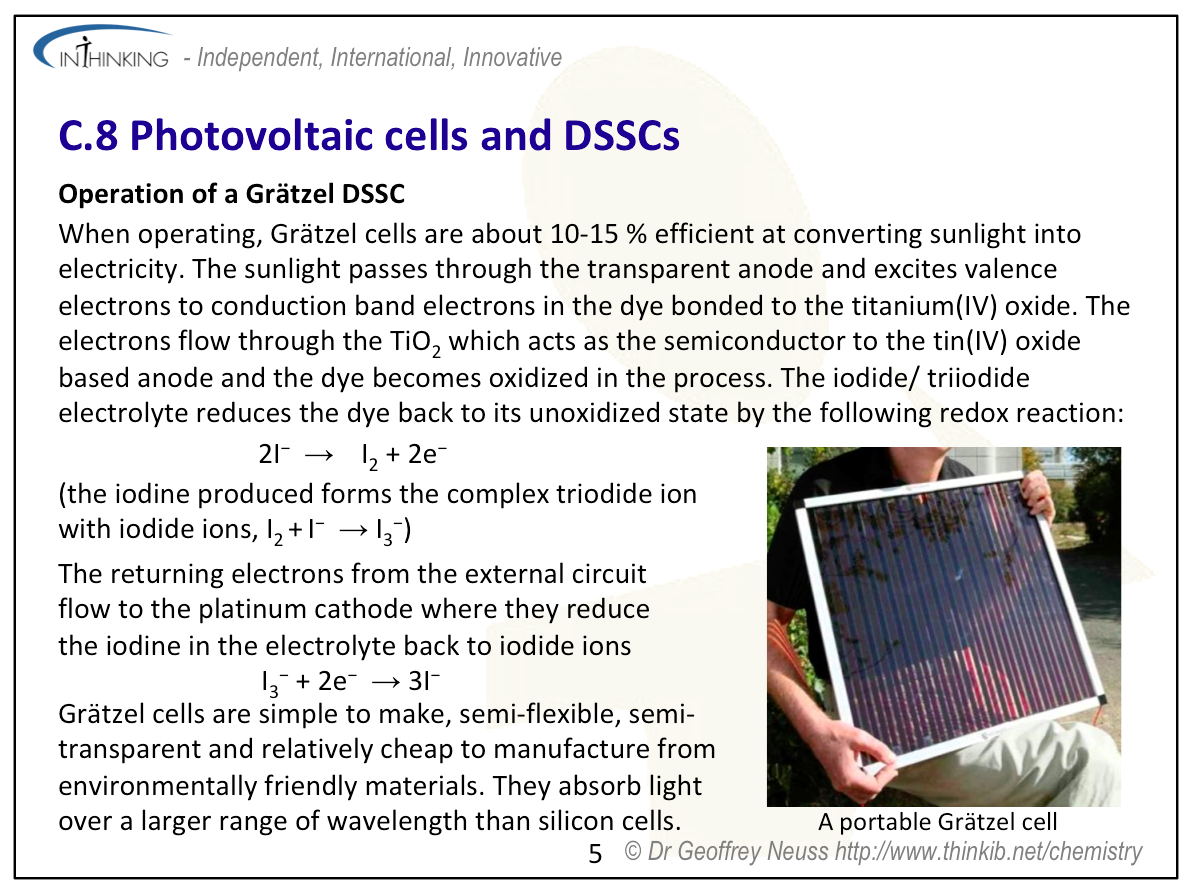 C.8 Photovoltaic cells and dye-sensitized solar cells (DSSCs) (3 hours)