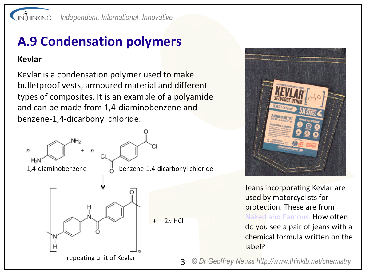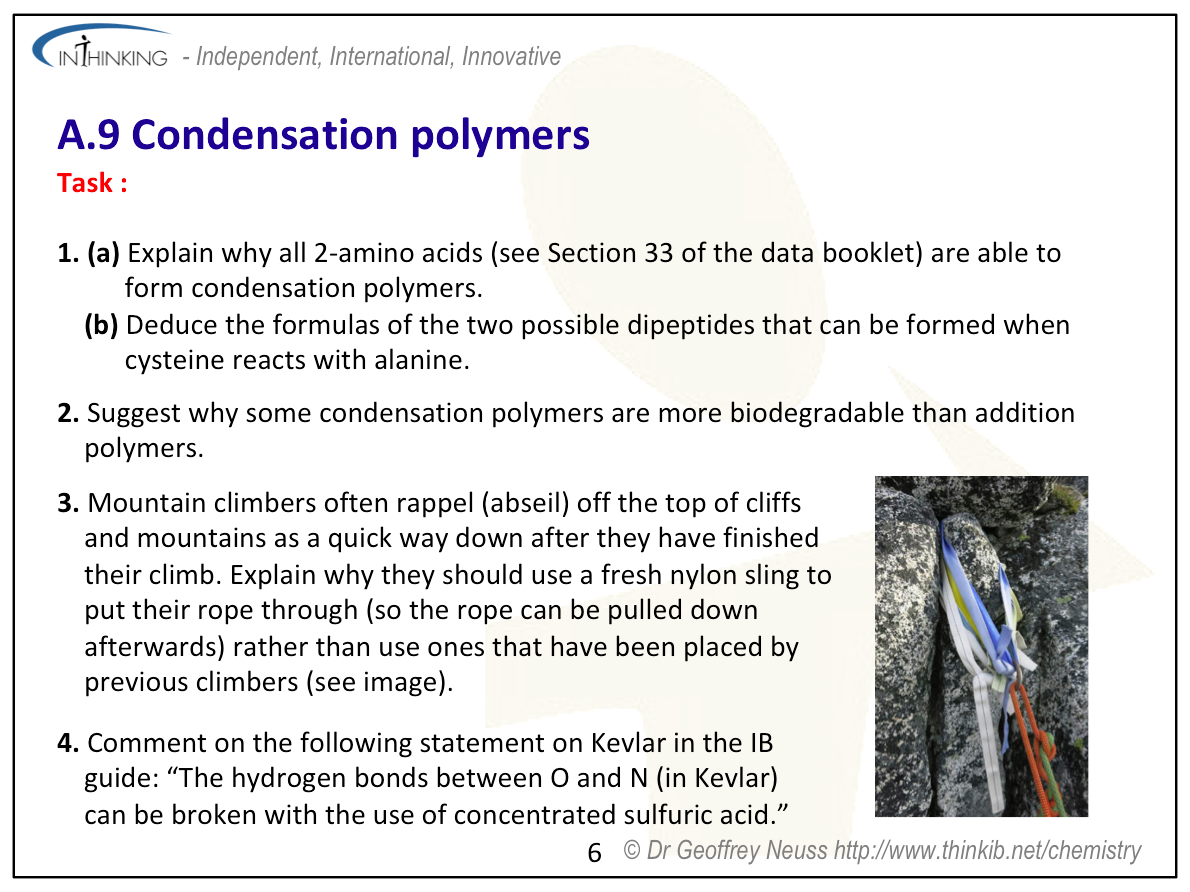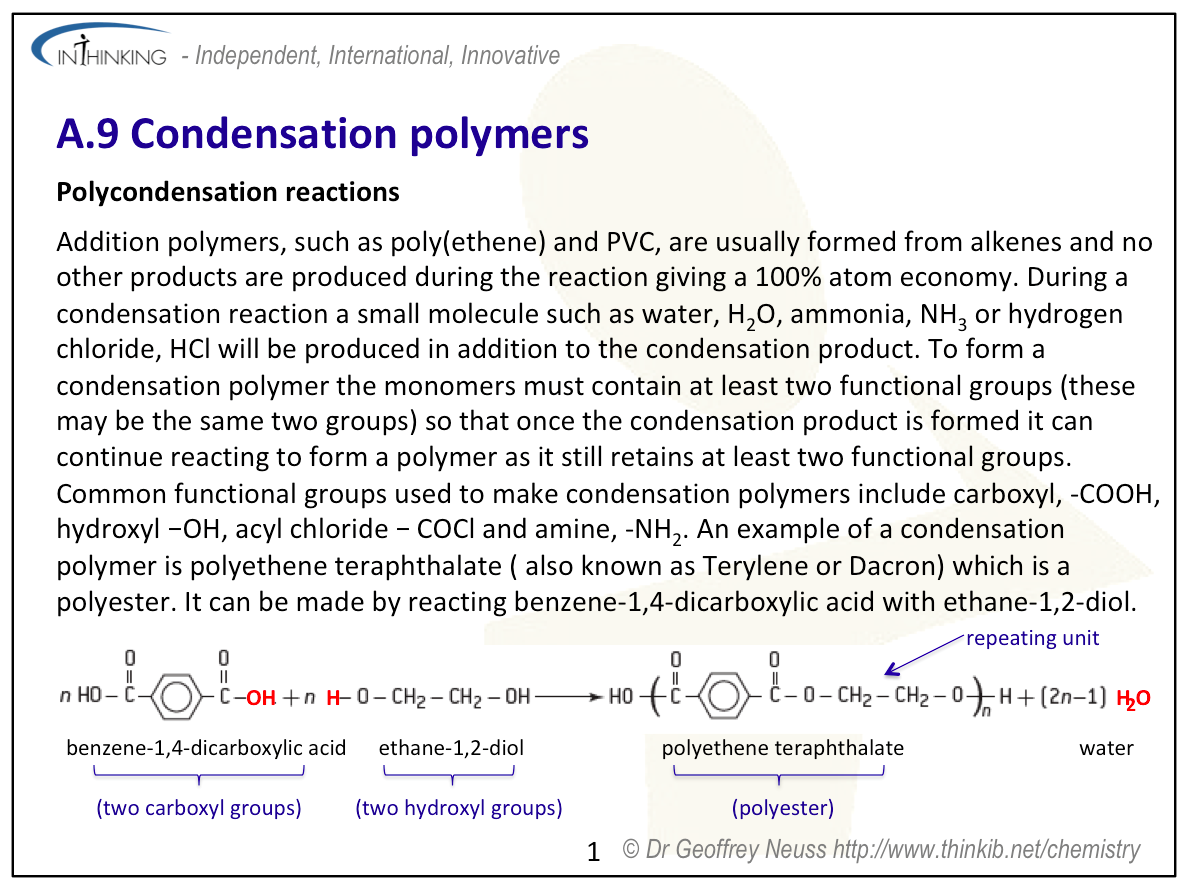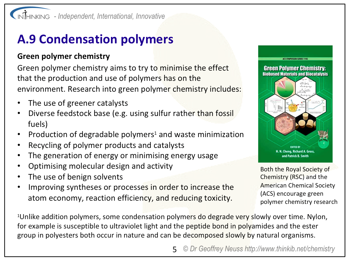 | Clarification notesInclude green chemistry considerations of forming and using polymers. International-mindednessWhat are the roles of science, economics and politics in the research and development of new polymers? |