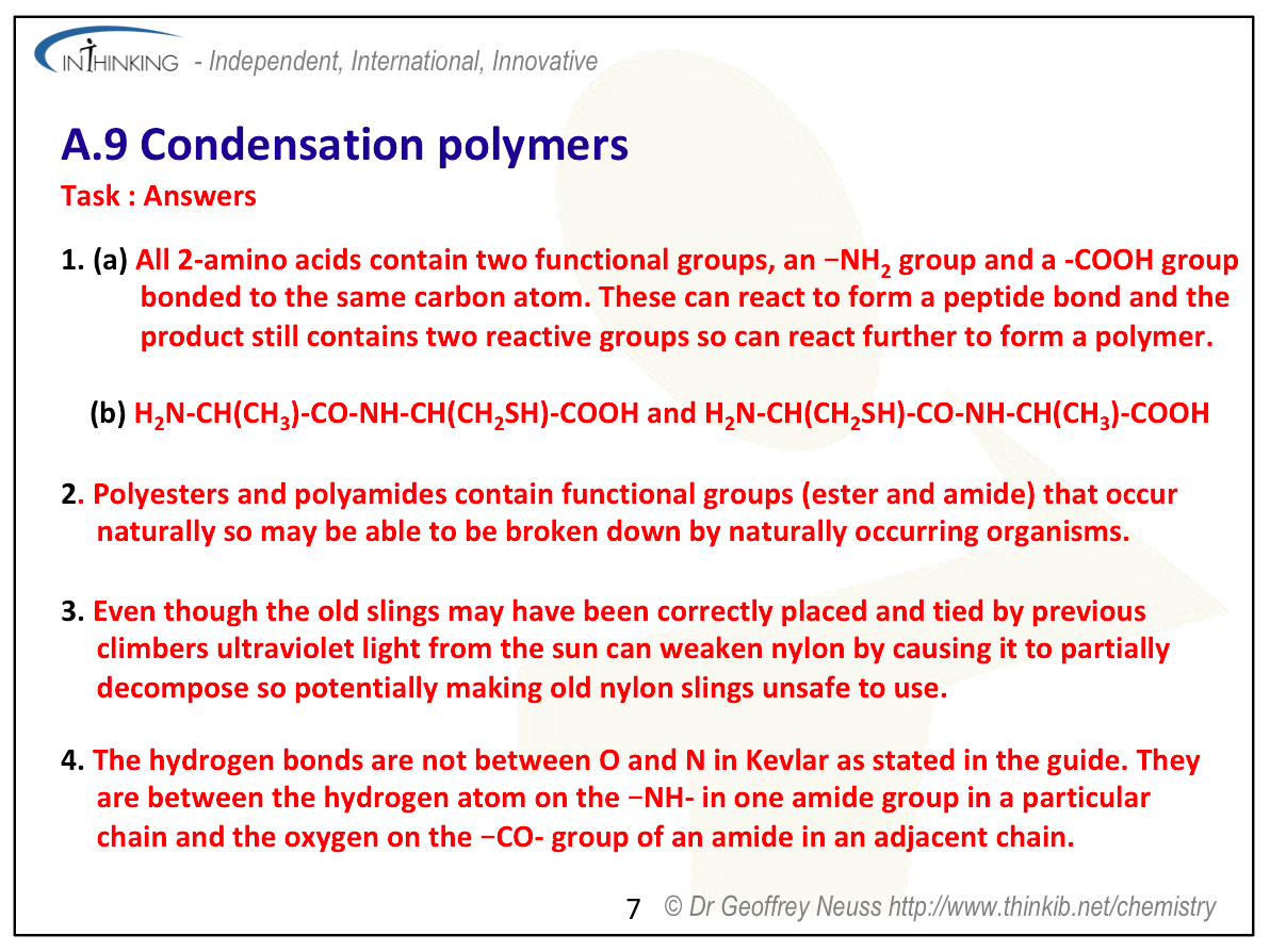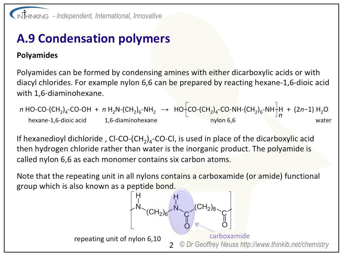 Teaching tipsThis is a very straightforward sub-topic to teach. Students need to be aware of the difference between an addition polymer and a condensation polymer and realise that to form a condensation polymer both monomers must contain at least two reactive functional groups. The classic two cases are the polymerisation of dicarboxylic acids with diols to form polyesters and the polymerisation of diamines with dicarboxylic acids or diacyl chlorides to form polyamides. If students understand which bonds are broken to form the polyester and polyamide links then they should be able to draw the repeating unit of the polymer. They should also be able to deduce the balanced equation for the reaction when n molecules of one monomer are reacted with n molecules of another molecule and realise that the balanced equation will contain (2n-1) molecules of the inorganic product which is usually water or hydrogen chloride. Use poly(ethyl benzene-1,4-dicarboxylate) (also known as polyethylene teraphthalate, PET, PETE, Terylene or Dacron) as an example of a polyester and it can be fun for students to make their own nylon 6,6 as an example of a polyamide. You will need to discuss the structure and cross-linking that can occur in Kevlar due to the hydrogen bonding between the oxygen of one peptide bond with a hydrogen atom attached to the nitrogen atom of another peptide bond. This results in a very ordered and strong three-dimensional structure. In strong acid solution the oxygen and nitrogen atoms in the amide linkage become protonated. This means they can no longer form hydrogen bonds so it leads to the breakdown of the cross-linkage and so weakens the strength of the Kevlar (see 'Pause for thought' above). Finally relate the formation of condensation polymers to green chemistry by calculating the atom economy (see Environmental impact - plastics) | Study GuidePage 120 QuestionsFor ten 'quiz' questions (for quick testing of knowledge and understanding with the answers explained) see MC test: Condensation polymers. For short-answer questions see Condensation polymers questions together with the worked answers on a separate page Condensation polymers answers. Vocabulary listcondensation polymerisation Practical work |