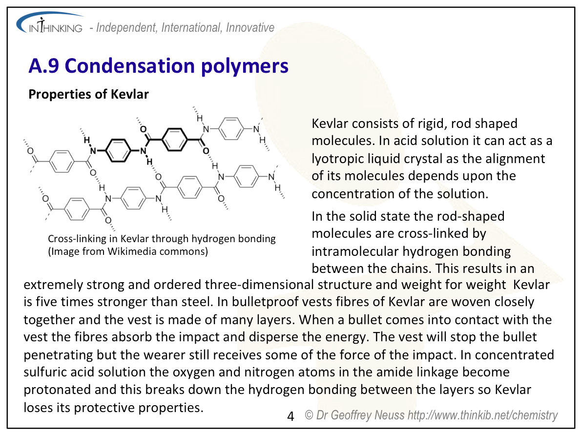 One of the problems of polyamides like Kevlar is that they can be hydrolysed back to their monomers by acid solution. For this reason it is not a good idea to let car battery acid come into contact with materials made of nylon (such as climbing ropes). Kevlar is in fact more resistant to hydrolysis than nylon but concentrated sulfuric acid will break down the hydrogen bonding cross-links in Kevlar and severely weaken the structure. The syllabus states” The hydrogen bonds between O and N can be broken with the use of concentrated sulfuric acid”. This of course is not strictly true. The hydrogen bonds are not between the oxygen and nitrogen atoms but between the oxygen atoms of peptide linkages and the hydrogen atoms covalently bonded to the nitrogen atoms belonging to adjacent peptide linkages.