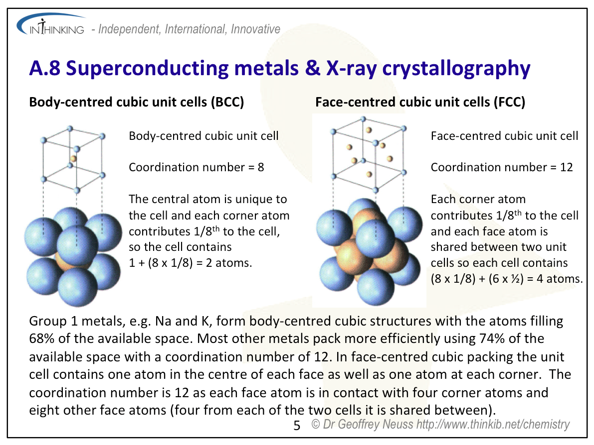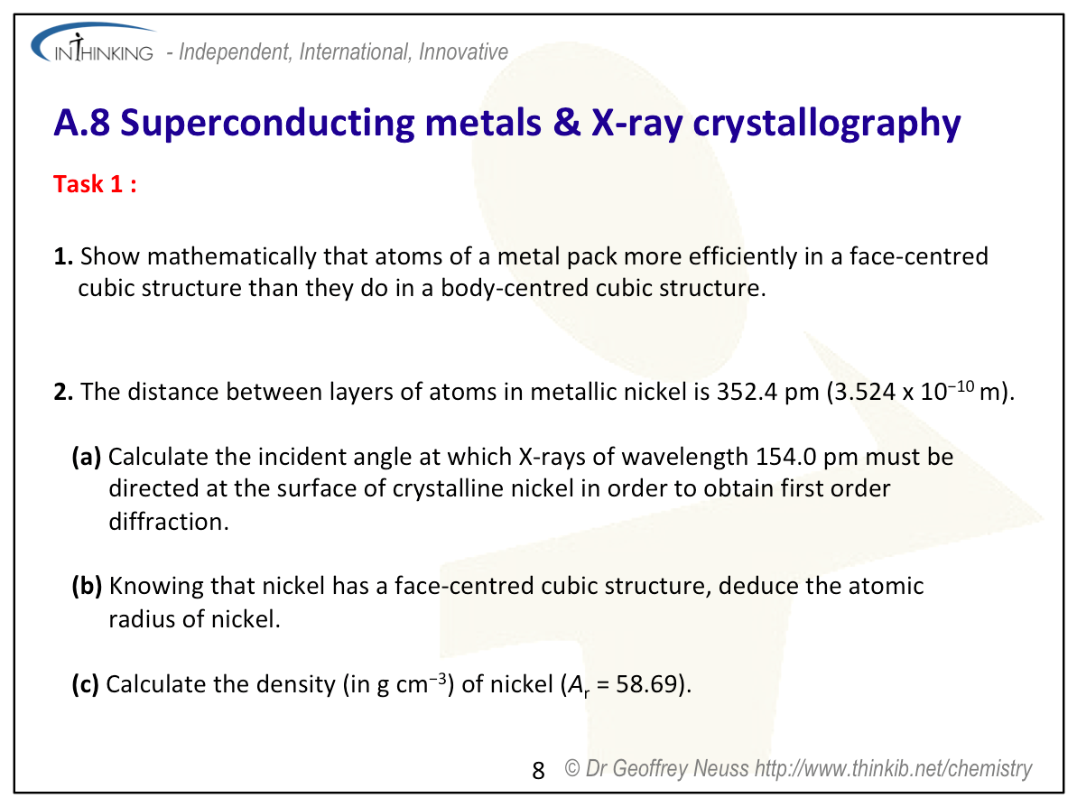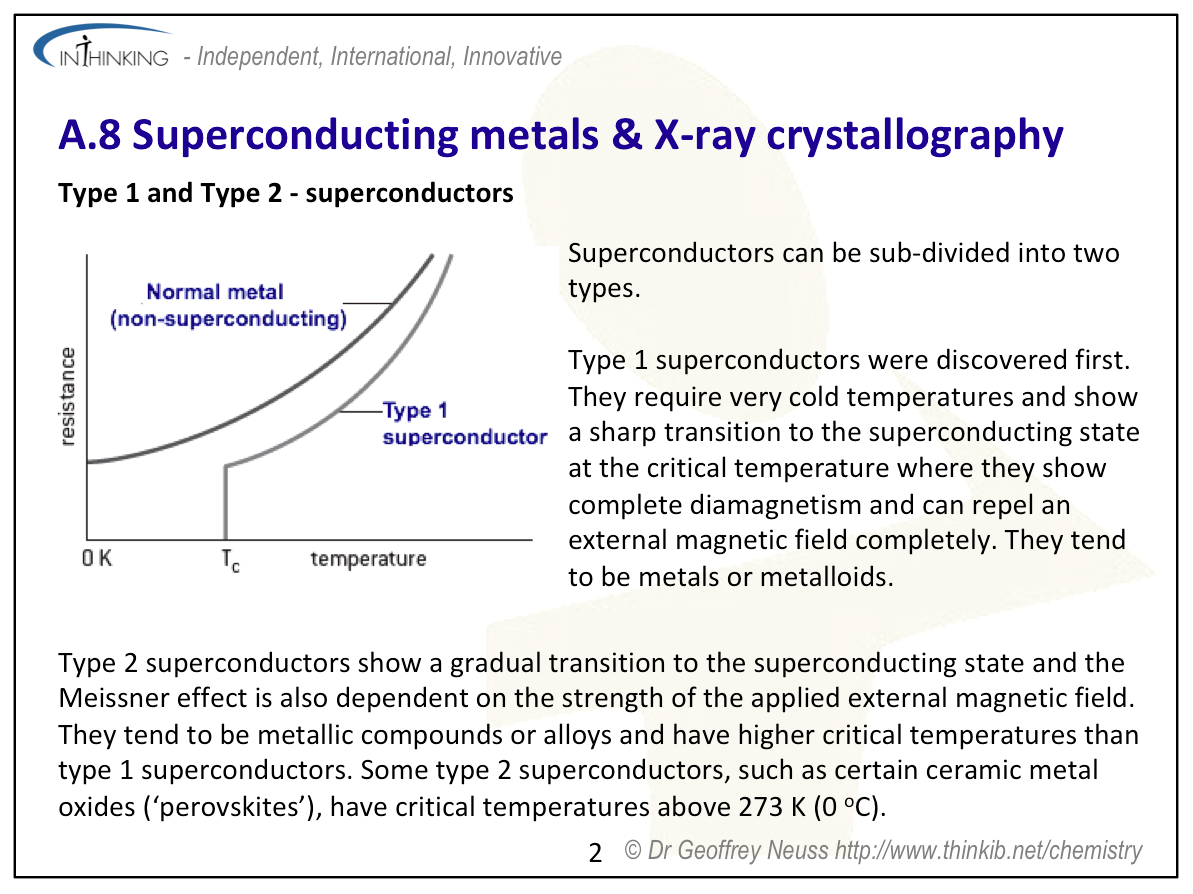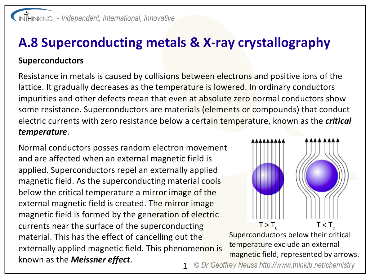 Teaching tipsThis is another sub-topic where there is considerable overlap with physics and it may be worth talking with your physics colleagues about their approach to teaching superconductivity. In a sense there are two separate topics contained within this sub-topic - superconductivity and X-ray crystallography. The syllabus coverage of superconductivity is confined pretty much to a simple account. Describe what it is and how BCS theory describes how electrons are able to flow freely in pairs through superconductors. Students will need to be familiar with the two basic shapes shown by graphs of resistance plotted against temperature for types 1 and 2 superconductors and be able to interpret them. The more difficult part of this sub-topic to teach is the use of the Bragg equation and its application to crystal structures. Because X-ray crystallography is mentioned briefly in Topic 21.1 Spectroscopic identification of organic compounds (HL) I actually introduce the Bragg equation there as it helps to explain how X-rays can be used to deduce a structure. For this sub-topic you will need to explain about unit cells and the fact that although there are eight atoms contributing to a simple cubic unit cell, the number of atoms making up the cell is only one as each atom contributes to seven other cells so only contributes 1/8th to a single unit cell etc. You will also need to explain why the coordination number changes for the different types of cubic unit cell. The Bragg equation can be used to manipulate angles of incident waves, wavelengths and the distances between atoms and then give examples for calculating the density of Group 1 or Group 2 metals once their metallic radius and unit cell type is known. Emphasise that because the radius is cubed in density calculations a small difference in radius can make a big difference to the calculated result. | Study GuidePages 107 & 119 QuestionsFor ten 'quiz' questions (for quick testing of knowledge and understanding with the answers explained) see MC test: Superconducting metals & X-ray crystallography. For short-answer questions see Superconducting metals & X-ray crystallography questions together with the worked answers on a separate page Superconducting metals & X-ray crystallography answers. Vocabulary listsuperconductor/superconductivity |
