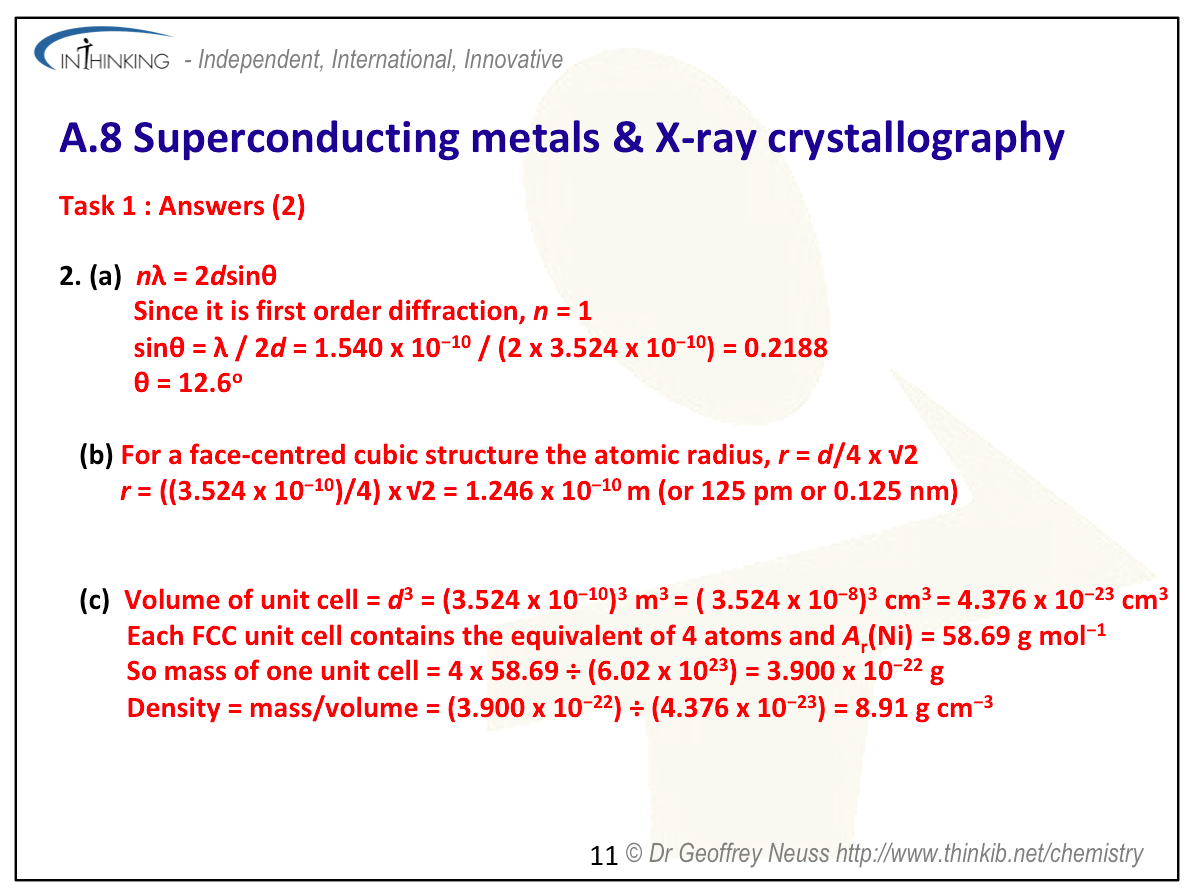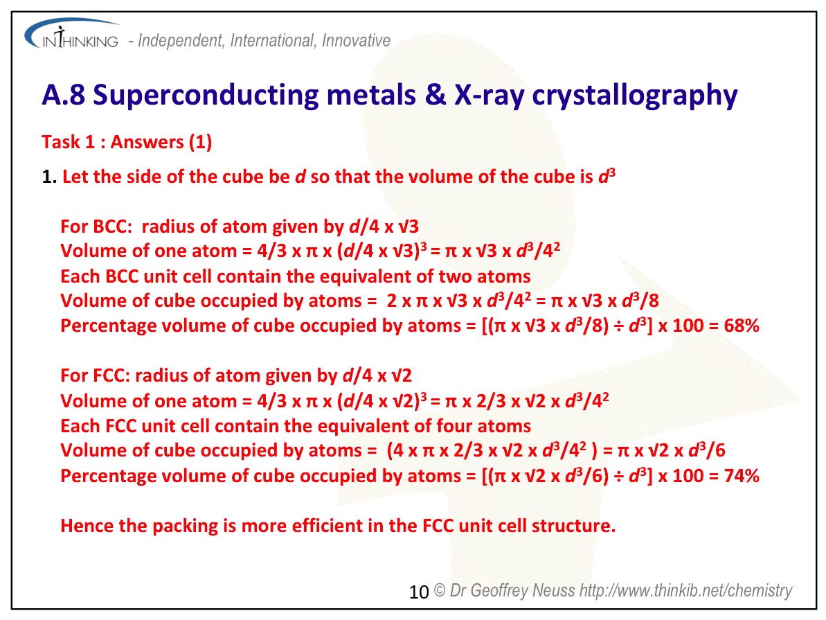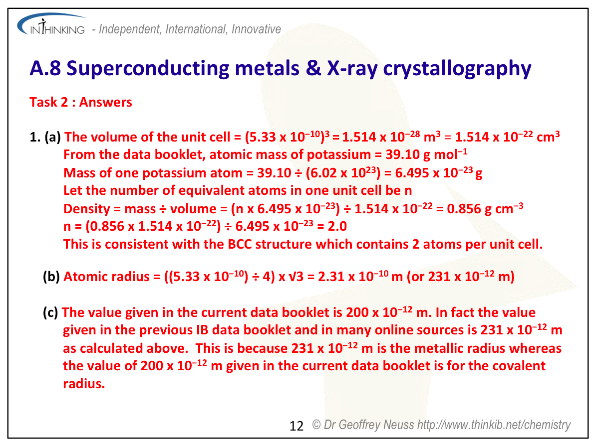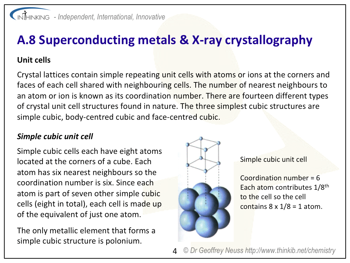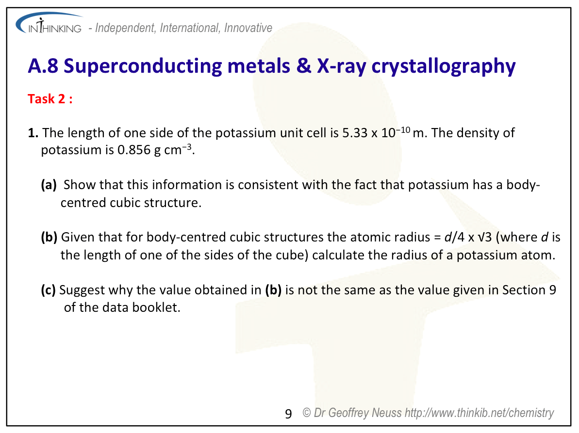 Teaching tipsThis is another sub-topic where there is considerable overlap with physics and it may be worth talking with your physics colleagues about their approach to teaching superconductivity. In a sense there are two separate topics contained within this sub-topic - superconductivity and X-ray crystallography. The syllabus coverage of superconductivity is confined pretty much to a simple account. Describe what it is and how BCS theory describes how electrons are able to flow freely in pairs through superconductors. Students will need to be familiar with the two basic shapes shown by graphs of resistance plotted against temperature for types 1 and 2 superconductors and be able to interpret them. The more difficult part of this sub-topic to teach is the use of the Bragg equation and its application to crystal structures. Because X-ray crystallography is mentioned briefly in Topic 21.1 Spectroscopic identification of organic compounds (HL) I actually introduce the Bragg equation there as it helps to explain how X-rays can be used to deduce a structure. For this sub-topic you will need to explain about unit cells and the fact that although there are eight atoms contributing to a simple cubic unit cell, the number of atoms making up the cell is only one as each atom contributes to seven other cells so only contributes 1/8th to a single unit cell etc. You will also need to explain why the coordination number changes for the different types of cubic unit cell. The Bragg equation can be used to manipulate angles of incident waves, wavelengths and the distances between atoms and then give examples for calculating the density of Group 1 or Group 2 metals once their metallic radius and unit cell type is known. Emphasise that because the radius is cubed in density calculations a small difference in radius can make a big difference to the calculated result. | Study GuidePages 107 & 119 QuestionsFor ten 'quiz' questions (for quick testing of knowledge and understanding with the answers explained) see MC test: Superconducting metals & X-ray crystallography. For short-answer questions see Superconducting metals & X-ray crystallography questions together with the worked answers on a separate page Superconducting metals & X-ray crystallography answers. Vocabulary listsuperconductor/superconductivity |