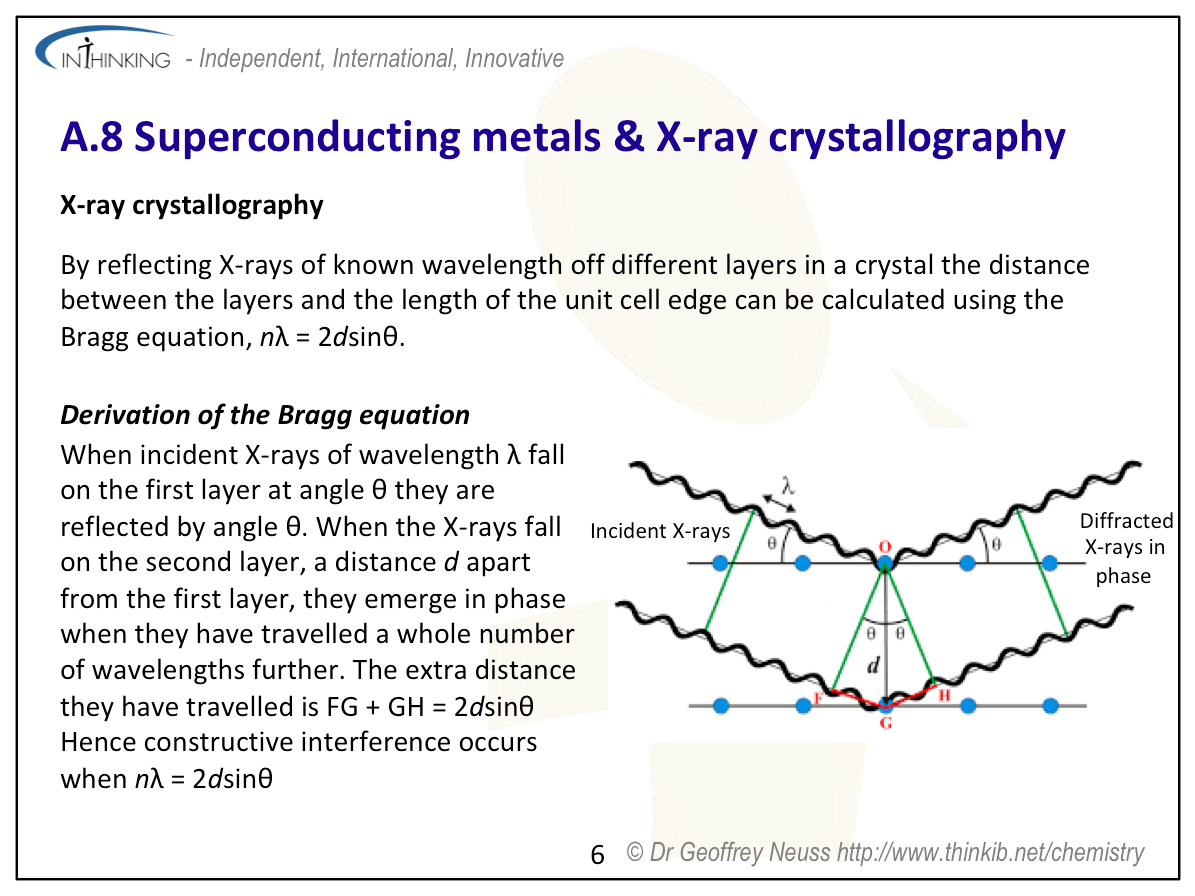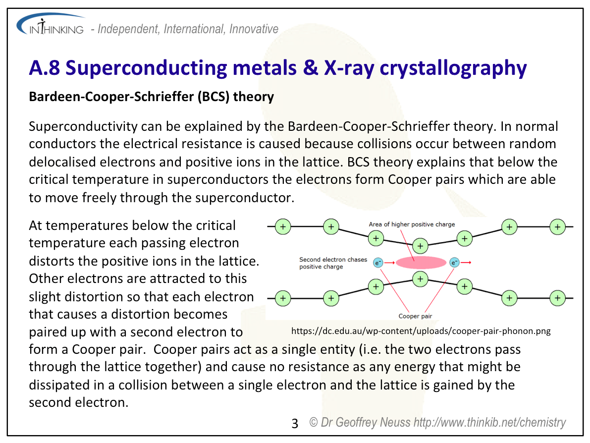 | Clarification notesOnly a simple explanation of the Bardeen-Cooper-Schrieffer (BCS) theory with Cooper pairs is needed. At low temperatures a passing electron distorts the positive ions in the lattice. A second electron is attracted to this slight positive deformation leading to a coupling of these two electrons. The operating principles of X-ray crystallography are not required. Only pure metals with simple cubic cells, body centred cubic cells (BCC) and face centred cubic cells, (FCC) should be covered. Although the perovskite crystalline structures of many superconductors can be analysed by X-ray crystallography these will not be assessed. The application of the Bragg's equation is limited to simple cubic structures. International-mindednessAdvanced analytical techniques have many applications (e.g. in forensics, mineral exploration, medicine etc.) It is worth considering how world economies are affected by unequal access to these advanced techniques. |
