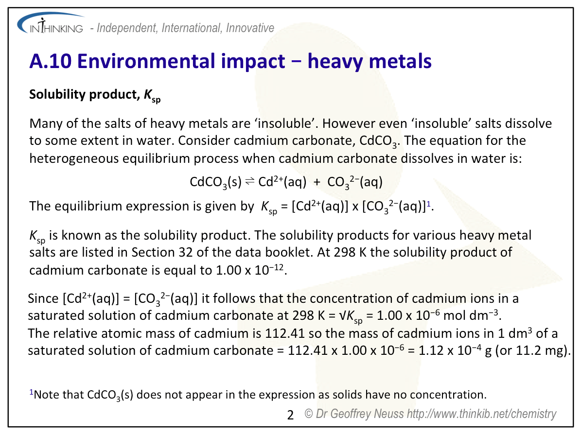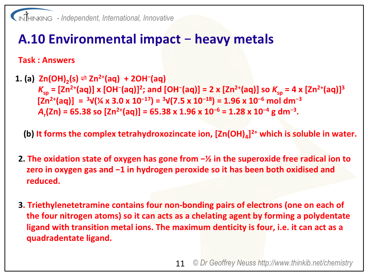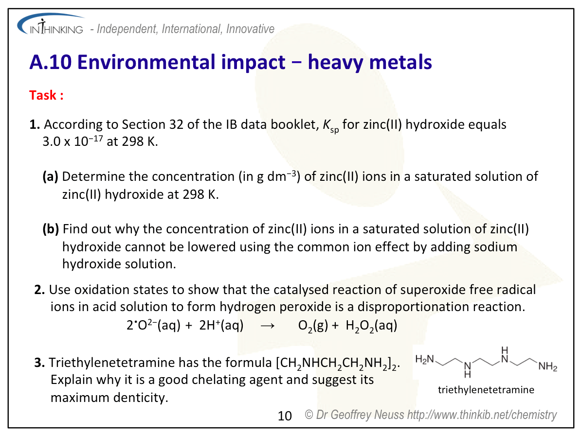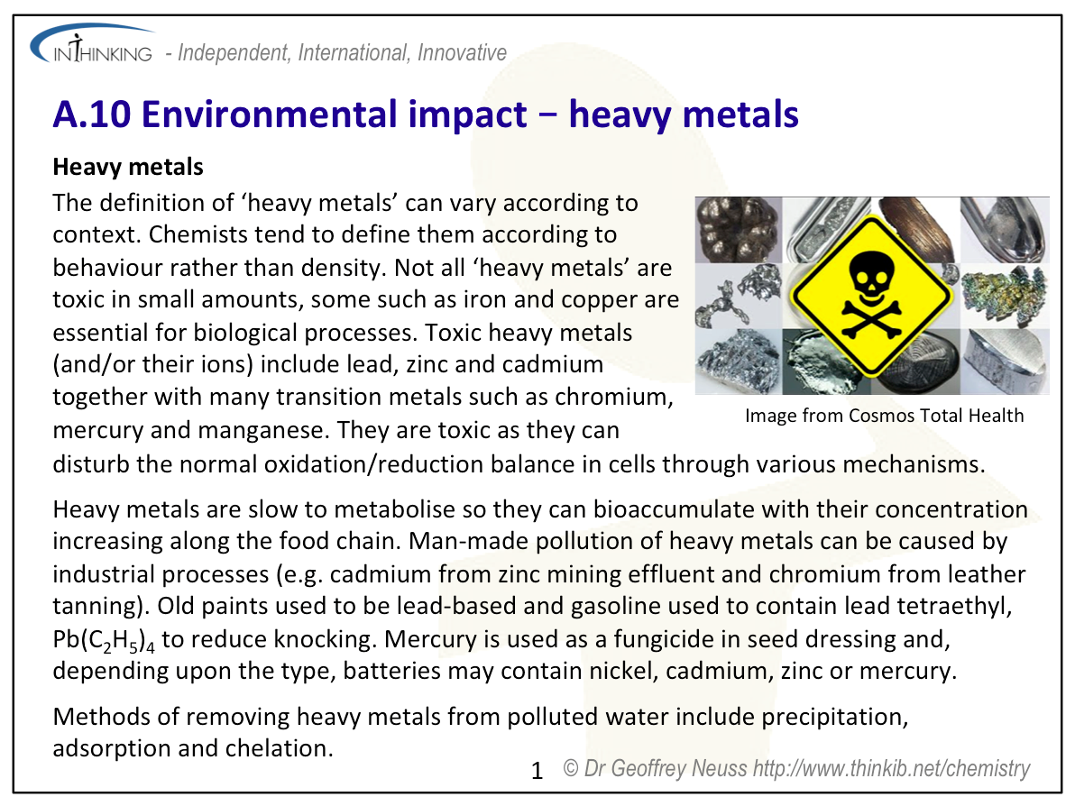 Pages 121 & 122 QuestionsFor ten 'quiz' questions (for quick testing of knowledge and understanding with the answers explained) see MC test: Environmental impact - heavy metals. For short-answer questions see Environmental impact - heavy metals questions together with the worked answers on a separate page Environmental impact - heavy metals answers. Vocabulary listchelate/chelation |