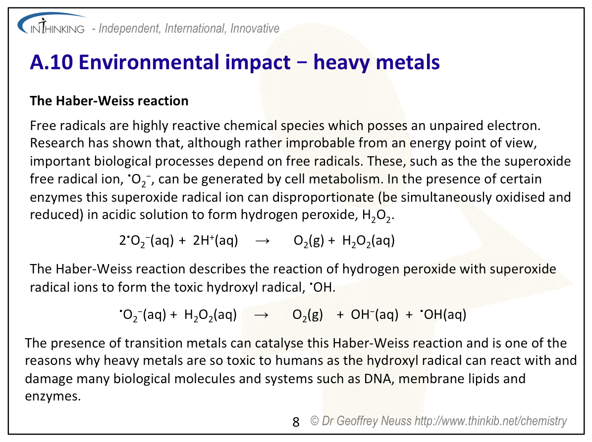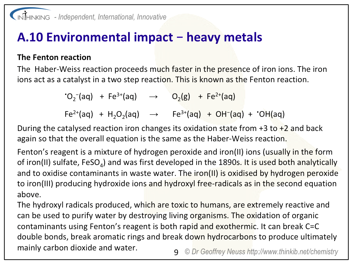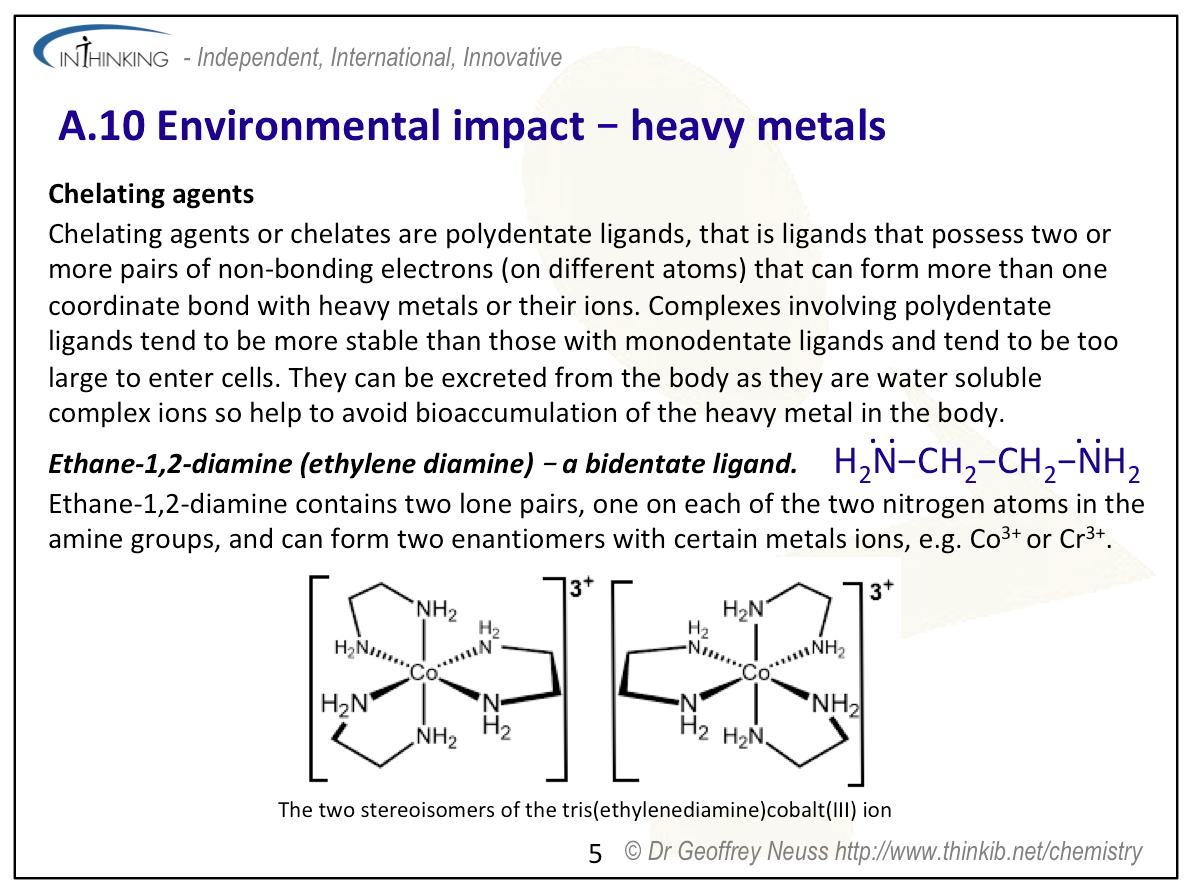 | Clarification notesConsider ethane−1,2−diamine to act as a bidentate ligand and EDTA4- to act as a hexadentate ligand. In biological processes the Haber–Weiss reaction naturally generates free radicals. Transition metals can catalyse the reaction. In the Fenton reaction the mechanism for generating reactive hydroxyl radicals involves the iron catalyst. Ksp values are given in Section 32 of the data booklet. International-mindednessConsider the responsibilities that scientists have for the global impact of their work. |
