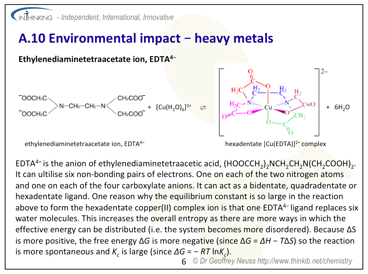 Teaching tipsThis is quite a difficult topic to teach but does provide plenty of opportunities for some interesting examination questions. Essentially you need to cover precipitation and chelation as two different ways of removing heavy metals from the environment and also mention adsorption. For precipitation you will need to cover the application of the equilibrium law to sparingly soluble (i.e. ‘insoluble’) salts. For binary salts the solubility product is equal to the product of the concentrations of the two ions at equilibrium but care needs to be taken with salts such as lead(II) hydroxide), Pb(OH)2, which form more ions in solutions (see “Pause for thought’ above). It is also worth mentioning how the common ion effect can increase the precipitation of metal ions by increasing the concentration of the anion in the saturated solution. Although it does not appear on the syllabus it might also be worth explaining how sometimes the common ion effect can lead to increased solubility due to complex ion formation. For example, zinc hydroxide redissolves in excess hydroxide ions to form [Zn(OH)4]2−(aq). Students already know how monodentate ligands use a non-bonding pair of electrons to form a coordinate bond to a transition metal ion. Explain that polydentate ligands contain more than one non-bonding pair of electrons so can have coordination numbers greater than 1. Use EDTA and ethane-1,2-diamine as examples and explain that as one ion of EDTA4− reacts with one ion of [Ni(H2O)6]2+, for example, the products are one ion of [Ni(EDTA)]2− and six molecules of water so the entropy change is positive. This means that ΔG is more negative (since ΔG = ΔH – TΔS) and the chelated complex will be stable as ΔG = −RTlnK . The Haber-Weiss reaction and the more specific Fenton reaction, which uses iron complexes to catalyse the formation of hydroxyl radicals, OH. from hydrogen peroxide and the superoxide free radical ion, O2−., need to be mentioned. The hydroxyl radical produced is very reactive and is used in various industrial processes. Adsorption can include the use of activated charcoal or clay etc. to remove heavy metal ions from polluted water. | Study guide