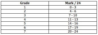Secondly it is worth considering that the mark out of 24 is converted by the IB into a grade of 1-7 as one of the components of the overall grade that the student will be awarded once the three external examinations are also taken into account. The grade boundaries are arrived at by considering the Grade descriptors which can be found on My IB. The IB publishes the grade boundaries in the Chief Examiner's report at the end of each examination session. For the raw marks out of 24 these are: