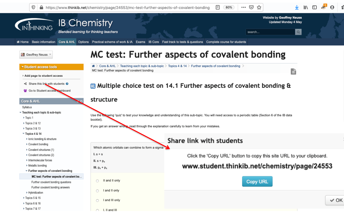 Note that since I initially wrote Steps 1 -11 for this webpage there is now a new orange button on each page containing assignments "Student Access Tools" which will directly generate a URL for the page. You can use this to share directly with students or paste into systems such as Moodle or Google classroom etc.
